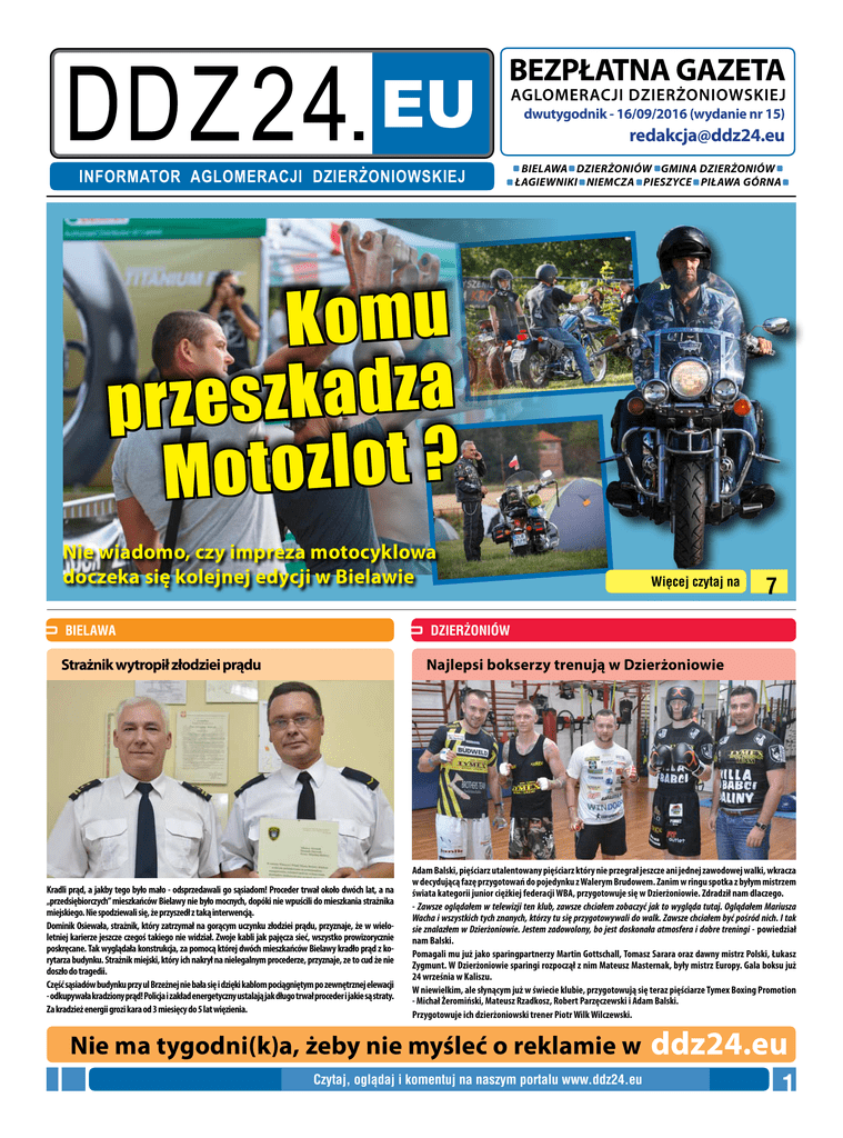dwutygodnik - 16/09/2016 (wydanie nr 15) [email protected] BIELAWA - DZIERŻONIÓW - GMINA DZIERŻONIÓW ŁAGIEWNIKI - NIEMCZA - PIESZYCE - PIŁAWA GÓRNA Komu a z d a k z s prze ? t o l z o t Mo Nie wiadomo, czy impreza motocyklowa doczeka się kolejnej edycji w Bielawie BIELAWA Więcej czytaj na 7 DZIERŻONIÓW Strażnik wytropił złodziei prądu Najlepsi bokserzy trenują w Dzierżoniowie Kradli prąd, a jakby tego było mało - odsprzedawali go sąsiadom! Proceder trwał około dwóch lat, a na „przedsiębiorczych” mieszkańców Bielawy nie było mocnych, dopóki nie wpuścili do mieszkania strażnika miejskiego. Nie spodziewali się, że przyszedł z taką interwencją. Dominik Osiewała, strażnik, który zatrzymał na gorącym uczynku złodziei prądu, przyznaje, że w wieloletniej karierze jeszcze czegoś takiego nie widział. Zwoje kabli jak pajęcza sieć, wszystko prowizorycznie poskręcane. Tak wyglądała konstrukcja, za pomocą której dwóch mieszkańców Bielawy kradło prąd z korytarza budynku. Strażnik miejski, który ich nakrył na nielegalnym procederze, przyznaje, ze to cud że nie doszło do tragedii. Część sąsiadów budynku przy ul Brzeżnej nie bała się i dzięki kablom pociągniętym po zewnętrznej elewacji - odkupywała kradziony prąd! Policja i zakład energetyczny ustalają jak długo trwał proceder i jakie są straty. Za kradzież energii grozi kara od 3 miesięcy do 5 lat więzienia. Adam Balski, pięściarz utalentowany pięściarz który nie przegrał jeszcze ani jednej zawodowej walki, wkracza w decydującą fazę przygotowań do pojedynku z Walerym Brudowem. Zanim w ringu spotka z byłym mistrzem świata kategorii junior ciężkiej federacji WBA, przygotowuje się w Dzierżoniowie. Zdradził nam dlaczego. - Zawsze oglądałem w telewizji ten klub, zawsze chciałem zobaczyć jak to wygląda tutaj. Oglądałem Mariusza Wacha i wszystkich tych znanych, którzy tu się przygotowywali do walk. Zawsze chciałem być pośród nich. I tak sie znalazłem w Dzierżoniowie. Jestem zadowolony, bo jest doskonała atmosfera i dobre treningi - powiedział nam Balski. Pomagali mu już jako sparingpartnerzy Martin Gottschall, Tomasz Sarara oraz dawny mistrz Polski, Łukasz Zygmunt. W Dzierżoniowie sparingi rozpoczął z nim Mateusz Masternak, były mistrz Europy. Gala boksu już 24 września w Kaliszu. W niewielkim, ale słynącym już w świecie klubie, przygotowują się teraz pięściarze Tymex Boxing Promotion - Michał Żeromiński, Mateusz Rzadkosz, Robert Parzęczewski i Adam Balski. Przygotowuje ich dzierżoniowski trener Piotr Wilk Wilczewski. Nie ma tygodni(k)a, żeby nie myśleć o reklamie w Czytaj, oglądaj i komentuj na naszym portalu www.ddz24.eu 1 Bielawa Konferencja podsumowująca Lokalny Program Rewitalizacji Gminy Bielawa na lata 2014 - 2020 BIELAWA SAMORZĄD W środę 7 września w sali konferencyjnej bielawskiego Art Inkubatora odbyła się konferencja podsumowująca przygotowanie Lokalnego Programu Rewitalizacji Gminy Bielawa na lata 2014 - 2020. Przy pomocy multimedialnej prezentacji, omówiono wszystkie etapy diagnozowania problemów społecznych współwystępujących z negatywnymi zjawiskami w sferach gospodarczej, środowiskowej i przestrzenno - funkcjonalnej, na podstawie których wytypowano najbardziej zdegradowane obszary w Bielawie. Najwyższe wskaźniki koncentracji negatywnych zjawisk i dużej skali potrzeb rewitalizacyjnych obejmują ulice: Brzeżną, Czerwoną, Górską, Handlową Kasztanową, Kolejową, Kopernika, Lipową, Małą, Młodych nr 20-22, Nowobielawską, Ostroszowicką nr 1-10, Piastowską, Pocztową nr 1-7, Polną, Prostą, Przodowników Pracy, Sienkiewicza, Strażacką, Tkacką, Waryńskiego, Wolności nr 1 - 87, Żeromskiego nr 1 - 39 i ul. Wysoką. W spotkaniu uczestniczyli przedstawiciele samorządu, instytucji kultury, sportu i edukacji, wspólnot mieszkaniowych, re- prezentanci organizacji pozarządowych, przedsiębiorcy oraz radni Rady Miejskiej Bielawy. Burmistrz miasta Piotr Łyżwa podziękował zespołowi ds. rewitalizacji za wielomiesięczną pracę nad projektem, podkreślając konieczność zmian, przede wszystkim w zakresie remontów wielorodzinnych budynków mieszkalnych oraz wsparcia działań prospołecznych. Przypominamy, że program rewitalizacji jest wieloletnim planem działań, między innymi w sferach społecznej i gospodarczej. „Dziesiątka” wśród najlepszych szkół „zDolnego Śląska” BIELAWA EDUKACJA Tak wynika z podsumowania konkursu „zDolny Ślązaczek”, jakiego dokonał Dolnośląski Kurator Oświaty Roman Kowalczyk na wałbrzyskiej konferencji dla dyrektorów szkół w niedzielę 28 sierpnia br. Przedstawiając dane za ubiegły rok szkolny dotyczącetego prestiżowego interdyscyplinarnego konkursu, kurator podkreślił, że Szkoła Podstawowa nr 10 z Oddziałami Sportowymi w Bielawie jako jedyna placówka spoza Wrocławia znalazła się w ścisłej czołówce (III miejsce) pod względem liczby laureatów i tym samym przełamała monopol wrocławskich szkół, które jak dotąd były niedoścignione. Dyrektor szkoły, Dariusz Spychalski przyjął słowa kuratora z ogromną satysfakcją. To dobra wiadomość na rozpoczynający się rok szkolny i wspaniała zachęta do dalszej pracy - podsumował. Laureaci niejednokrotnie przedstawiani byli na łamach „Wiadomości Bielawskich” i nie tylko, aczkolwiek bez wątpienia warto raz jeszcze przypomnieć ich nazwiska: Ryszard Chereźniak (laureat z języka polskiego i z matematyki) i Grzegorz Wanszewicz (laureat z języka angielskiego). Wymienieni uczniowie zdobyli laury w konkursie „zDolny Ślązaczek” pod kierunkiem p. Agaty Furtak (język polski), p. Joanny Baciak (matematyka) i p. Renaty Zachowskiej-Rais (język angielski). Jeszcze raz gratulujemy i życzymy zarówno uczniom, jak i nauczycielom kolejnych wspaniałych sukcesów. V Konkurs Literacki na utwór inspirowany fotografiami Bielawy Miejska Biblioteka Pub
