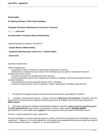 Lipa 2016 - regulamin REGULAMIN XX Ogólnopolskiego i XXXIV Wojewódzkiego Przeglądu Dziecięcej i Młodzieżowej Twórczości Literackiej „LIPA 2016” pod patronatem Prezydenta Miasta Bielska-Białej organizowanego przy wsparciu finansowym: - Urzędu Miasta w Bielsku-Białej, - Spółdzielni Mieszkaniowej „Złote Łany” w Bielsku-Białej, - Sponsorów. Założenia regulaminowe: Celem Przeglądu jest: - przygotowanie dzieci i młodzieży do aktywnego uczestnictwa w kulturze, - doskonalenie umiejętności pisania różnych form literackich poprzez udział w warsztatach literackich prowadzonych przez jurorów, - tworzenie warunków do rozwijania aktywności twórczej, - promocja laureatów (poprzez druk nagrodzonych utworów w katalogu i cykliczną prezentację tekstów w lokalnych mediach), - zainteresowanie dorosłych ekspresją literacką dzieci i młodzieży, - wykazanie zasady równych szans (uczestnicy z małych miejscowości i ośrodków wojewódzkich). 1. Uczestnikami Przeglądu mogą być uczniowie szkół podstawowych, gimnazjalnych i średnich. 2. Tematyka i rodzaj literacki utworów – dowolne. Ilość prac ograniczona do 6 tekstów. W wypadku utworów prozatorskich lub dramatycznych objętość przesyłki ograniczona do 5 stron znormalizowanego maszynopisu ( 9000 znaków). 3. Warunkiem udziału jest nadesłanie samodzielnie napisanych utworów (nigdzie wcześniej niepublikowanych) w trzech egzemplarzach (prace pisane na komputerze). Utwory należy opatrzyć słownym godłem (pseudonimem); to samo godło należy wpisać do karty zgłoszenia, która jest jedyną informacją o autorze. Prosimy o czytelne wypełnianie karty i załączników. Do utworu pełnoletni uczestnicy dołączają zgodę na udział w konkursie oraz przetwarzanie i publikację ich danych osobowych - Załącznik nr 2 do karty zgłoszenia. W przypadku osób niepełnoletnich powyższą zgodę wyrażają ich rodzice (opiekunowie prawni) - Załącznik nr 1 do karty zgłoszenia. 1/2 Lipa 2016 - regulamin 4. Termin nadsyłania prac wraz z kartami uczestnika upływa 20 czerwca 2016 r. Decyduje data stempla pocztowego – po tym terminie prace nie będą przyjmowane. 5. Prace należy przesłać na adres: Spółdzielcze Centrum Kultury "Best" przy Spółdzielni Mieszkaniowej "Złote Łany"; 43-300 Bielsko-Biała, ul. Jutrzenki 22 z dopiskiem Lipa 2016. 6. Jury Przeglądu dokona oceny nadesłanych utworów przyznając laureatom sto równorzędnych nagród regulaminowych. Jurorzy nie przyznają autorom poszczególnych miejsc (1, 2, 3 itd.), ale wybierają po jednym utworze stu najlepszych autorów do katalogu – głównej nagrody. 7. Laureaci zostaną powiadomieni listownie o wynikach obrad jury i terminie spotkania finalistów. 8. Ogłoszenie wyników, wręczenie nagród i publiczna prezentacja nagrodzonych utworów połączone będą z warsztatami literackimi prowadzonymi przez jurorów na podsumowaniu przeglądu 21 października 2016. W tym roku dodatkową atrakcją będzie koncert poezji laureatów wybranych z ostatnich 20 lat. 9. Organizator – Spółdzielnia Mieszkaniowa „Złote Łany” w Bielsku-Białej – zastrzega sobie prawo nieodpłatnych publikacji w prasie w celach reklamowych Przeglądu oraz informuje, że nadsyłane prace nie będą zwracane. 10. Wszelkie kwestie sporne mogące powstać na tle niniejszego regulaminu w sposób ostateczny rozsądza Jury Przeglądu działające w imieniu organizatorów. 11. Szczegółowych informacji udziela organizator (p. Irena Edelman) pod numerem (33) 499 08 33 od poniedziałku do piątku w godzinach 10.00–17.00. Pytania można również kierować pod adresem e-mailowym: [email protected]. Regulamin, karta zgłoszenia z załącznikami oraz dodatkowe informacje dostępne na stronie www.sckbest.pl ZAPRASZAMY! 2/2