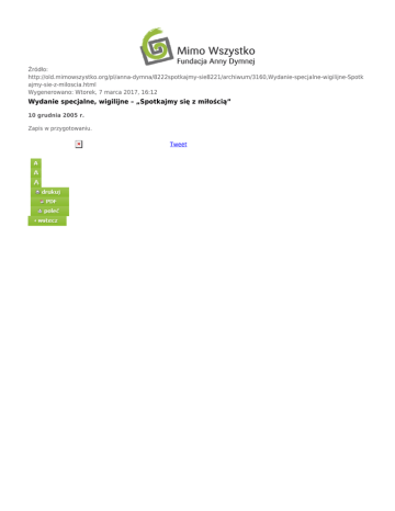 Źródło: http://old.mimowszystko.org/pl/anna-dymna/8222spotkajmy-sie8221/archiwum/3160,Wydanie-specjalne-wigilijne-Spotk ajmy-sie-z-miloscia.html Wygenerowano: Wtorek, 7 marca 2017, 16:12 Wydanie specjalne, wigilijne – „Spotkajmy się z miłością” 10 grudnia 2005 r. Zapis w przygotowaniu. Tweet
