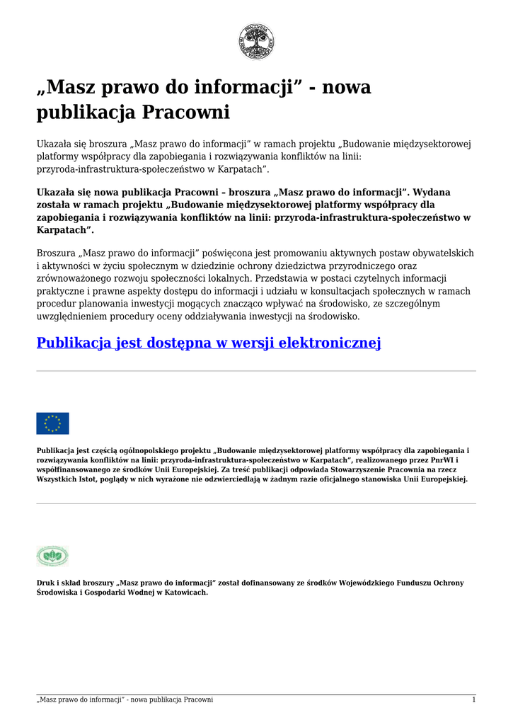 „Masz prawo do informacji” - nowa publikacja Pracowni Ukazała się broszura „Masz prawo do informacji” w ramach projektu „Budowanie międzysektorowej platformy współpracy dla zapobiegania i rozwiązywania konfliktów na linii: przyroda-infrastruktura-społeczeństwo w Karpatach”. Ukazała się nowa publikacja Pracowni – broszura „Masz prawo do informacji”. Wydana została w ramach projektu „Budowanie międzysektorowej platformy współpracy dla zapobiegania i rozwiązywania konfliktów na linii: przyroda-infrastruktura-społeczeństwo w Karpatach”. Broszura „Masz prawo do informacji” poświęcona jest promowaniu aktywnych postaw obywatelskich i aktywności w życiu społecznym w dziedzinie ochrony dziedzictwa przyrodniczego oraz zrównoważonego rozwoju społeczności lokalnych. Przedstawia w postaci czytelnych informacji praktyczne i prawne aspekty dostępu do informacji i udziału w konsultacjach społecznych w ramach procedur planowania inwestycji mogących znacząco wpływać na środowisko, ze szczególnym uwzględnieniem procedury oceny oddziaływania inwestycji na środowisko. Publikacja jest dostępna w wersji elektronicznej Publikacja jest częścią ogólnopolskiego projektu „Budowanie międzysektorowej platformy współpracy dla zapobiegania i rozwiązywania konfliktów na linii: przyroda-infrastruktura-społeczeństwo w Karpatach”, realizowanego przez PnrWI i współfinansowanego ze środków Unii Europejskiej. Za treść publikacji odpowiada Stowarzyszenie Pracownia na rzecz Wszystkich Istot, poglądy w nich wyrażone nie odzwierciedlają w żadnym razie oficjalnego stanowiska Unii Europejskiej. Druk i skład broszury „Masz prawo do informacji” został dofinansowany ze środków Wojewódzkiego Funduszu Ochrony Środowiska i Gospodarki Wodnej w Katowicach. „Masz prawo do informacji” - nowa publikacja Pracowni 1