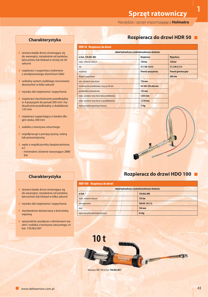 Sprzęt ratowniczy 1 Narzędzia i sprzęt wspomagający Holmatro Rozpieracz do drzwi HDR 50 Charakterystyka HDR 50 Rozpieracz do drzwi otwiera każde drzwi otwierające się do wewnątrz, niezależnie od zamków, łańcuchów lub blokad w mniej niż 30 sekund układ hydrauliczny o jednokierunkowym działaniu nr kat. 150.061.002 Rozpieracz Wypychacz maks. ciśnienie robocze 720 bar 720 bar siła 47.5 kN (4.8 t) 51.2 kN (5.2 t) rozpieracz i wypychacz wykonane z anodyzowanego aluminium lekki rozpieracz Powrót sprężynowy unikalny system szybkiego mocowania akcesoriów w kilka sekund min. szerokość ramy drzwi 710 mm mechanicznie przedłużalny 4 razy po 50 mm 50-100-150-200 mm wysoka siła rozpierania i wypychania przedłużalny hydraulicznie 125 mm maks. szerokość ramy drzwi (bez przedłużenia) 1.035 mm maks. szerokość ramy drzwi (z przedłużeniem) 1.310 mm ciężar narzędzia gotowego do pracy 11 kg rozpieracz mechanicznie przedłużalny w 4 pozycjach do ponad 200 mm i hydraulicznie przedłużalny o dodatkowe 125 mm długość wypychania Powrót grawitacyjny 300 mm rozpieracz wypychający o bardzo długim skoku 300 mm walizka z tworzywa sztucznego współpracuje z pompą ręczną, nożną lub pneumatyczną węże o współczynniku bezpieczeństwa 4:1 – minimalne ciśnienie rozrywające 2880 bar Rozpieracz do drzwi HDO 100 Charakterystyka HDO 100 Rozpieracz do drzwi układ hydrauliczny o jednokierunkowym działaniu otwiera każde drzwi otwierające się do wewnątrz, niezależnie od zamków, łańcuchów lub blokad w kilka sekund nr kat. * 150.062.008 maks. ciśnienie robocze 720 bar wysoka siła rozpierania i wypychania siła rozpierania 100 kN (10.2 t) skok 130 mm ciężar narzędzia gotowego do pracy 6.6 kg standardowo dostarczany z końcówką wężową opcjonalnie: przyłącze z obrotowym wężem i walizka z tworzywa sztucznego, nr kat. 150.062.007 10 t Wyważacz HDO 100 (nr kat. 150.062.007) www.deltaservice.com.pl 43