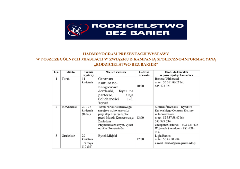 HARMONOGRAM PREZENTACJI WYSTAWY W POSZCZEGÓLNYCH MIASTACH W ZWIĄZKU Z KAMPANIĄ SPOŁECZNO-INFORMACYJNĄ ,,RODZICIELSTWO BEZ BARIER” L.p. Miasto Termin wystawy Miejsce wystawy Godzina otwarcia Osoba do kontaktu w poszczególnych miastach 1 Toruń 11 kwietnia Centrum Kulturalno10:00 Kongresowe Jordanki, foyer na parterze, Aleja Solidarności 1-3, Toruń Bartosz Witkowski – nr tel. 56 611 86 27 lub 695 723 321 2 Inowrocław 20 - 27 kwietnia (8 dni) Teren Parku Solankowego (miejsce wokół trawnika przy alejce łączącej plac przed Muszlą Koncertową z 13:00 Zakładem Przyrodoleczniczym, wjazd od Alei Powstańców 3 Grudziądz 29 kwietnia – 9 maja (10 dni) Rynek Miejski Monika Śliwińska – Dyrektor Kujawskiego Centrum Kultury w Inowrocławiu nr tel. 52 357 58 67 lub 533 999 534 Grzegorz Gąsiorek - 602-731-438 Wojciech Steindbor – 883-421914 Ligia Bartos nr tel. 56 45 10 284 e-mail [email protected] 12:00 4 5 6 7 Ciechocinek Włocławek Bydgoszcz Toruń 11 - 20 maja (10 dni) Plac przy Miejskim Centrum Kultury w Ciechocinku ul. Żelazna 5 24 maja – 2 czerwca (10 dni) Centrum Kultury ,,Browar B” ul. Łęgska 28 we Włocławku Stary Rynek 3–9 czerwca (6 dni) 10 – 17 czerwca (8) 12:00 14:00 10:00 Aleja Solidarności przy Muzeum Etnograficznym 11:00 Jerzy Szymański nr tel. 54 416 18 00 e-mail [email protected] Agnieszka ZgłobickaSkupniewicz nr tel. 54 414 44 65 e-mail [email protected] Joanna Breczko nr tel. 52 58 58 728 e-mail [email protected] Bartosz Witkowski – nr tel. 56 611 86 27 lub 695 723 321 Dodatkowo wystawę można było oglądać 21 maja 2016r. o godz. 17.00 w Auli UMK w Toruniu podczas koncertu z okazji Dnia Mamy. Osoba do kontaktu: Maria Dreszer, nr tel. 602 766 062 lub 56 656 10 32, Julita Sandecka nr tel. 514 456 511