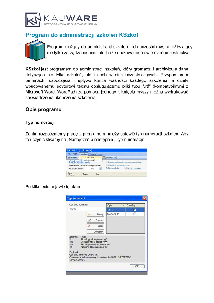 Program do administracji szkoleń KSzkol Program służący do administracji szkoleń i ich uczestników, umożliwiający nie tylko zarządzanie nimi, ale także drukowanie potwierdzeń uczestnictwa. KSzkol jest programem do administracji szkoleń, który gromadzi i archiwizuje dane dotyczące nie tylko szkoleń, ale i osób w nich uczestniczących. Przypomina o terminach rozpoczęcia i upływu końca ważności każdego szkolenia, a dzięki wbudowanemu edytorowi tekstu obsługującemu pliki typu ".rtf" (kompatybilnymi z Microsoft Word, WordPad) za pomocą jednego kliknięcia myszy można wydrukować zaświadczenia ukończenia szkolenia. Opis programu Typ numeracji Zanim rozpoczniemy pracę z programem należy ustawić typ numeracji szkoleń. Aby to uczynić klikamy na „Narzędzia” a następnie „Typ numeracji”. Po kliknięciu pojawi się okno: Należy uzupełnić opis typu numeracji w zależności od preferencji. Przykładowo wpisując: • %d/%m/%R otrzymamy np. 21/08/2010 • %m/%r otrzymamy np. 06/10 Dodatkowo można wpisywać litery charakteryzujące dane szkolenie. Przykładowo: • %d/%m/%r/BHP otrzymamy np. 23/07/2011/BPH Ważne jest aby między kolejnymi zmiennymi umieszczać znak „/”. Po wpisaniu typu numeracji klikamy na „Dodaj”. Klikając na „Domyślny” program będzie sugerował wybraną numerację przy dodawaniu nowego szkolenia. WAŻNE W przypadku pomyłki nie trzeba kasować całej pozycji. Wystarczy wpisać poprawne informacje, zaznaczyć po prawej stronie, którą pozycję chcemy poprawić, a następnie kliknąć na „Popraw”. Edytor świadectw Przechodzimy do edytora świadectw, które przypiszemy do różnego rodzaju szkoleń. Klikamy na „Edytor”, znajdujące się w drugiej linijce od góry. Klikając na poszczególne części świadectwa można je dowolnie modyfikować poczynając od loga firmy, a kończąc na tekście świadectwa. Zmienne w edytorze dokładnie opisane są w „Help”. Po modyfikacjach klikamy na „Zapisz” (niebieska dyskietka) oraz uzupełniamy nazwę świadectwa. Rodzaje szkoleń Uzupełniamy rodzaje szkoleń. Aby to uczynić klikamy na „Narzędzia”, a następnie „Rodzaje szkoleń”. Wybieramy z listy „Typ numeracji szkolenia” oraz „Domyślny typ numeracji osób”. Jeśli potrzebny typ numeracji nie został wcześniej zdefiniowany możemy to uczynić klikając na plusik obok odpowiedniego okna. Uzupełniamy „Minimalną liczbę dni” szkolenia, jego okres ważności i język wystawianych świadectw. Następnie wpisujemy „Nazwę typu szkolenia”, „Nazwę szkolenia” oraz „Domyślne świadectwo do druku”. Po uzupełnieniu wszystkich danych klikamy na „Dodaj”. W przypadku pomyłki wystarczy wpisać poprawne informacje, zaznaczyć poniżej, którą pozycję chcemy poprawić, a następnie kliknąć na „Popraw”. Szkolenia Przechodzimy do zakładki „Szkolenia”. Klikamy na „Dodaj nowe szkolenie”: Uzupełniamy okno: Wybieramy z listy wcześniej zdefiniowany rodzaj szkolenia oraz typ numeracji. Następnie klikamy na „Dodaj nową firmę” i uzupełniamy wszystkie niezbędne informacje. Po uzupełnieniu klikamy na „Zapisz”. Następnie w „Szukaj firmy” wpisujemy trzy pierwsze litery interesującej nas firmy oraz klikamy na nią na rozwiniętej liście. Wybieramy „Datę rozpoczęcia szkolenia”, „Datę końca szkolenia” oraz „Liczbę dni”. (Uwaga! Liczba dni między datą rozpoczęcia, a datą końca nie musi być taka sama jak liczba dni szkolenia. Zdarza się, że szkolenie odbywa się w piątek i poniedziałek – liczba dni szkolenia wynosi wtedy 2, a liczba dni między początkiem, a końcem 4). Wybierając tylko „Datę rozpoczęcia szkolenia” oraz „Liczbę dni” program automatycznie zmieni „Datę końca szkolenia”. Następnie wybieramy „Datę wystawienia świadectw” oraz ich ważność. Ważność można zmieniać bezpośrednio na rozwijanym kalendarzu jak również poprzez zmianę „Lat”. Aby dodać kursanta do wybranego powyżej szkolenia klikamy na „Przydziel kursanta do szkolenia” na dole strony. Po kliknięciu pojawi się okno: Uzupełniamy wszystkie dane osobowe w zakładce „Główne” oraz „Pozostałe”. Jeśli kursant był wcześniej zdefiniowany wystarczy wpisać trzy pierwsze litery nazwiska i wybrać z listy interesującą osobę. Firmę możemy wpisać bezpośrednio w rubryce „Firma” lub wybrać już wcześniej zdefiniowaną z listy. Rozwijając listę województw i wpisując początkowe litery województwa program automatycznie podpowie pasujące elementy. Po uzupełnieniu wszystkich danych klikamy na „Zapisz i wyjdź” jeśli chcieliśmy dodać tylko tego kursanta lub „Zapisz i dodaj nowego” jeśli chcemy dodać więcej kursantów. Firmy Dodawać, edytować oraz usuwać firmy oraz ich dane można w panelu „Firmy”. Moduł firm posiada filtr firm, który jest bardzo przydatny przy dużej liczbie szkolonych firm. Klienci Dodawanie, edytowanie oraz usuwanie danych klientów uczestniczących w szkoleniu jest możliwe w panelu „Klienci”. Moduł klientów posiada filtr nazwisk, który jest bardzo przydatny przy dużej liczbie osób. Statystyki W „Statystykach” mamy podgląd przeprowadzonych szkoleń przeszkolonych osób w zależności od wskazanego roku oraz firmy. KajWare Oddział Kraków Ul. Zbożowa 3 [email protected] tel. 12 333 78 78 oraz liczby