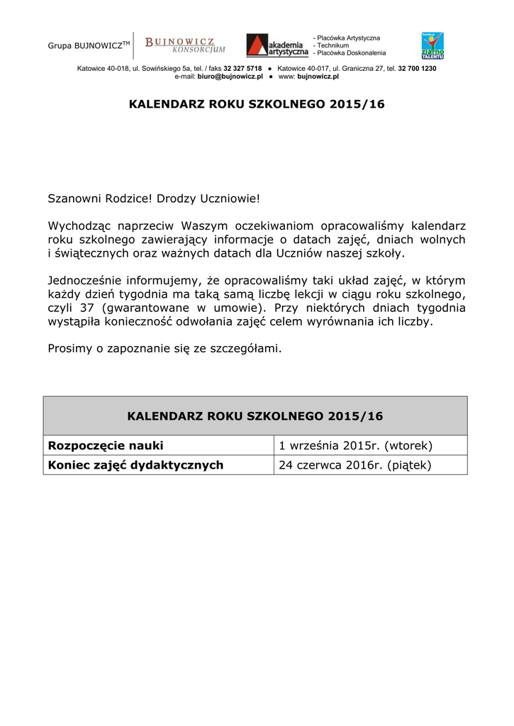 - Placówka Artystyczna - Technikum - Placówka Doskonalenia Grupa BUJNOWICZTM Katowice 40-018, ul. Sowińskiego 5a, tel. / faks 32 327 5718 ● Katowice 40-017, ul. Graniczna 27, tel. 32 700 1230 e-mail: [email protected] ● www: bujnowicz.pl KALENDARZ ROKU SZKOLNEGO 2015/16 Szanowni Rodzice! Drodzy Uczniowie! Wychodząc naprzeciw Waszym oczekiwaniom opracowaliśmy kalendarz roku szkolnego zawierający informacje o datach zajęć, dniach wolnych i świątecznych oraz ważnych datach dla Uczniów naszej szkoły. Jednocześnie informujemy, że opracowaliśmy taki układ zajęć, w którym każdy dzień tygodnia ma taką samą liczbę lekcji w ciągu roku szkolnego, czyli 37 (gwarantowane w umowie). Przy niektórych dniach tygodnia wystąpiła konieczność odwołania zajęć celem wyrównania ich liczby. Prosimy o zapoznanie się ze szczegółami. KALENDARZ ROKU SZKOLNEGO 2015/16 Rozpoczęcie nauki 1 września 2015r. (wtorek) Koniec zajęć dydaktycznych 24 czerwca 2016r. (piątek) - Placówka Artystyczna - Technikum - Placówka Doskonalenia Grupa BUJNOWICZTM DNI WOLNE OD ZAJĘĆ DYDAKTYCZNYCH W ROKU SZKOLNYM 2015/16 1 listopada 2015r. niedziela Święto Odzyskania Niepodległości 11 listopada 2015r. środa Zimowa przerwa świąteczna 24-31 grudnia 2015r. czw-czw Nowy Rok 1 stycznia 2016 r. piątek Dzień wolny (wyrównanie dni w RS) 4 stycznia 2016 r. poniedziałek Dzień wolny (wyrównanie dni w RS) 5 stycznia 2016 r. wtorek Święto Objawienia Pańskiego 6 stycznia 2016 r. środa Ferie zimowe 15-28 lutego 2016 r. pon-pt Wiosenna przerwa świąteczna 24–29 marca 2016 r. czw-wt Święto Pracy 1 maja 2016 r. niedziela Święto Konstytucji 3 maja 3 maja 2016 r. wtorek Boże Ciało 26 maja 2016 r. czwartek Dzień wolny (wyrównanie dni w RS) 27 maja 2016 r. piątek FESTIWAL / KONECRT NAUCZYCIELI 1 czerwca 2016 r. środa KONCERTY, WYDARZENIA W ROKU SZKOLNYM 2015/16 Koncert inaugurujący RS 12 września 2015r. r. sobota Wywiadówki z rodzicami październik 2015r. ustalane ind. Koncerty semestralne 19 grudnia 2015r. sobota Bal Karnawałowy dla NWKD, SIM 16 stycznia 2016r. sobota Konkurs „Kolędowy talent” 4/5 stycznia 2016r. pon/wt Konkurs na kompozycję maj 2016 r. do ustalenia TPUM maj/czerwiec 2016r. sobota 21 maja 2016 r. sobota (Testy Podstawowych Umiejętności Muz.) Koncerty semestralne i Piknik Plik: „2015.15_KalendarzRS!” strona 2 z 3 Autor: Marcin Bujnowicz, dn. 2015-10-01 © 1997-2015 Grupa BUJNOWICZTM. Wszelkie prawa zastrzeżone. Materiał ten jest ograniczony prawami autorskimi oraz innymi prawami i nie może być kopiowany, publikowany i rozprowadzany w żadnej formie. Święto Wszystkich Świętych - Placówka Artystyczna - Technikum - Placówka Doskonalenia Grupa BUJNOWICZTM Katowice 40-018, ul. Sowińskiego 5a, tel. / faks 32 327 5718 ● Katowice 40-017, ul. Graniczna 27, tel. 32 700 1230 e-mail: [email protected] ● www: bujnowicz.pl DNI, W KTÓRYCH ODBYWAJĄ SIĘ ZAJĘCIA W ROKU SZKOLNYM 2015/16 wrzesień PON (37) WT (37) ŚR (37) CZW (37) PT (37) październik listopad grudzień styczeń luty marzec kwiecień maj czerwiec 7,14,21,28 5,12,19,26 2,9,16,23,30 7,14,21 11,18,25 1,8,29 7,14,21 4,11,18,25 2,9,16,23,30 6,13,20 1,8,15,22,29 6, 13,20,27 3,10,17,24 1,8,15,22 12,19,26 2,9 1,8,15,22 5,12,19,26 10,17,24,31 7,14,21 2,9,16,23,30 7,14,21,28 4, 18, 25 2,9,16,23 13,20,27 3,10 2,9,16,23,30 6,13,20,27 4,11,18,25 8,15,22 3,10,17,24 1,8,15,22,29 5,12,19,26 3,10,17 7,14,21,28 4,11 3,10,17,31 7,14,21,28 5,12,19 2,9,16,23 4,11,18,25 2,9,16,23,30 6,13,20,27 4,11,18 8,15,22,29 5,12 4,11,18 1,8,15,22,29 6,13,20 3,10,17,24 W ciągu roku szkolnego gwarantujemy 37 zajęć.