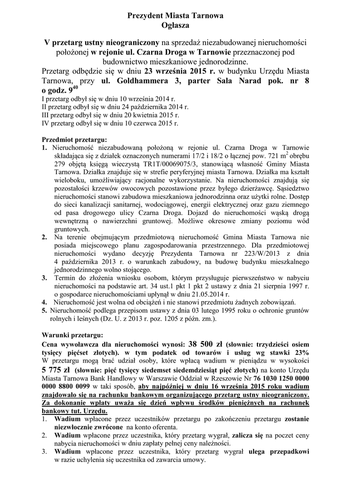 Prezydent Miasta Tarnowa Ogłasza V przetarg ustny nieograniczony na sprzedaż niezabudowanej nieruchomości położonej w rejonie ul. Czarna Droga w Tarnowie przeznaczonej pod budownictwo mieszkaniowe jednorodzinne. Przetarg odbędzie się w dniu 23 września 2015 r. w budynku Urzędu Miasta Tarnowa, przy ul. Goldhammera 3, parter Sala Narad pok. nr 8 o godz. 940 I przetarg odbył się w dniu 10 września 2014 r. II przetarg odbył się w dniu 24 października 2014 r. III przetarg odbył się w dniu 20 kwietnia 2015 r. IV przetarg odbył się w dniu 10 czerwca 2015 r. Przedmiot przetargu: 1. Nieruchomość niezabudowaną położoną w rejonie ul. Czarna Droga w Tarnowie składająca się z działek oznaczonych numerami 17/2 i 18/2 o łącznej pow. 721 m2 obrębu 279 objętą księgą wieczystą TR1T/00069075/3, stanowiącą własność Gminy Miasta Tarnowa. Działka znajduje się w strefie peryferyjnej miasta Tarnowa. Działka ma kształt wieloboku, umożliwiający racjonalne wykorzystanie. Na nieruchomości znajdują się pozostałości krzewów owocowych pozostawione przez byłego dzierżawcę. Sąsiedztwo nieruchomości stanowi zabudowa mieszkaniowa jednorodzinna oraz użytki rolne. Dostęp do sieci kanalizacji sanitarnej, wodociągowej, energii elektrycznej oraz gazu ziemnego od pasa drogowego ulicy Czarna Droga. Dojazd do nieruchomości wąską drogą wewnętrzną o nawierzchni gruntowej. Możliwe okresowe zmiany poziomu wód gruntowych. 2. Na terenie obejmującym przedmiotową nieruchomość Gmina Miasta Tarnowa nie posiada miejscowego planu zagospodarowania przestrzennego. Dla przedmiotowej nieruchomości wydano decyzję Prezydenta Tarnowa nr 223/W/2013 z dnia 4 października 2013 r. o warunkach zabudowy, na budowę budynku mieszkalnego jednorodzinnego wolno stojącego. 3. Termin do złożenia wniosku osobom, którym przysługuje pierwszeństwo w nabyciu nieruchomości na podstawie art. 34 ust.1 pkt 1 pkt 2 ustawy z dnia 21 sierpnia 1997 r. o gospodarce nieruchomościami upłynął w dniu 21.05.2014 r. 4. Nieruchomość jest wolna od obciążeń i nie stanowi przedmiotu żadnych zobowiązań. 5. Nieruchomość podlega przepisom ustawy z dnia 03 lutego 1995 roku o ochronie gruntów rolnych i leśnych (Dz. U. z 2013 r. poz. 1205 z późn. zm.). Warunki przetargu: Cena wywoławcza dla nieruchomości wynosi: 38 500 zł (słownie: trzydzieści osiem tysięcy pięćset złotych). w tym podatek od towarów i usług wg stawki 23% W przetargu mogą brać udział osoby, które wpłacą wadium w pieniądzu w wysokości 5 775 zł (słownie: pięć tysięcy siedemset siedemdziesiąt pięć złotych) na konto Urzędu Miasta Tarnowa Bank Handlowy w Warszawie Oddział w Rzeszowie Nr 76 1030 1250 0000 0000 8800 0099 w taki sposób, aby najpóźniej w dniu 16 września 2015 roku wadium znajdowało się na rachunku bankowym organizującego przetarg ustny nieograniczony. Za dokonanie wpłaty uważa się dzień wpływu środków pieniężnych na rachunek bankowy tut. Urzędu. 1. Wadium wpłacone przez uczestników przetargu po zakończeniu przetargu zostanie niezwłocznie zwrócone na konto oferenta. 2. Wadium wpłacone przez uczestnika, który przetarg wygrał, zalicza się na poczet ceny nabycia nieruchomości w dniu zapłaty pełnej ceny należności. 3. Wadium wpłacone przez uczestnika, który przetarg wygrał ulega przepadkowi w razie uchylenia się uczestnika od zawarcia umowy. 4. Minimalne postąpienie wynosi 1 % ceny wywoławczej z zaokrągleniem wzwyż do pełnych dziesiątek złotych tj. kwotę 390 zł. 5. Przetarg będzie ważny bez względu na liczbę uczestników przetargu, a rozstrzygnięcie jego pozytywne, jeżeli przynajmniej jeden uczestnik zaoferuje co najmniej jedno postąpienie powyżej ceny wywoławczej. 6. Cena nieruchomości uzyskana w przetargu podlega zapłacie przez kupującego w taki sposób, aby najpóźniej na dzień przed zawarciem umowy notarialnej znajdowały się na rachunku bankowym organizującego przetarg ustny nieograniczony. 7. Przetarg ustny ma na celu uzyskanie najwyższej ceny. 8. W przypadku przystąpienia do przetargu przez jednego z małżonków konieczne jest przedłożenie pisemnego wyrażenia zgody współmałżonka na przystąpienie do przetargu lub umowy o rozdzielności majątkowej współmałżonków. 9. Jeżeli uczestnikiem przetargu jest osoba fizyczna powinna przedłożyć komisji przetargowej dowód osobisty. 10. Jeżeli uczestnikiem jest osoba podlegająca wpisowi do właściwego rejestru, osoba upoważniona do jej reprezentowania powinna przedłożyć do wglądu aktualny wypis z właściwego rejestru, umowę spółki, uchwałę odpowiedniego organu osoby prawnej zezwalającej na nabycie nieruchomości. Za aktualny wypis z właściwego rejestru uważa się dokument wydany w okresie trzech miesięcy poprzedzających dzień przetargu. 11. Cudzoziemiec chcąc wziąć udział w przetargu winien spełnić wymogi określone w ustawie z dnia 24 marca 1920 r. o nabywaniu nieruchomości przez cudzoziemców. 12. Prezydent Miasta Tarnowa wnosi, aby osoby przystępujące do przetargu przedłożyły w Wydziale Geodezji i Nieruchomości Urzędu Miasta Tarnowa ul. Nowa 3 pok. 204 najpóźniej w terminie do dnia 22 września 2015 roku właściwe pełnomocnictwa a w przypadku osób prawnych aktualny wypis z właściwego rejestru. 13. Nabywca nieruchomości zobowiązany jest uzyskać na własny koszt i dostarczyć do wybranej kancelarii notarialnej komplet dokumentów niezbędnych do sporządzenia aktu notarialnego tj. wypisy z rejestru gruntów oraz wyrys z mapy ewidencyjnej. 14. Opłaty notarialne i sądowe związane z zawarciem umowy sprzedaży w formie aktu notarialnego oraz przeprowadzenie postępowania wieczystoksięgowego w całości ponosi nabywca nieruchomości. 15. Prezydent Miasta Tarnowa zastrzega sobie prawo odwołania przetargu z ważnych powodów. 16. Wyłącza się odpowiedzialność Gminy Miasta Tarnowa za wady ukryte nieruchomości wystawionej 