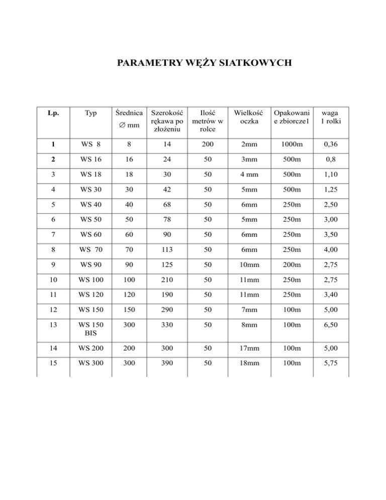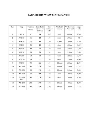 PARAMETRY WĘŻY SIATKOWYCH Lp. Typ Średnica ∅ mm Szerokość rękawa po złożeniu Ilość metrów w rolce Wielkość oczka Opakowani e zbiorcze1 waga 1 rolki 1 WS 8 8 14 200 2mm 1000m 0,36 2 WS 16 16 24 50 3mm 500m 0,8 3 WS 18 18 30 50 4 mm 500m 1,10 4 WS 30 30 42 50 5mm 500m 1,25 5 WS 40 40 68 50 6mm 250m 2,50 6 WS 50 50 78 50 5mm 250m 3,00 7 WS 60 60 90 50 6mm 250m 3,50 8 WS 70 70 113 50 6mm 250m 4,00 9 WS 90 90 125 50 10mm 200m 2,75 10 WS 100 100 210 50 11mm 250m 2,75 11 WS 120 120 190 50 11mm 250m 3,40 12 WS 150 150 290 50 7mm 100m 5,00 13 WS 150 BIS 300 330 50 8mm 100m 6,50 14 WS 200 200 300 50 17mm 100m 5,00 15 WS 300 300 390 50 18mm 100m 5,75
