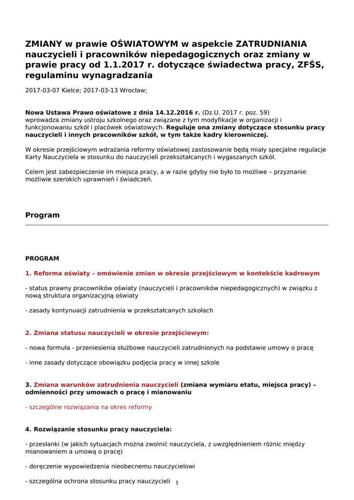 ZMIANY w prawie OŚWIATOWYM w aspekcie ZATRUDNIANIA nauczycieli i pracowników niepedagogicznych oraz zmiany w prawie pracy od 1.1.2017 r. dotyczące świadectwa pracy, ZFŚS, regulaminu wynagradzania 2017-03-07 Kielce; 2017-03-13 Wrocław; Nowa Ustawa Prawo oświatowe z dnia 14.12.2016 r. (Dz.U. 2017 r. poz. 59) wprowadza zmiany ustroju szkolnego oraz związane z tym modyfikacje w organizacji i funkcjonowaniu szkół i placówek oświatowych. Reguluje ona zmiany dotyczące stosunku pracy nauczycieli i innych pracowników szkół, w tym także kadry kierowniczej. W okresie przejściowym wdrażania reformy oświatowej zastosowanie będą miały specjalne regulacje Karty Nauczyciela w stosunku do nauczycieli przekształcanych i wygaszanych szkół. Celem jest zabezpieczenie im miejsca pracy, a w razie gdyby nie było to możliwe – przyznanie możliwie szerokich uprawnień i świadczeń. Program PROGRAM 1. Reforma oświaty – omówienie zmian w okresie przejściowym w kontekście kadrowym - status prawny pracowników oświaty (nauczycieli i pracowników niepedagogicznych) w związku z nową struktura organizacyjną oświaty - zasady kontynuacji zatrudnienia w przekształcanych szkołach 2. Zmiana statusu nauczycieli w okresie przejściowym: - nowa formuła - przeniesienia służbowe nauczycieli zatrudnionych na podstawie umowy o pracę - inne zasady dotyczące obowiązku podjęcia pracy w innej szkole 3. Zmiana warunków zatrudnienia nauczycieli (zmiana wymiaru etatu, miejsca pracy) – odmienności przy umowach o pracę i mianowaniu - szczególne rozwiązania na okres reformy 4. Rozwiązanie stosunku pracy nauczyciela: - przesłanki (w jakich sytuacjach można zwolnić nauczyciela, z uwzględnieniem różnic między mianowaniem a umową o pracę) - doręczenie wypowiedzenia nieobecnemu nauczycielowi - szczególna ochrona stosunku pracy nauczycieli 1 5. Status prawny nauczycieli i pracowników niepedagogicznych gimnazjów - nowe zasady przejścia w stan nieczynny - ograniczenie etatu - uzupełnianie etatu w innej szkole - możliwość kontynuowania awansu zawodowego 6. Obowiązek informacyjne i terminy związane z reformą - informowanie o wolnych miejscach pracy dla nauczycieli - pierwszeństwo w zatrudnieniu - informowanie o przekształceniach szkół – terminy i zasady 7. Status prawny dyrektora szkoły podstawowej i wygaszanego gimnazjum - możliwość dalszego zajmowania stanowiska przez dyrektorów przekształcanych szkół - status pozostałej kadry kierowniczej w szkołach - sytuacja prawna dyrektorów zespołów szkół - powierzanie stanowisk kierowniczych w okresie przejściowym 8. Zmiany w prawie pracy 2016/2017 - nowe zasady wystawiania świadectw pracy - tworzenie regulaminów (pracy, wynagradzania, zfśs) - wydłużenie terminów na odwołanie od wypowiedzenia stosunku pracy - opieka nad dzieckiem do lat 14 w godzinach u nauczycieli (rozliczanie godzinowe) 9. Wybrane zagadnienia związane z nawiązaniem stosunku pracy z nauczycielami: - wymagania przy zatrudnianiu nauczycieli (niekaralność dyscyplinarna - dokumentacja) - dokumenty wymagane przy zatrudnianiu (oświadczenia i zaświadczenia) - zawieranie kilku umów z tą samą osobą (dopuszczalne, czy zabronione)- rozwiązania optymalne - specyfika zatrudniania nauczycieli na czas określony 10. Świadczenia pieniężne wynikające ze stosunku pracy nauczycieli – istotne problemy: - nagroda jubileuszowa - dodatkowe wynagrodzenie roczne (trzynastka) - dodatek stażowy 2 11. Urlopy nauczycieli: - urlop uzupełniający i ekwiwalent za niewykorzystany urlop wypoczynkowy - urlop dla poratowania zdrowia - udzielanie dni wolnych (okolicznościowych) nauczycielom - opieka nad dzieckiem do lat 14 w godzinach u nauczycieli (rozliczanie godzinowe) 12. Przejście nauczyciela na emeryturę lub świadczenie kompensacyjne - wcześniejsza emerytura nauczycielska - nauczycielskie świadczenia kompensacyjne - wymagany tryb rozwiązania stosunku pracy - konsekwencje obniżenia wieku emerytalnego dla nauczycieli Warunki Warunkiem uczestnictwa wszkoleniu jest przesłanie karty zgłoszenia faksem, e-mailem lub pocztą bądź wypełniając formularz na stronie. Jest to jednoznaczne zzawarciem umowy pomiędzy Państwa firmą a firmą MODUS. Potwierdzenie udziału zinformacją omiejscu szkolenia (jeśli miejsce niejest podane wcześniej) zostanie przesłane na 3 dni przed szkoleniem na podany wzgłoszeniu adres e-mail lub faks. Szkolenienależy opłacić przelewającnależność na rachunek MODUS Centrum Wiedzy: ING BANK ŚLĄSKI SA 92 1050 1924 1000 0090 9740 9735. Dokument księgowy zostanie przekazany na szkoleniu. Rezygnacji można dokonać na 7 dni przed szkoleniem wformie pisemnej (faksem lub e-mailem). Późniejsza rezygnacja lub jej brak zobowiązuje do pokrycia kosztów w100%. Organizator zastrzega sobie prawo zmiany terminu zajęć lub odwołania szkolenia zprzyczyn od niego niezależnych najpóźniej na 2 dni przed terminem szkolenia. Cena szkolenia obejmuje: - udział wszkoleniu - kompleksowe materiały szkoleniowe - certyfikat ukończenia szkolenia - serwis kawowy i lunch Terminy i ceny Miasto Kielce Termin Cena 2017-03-07 319 zł netto + 23% VAT * Czas szkolenia: 10.00-15.00 Miejsce szkolenia: 3 Kielecki Park Technologiczny Wrocław 2017-03-13 319 zł netto + 23% VAT * 4 Powered by TCPDF (www.tcpdf.org)