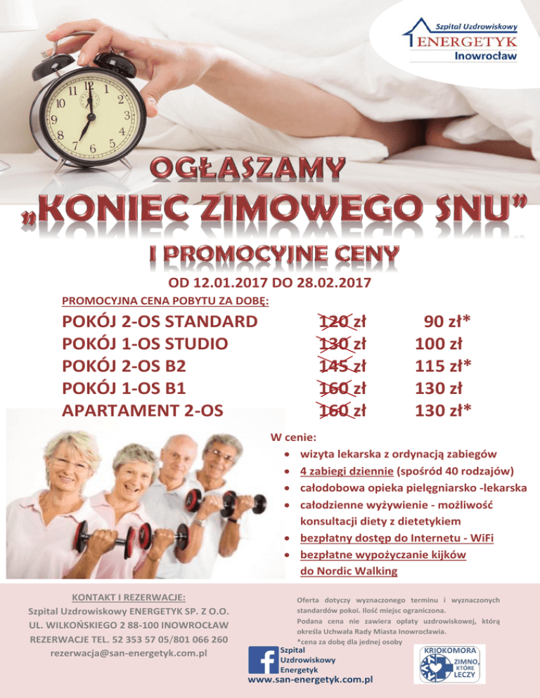 OD 12.01.2017 DO 28.02.2017 PROMOCYJNA CENA POBYTU ZA DOBĘ: POKÓJ 2-OS STANDARD POKÓJ 1-OS STUDIO POKÓJ 2-OS B2 POKÓJ 1-OS B1 APARTAMENT 2-OS 120 zł 130 zł 145 zł 160 zł 160 zł 90 zł* 100 zł 115 zł* 130 zł 130 zł* W cenie: wizyta lekarska z ordynacją zabiegów 4 zabiegi dziennie (spośród 40 rodzajów) całodobowa opieka pielęgniarsko -lekarska całodzienne wyżywienie - możliwość konsultacji diety z dietetykiem bezpłatny dostęp do Internetu - WiFi bezpłatne wypożyczanie kijków do Nordic Walking KONTAKT I REZERWACJE: Szpital Uzdrowiskowy ENERGETYK SP. Z O.O. UL. WILKOŃSKIEGO 2 88-100 INOWROCŁAW REZERWACJE TEL. 52 353 57 05/801 066 260 [email protected] Oferta dotyczy wyznaczonego terminu i wyznaczonych standardów pokoi. Ilość miejsc ograniczona. Podana cena nie zawiera opłaty uzdrowiskowej, którą określa Uchwała Rady Miasta Inowrocławia. *cena za dobę dla jednej osoby Szpital Uzdrowiskowy Energetyk www.san-energetyk.com.pl