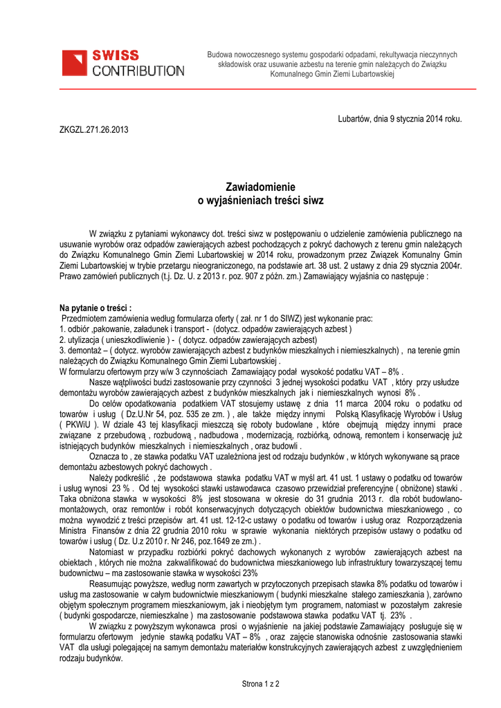 Budowa nowoczesnego systemu gospodarki odpadami, rekultywacja nieczynnych składowisk oraz usuwanie azbestu na terenie gmin należących do Związku Komunalnego Gmin Ziemi Lubartowskiej Lubartów, dnia 9 stycznia 2014 roku. ZKGZL.271.26.2013 Zawiadomienie o wyjaśnieniach treści siwz W związku z pytaniami wykonawcy dot. treści siwz w postępowaniu o udzielenie zamówienia publicznego na usuwanie wyrobów oraz odpadów zawierających azbest pochodzących z pokryć dachowych z terenu gmin należących do Związku Komunalnego Gmin Ziemi Lubartowskiej w 2014 roku, prowadzonym przez Związek Komunalny Gmin Ziemi Lubartowskiej w trybie przetargu nieograniczonego, na podstawie art. 38 ust. 2 ustawy z dnia 29 stycznia 2004r. Prawo zamówień publicznych (t.j. Dz. U. z 2013 r. poz. 907 z późn. zm.) Zamawiający wyjaśnia co następuje : Na pytanie o treści : Przedmiotem zamówienia według formularza oferty ( zał. nr 1 do SIWZ) jest wykonanie prac: 1. odbiór ,pakowanie, załadunek i transport - (dotycz. odpadów zawierających azbest ) 2. utylizacja ( unieszkodliwienie ) - ( dotycz. odpadów zawierających azbest) 3. demontaż – ( dotycz. wyrobów zawierających azbest z budynków mieszkalnych i niemieszkalnych) , na terenie gmin należących do Związku Komunalnego Gmin Ziemi Lubartowskiej . W formularzu ofertowym przy w/w 3 czynnościach Zamawiający podał wysokość podatku VAT – 8% . Nasze wątpliwości budzi zastosowanie przy czynności 3 jednej wysokości podatku VAT , który przy usłudze demontażu wyrobów zawierających azbest z budynków mieszkalnych jak i niemieszkalnych wynosi 8% . Do celów opodatkowania podatkiem VAT stosujemy ustawę z dnia 11 marca 2004 roku o podatku od towarów i usług ( Dz.U.Nr 54, poz. 535 ze zm. ) , ale także między innymi Polską Klasyfikację Wyrobów i Usług ( PKWiU ). W dziale 43 tej klasyfikacji mieszczą się roboty budowlane , które obejmują między innymi prace związane z przebudową , rozbudową , nadbudowa , modernizacją, rozbiórką, odnową, remontem i konserwację już istniejących budynków mieszkalnych i niemieszkalnych , oraz budowli . Oznacza to , ze stawka podatku VAT uzależniona jest od rodzaju budynków , w których wykonywane są prace demontażu azbestowych pokryć dachowych . Należy podkreślić , że podstawowa stawka podatku VAT w myśl art. 41 ust. 1 ustawy o podatku od towarów i usług wynosi 23 % . Od tej wysokości stawki ustawodawca czasowo przewidział preferencyjne ( obniżone) stawki . Taka obniżona stawka w wysokości 8% jest stosowana w okresie do 31 grudnia 2013 r. dla robót budowlanomontażowych, oraz remontów i robót konserwacyjnych dotyczących obiektów budownictwa mieszkaniowego , co można wywodzić z treści przepisów art. 41 ust. 12-12-c ustawy o podatku od towarów i usług oraz Rozporządzenia Ministra Finansów z dnia 22 grudnia 2010 roku w sprawie wykonania niektórych przepisów ustawy o podatku od towarów i usług ( Dz. U.z 2010 r. Nr 246, poz.1649 ze zm.) . Natomiast w przypadku rozbiórki pokryć dachowych wykonanych z wyrobów zawierających azbest na obiektach , których nie można zakwalifikować do budownictwa mieszkaniowego lub infrastruktury towarzyszącej temu budownictwu – ma zastosowanie stawka w wysokości 23% Reasumując powyższe, według norm zawartych w przytoczonych przepisach stawka 8% podatku od towarów i usług ma zastosowanie w całym budownictwie mieszkaniowym ( budynki mieszkalne stałego zamieszkania ), zarówno objętym społecznym programem mieszkaniowym, jak i nieobjętym tym programem, natomiast w pozostałym zakresie ( budynki gospodarcze, niemieszkalne ) ma zastosowanie podstawowa stawka podatku VAT tj. 23% . W związku z powyższym wykonawca prosi o wyjaśnienie na jakiej podstawie Zamawiający posługuje się w formularzu ofertowym jedynie stawką podatku VAT – 8% , oraz zajęcie stanowiska odnośnie zastosowania stawki VAT dla usługi polegającej na samym demontażu materiałów konstrukcyjnych zawierających azbest z uwzględnieniem rodzaju budynków. Strona 1 z 2 Budowa nowoczesnego systemu gospodarki odpadami, rekultywacja nieczynnych składowisk oraz usuwanie azbestu na terenie gmin należących do Związku Komunalnego Gmin Ziemi Lubartowskiej Odpowiedź : Zamawiający informuje: Wyłoniony w drodze przetargu wykonawca, w świetle SIWZ oraz projektu umowy, świadczyć ma usługę polegającą na wykonaniu prac związanych z usuwaniem i unieszkodliwianiem azbestu oraz wyrobów zawierających azbest pochodzących z pokryć dachowych budynków mieszkalnych, gospodarczych i inwentarskich z terenu gmin należących do Związku Komunalnego Gmin Ziemi Lubartowskiej w 2014. Na przedmiot zamówienia składają się w szczególności roboty budowlane oraz usługi polegające na demontażu z dachów budynków mieszkalnych, gospodarczych i inwentarskich wyrobów oraz odpadów zawierających azbest, ich pakowaniu, załadunku i transporcie oraz utylizacji tj. odpowiednim umieszczeniu na wysypiskach zgodnie z wymaganiami obowiązujących przepisów. Dyrektor Izby Skarbowej w Łodzi działając w imieniu Ministra Finansów w interpretacji z dnia 3 października 2011 r. (IPTPP2/443-239/11-6/IR) wskazał, że „skoro w zakres świadczonej przez Wnioskodawcę usługi wchodzi demontaż oraz transport azbestu (natomiast usługa nie obejmuje bezpośrednio unieszkodliwienia odpadu) to stanowi ona usługę kompleksową, polegającą na zbieraniu odpadu niebezpiecznego. Przy czym o ile usługa zbierania odpadów niebezpiecznych została prawidłowo zaklasyfikowana przez Wnioskodawcę do grupowania PKWiU 38.12.12.0 - "Usługi związane ze zbieraniem pozostałych niebezpiecznych odpadów przemysłowych" to stosownie do art. 41 ust. 2 ustawy, w związku z art. 146a pkt 2 ustawy i poz. 146 załącznika nr 3 podlega opodatkowaniu stawką 8%”. Dyrektor Izby Skarbowej w Poznaniu w interpretacji nr ILPP4/443-115/12-4/EWW z 2012.06.01 wskazał, że „z tytułu wykon