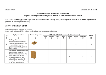 Załącznik nr 1 do SIWZ MODR 7/2013 Szczegółowy opis przedmiotu zamówienia Dotyczy: dostawy mebli biurowych do MODR Warszawa i Oddziałów MODR UWAGA: Zamawiający zastrzega sobie prawo doboru lub zmiany kolorystyki tapicerki siedzisk oraz mebli w granicach podanej w ofercie grupy cenowej Meble w kolorze olcha Płyta melaminowana, obrzeże – PCV i folia, Ściany tylnie dzielone z PDF w kolorze mebli, uchwyty galwanizowane – aluminium Lp. Opis przedmiotu 1 2 Pólka pod klawiaturę w kolorze olcha o szerokości 560 mm, głębokości 370 mm, wysokości 110 mm, z przesuwną szufladą, grubość blatu 18mm. Szafka dwu drzwiowa z półką zamykana na zamek w kolorze olcha szerokości 800 mm, głębokości 385 mm, wysokości 800 mm, blat górny i dolny grubości 25 mm, grubość korpusu 18 mm, 4 szt. nóg regulowanych. 1 2 Przykładowy wzór 3 Oddziały MODR Warszawa (ilość mebli w szt.) Bielice Ostrołęka Płock Płońsk Radom Siedlce Warszawa 4 5 6 7 8 9 10 3 4 1 Razem 11 3 3 7 3 4 5 Szafka dwu drzwiowa z dwiema półkami zamykana na zamek w kolorze olcha szerokości 800 mm, głębokości 385 mm, wysokości 1130 mm, blat górny i dolny grubości 25 mm, grubość korpusu 18 mm, 4 szt. nóg regulowanych. Szafka dwu drzwiowa z dwiema półkami zamykana na zamek w kolorze olcha szerokości 600 mm, głębokości 500 mm, wysokości 1130 mm, blat górny i dolny grubości 25 mm, grubość korpusu 18 mm4 szt. nóg regulowanych. Szafka dwu drzwiowa z dwiema półkami zamykana na zamek w kolorze olcha szerokości 600 mm, głębokości 500 mm, wysokości 600 mm, blat górny i dolny grubości 25 mm, grubość korpusu 18 mm 4 szt. nóg regulowanych. 4 7 2 2 2 1 2 13 1 6 7 8 Szafka dzielona na część zamykaną na dolną i część otwartą na górze, część dolna dwu drzwiowa z jedną półką zamykana na zamek w kolorze olcha szerokości 800 mm, głębokości 385 mm, wysokości 1130 mm, blat górny i dolny grubości 25 mm, grubość korpusu 18 mm, 4 szt. nóg regulowanych. Szafa dwu drzwiowa z czterema półkami zamykana na zamek w kolorze olcha szerokości 800 mm, głębokości 385 mm, wysokości 1830 mm, blat górny i dolny grubości 25 mm, grubość korpusu 18 mm, 4 szt. nóg regulowanych. Regał dzielony na część zamkniętą u dołu i część otwartą u góry, część dolna dwu drzwiowa z jedną półką zamykana na zamek, część górna z dwiema pólkami w kolorze olcha szerokości 800 mm, głębokości 385 mm, wysokości 1830 mm, blat górny i dolny grubości 25 mm, grubość korpusu 18 mm, 4 szt. nóg regulowanych. 2 3 2 3 3 3 1 3 4 3 2 14 11 2 19 6 9 10 11 Regał dzielony na część zamkniętą u dołu i u góry, środkowa część otwarta, część dolna dwu drzwiowa z jedną półką zamykana na zamek, część górna z jedną półką zamykana na zamek w kolorze olcha szerokości 800 mm, głębokości 385 mm, wysokości 1830 mm, blat górny i dolny grubości 25 mm, grubość korpusu 18 mm, 4 szt. nóg regulowanych. Szafa dwu drzwiowa z pięcioma półkami zamykana na zamek w kolorze olcha szerokości 800 mm, głębokości 385 mm, wysokości 2185 mm, blat górny i dolny grubości 25 mm, grubość korpusu 18 mm, 4 szt. nóg regulowanych. Szafa ubraniowa jedno drzwiowa z jedną półką u góry i prętem na powieszenie ubrań w kolorze olcha szerokości 550 mm, głębokości 500 mm, wysokości 1830 mm, blat górny i dolny grubości 25 mm, grubość korpusu 18 mm, 4 szt. nóg regulowanych. 1 3 4 6 2 2 3 1 11 4 9 12 13 14 15 Kontener z trzema szufladami zamykany na zamek z blatem w kolorze olcha, szerokości 435 mm, głębokości 520 mm, wysokości 590 mm, blat górny i dolny grubości 25 mm, na kółeczkach, grubość korpusu 18 mm, 4 szt. nóg regulowanych. Kontener z blatem z czterema szufladami na kółkach zamykany na zamek w kolorze olcha, szerokości 435 mm, głębokości 520 mm, wysokości 720 mm, blat górny i dolny grubości 25 mm, na kółeczkach, grubość korpusu 18 mm, 4 szt. nóg regulowanych. kontener bez blatu z czterema szufladami zamykany na zamek, w kolorze olcha szerokości 430 mm, głębokości 590 mm, wysokości 730 mm, blat dolny grubości 25 mm, grubość korpusu 18 mm kontener bez blatu z czterema szufladami zamykany na zamek, w kolorze olcha szerokości 430 mm, głębokości 490 mm, 2 8 4 3 8 1 1 16 6 2 5 25 1 23 2 16 17 18 19 wysokości 730 mm, blat dolny grubości 25 mm, grubość korpusu 18 mm kontener bez blatu z drzwiczkami otwieranymi w lewo z jedną półką zamykany na zamek w kolorze olcha szerokości 430 mm, głębokości 590 mm, wysokości 730 mm, blat dolny grubości 25 mm, grubość korpusu 18 mm Okrągły stolik w kolorze olcha o średnicy blatu 1000 mm, wysokości 760 mm, grubość blatu 25 mm, grubość podstawy 18 mm, 4 szt. nóg regulowanych. 4 1 4 7 Stół konferencyjny w kolorze olcha, szerokości 1400 mm, głębokości 700 mm, wysokości 758 mm, grubość blatu 25 mm, grubość podstawy 18 mm, 4 szt. nóg regulowanych. Stół konferencyjny w kolorze olcha, szerokości 2500 mm, głębokości 1000 mm, wysokości 758 mm, grubość blatu 25 mm grubość podstawy 18 mm, 4 szt. nóg regulowanych. 1 6 2 8 10 4 13 1 1 20 21 22 Biurko kształtowe lewostronne w kolorze olcha, szerokość 1400 mm, głębokość 1000 mm, wysokość 758 mm, przelotem na okablowanie komputerowe, grubość blatu 25 mm, grubość podstawy 18 mm oraz 2 przelotki kablowe w blacie biurka. Podstawa umocowana tak aby powstał 20 mm rant. 4 szt. nóg regulowanych. Biurko kształtowe prawostronne w kolorze olcha, szerokość 1600 mm, głębokość 1200 mm, wysokość 758 mm, przelotem na okablowanie komputerowe, grubość blatu 25 mm, grubość podstawy 18 mm oraz 2 przelotki kablowe w blacie biurka. Podstawa umocowana tak aby powstał 20 mm rant. 4 szt. nóg regulowanych. Biurko kształtowe prawostronne w kolorze olcha, szerokość 1600 mm, głębokość 1000 mm, wysokość 758 mm, 2 przelotki na okablowanie 3 2 7 1 4 1 1 2 23 24 komputerowe, grubość blatu 25 mm, grub