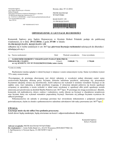 Komornik Sądowy przy Sądzie Rejonowym w Krośnie Robert Polański Kancelaria Komornicza Roberta Polańskiego w Krośnie 38-400 Krosno Ignacego Łukasiewicza 71 tel. 737472117, 695852502, e-mail: [email protected] www.komornikkrosno.info Km 359/16 #RP *0020000160552*/0419/ Krosno, dnia 07-12-2016 PIOTR MATEUSZ WYSZYŃSKI KLĘCZANY 139 33-394 KLĘCZANY *0020000160552* OBWIESZCZENIE O LICYTACJI RUCHOMOŚCI Komornik Sądowy przy Sądzie Rejonowym w Krośnie Robert Polański podaje do publicznej wiadomości, że w dniu 29-12-2016r. o godz. 07:00 w lokalu: 33-394 KLĘCZANY, KLĘCZANY 139 odbędzie się w trybie ustalonym w art. 867 kpc pierwsza licytacja ruchomości należących do dłużnika i składających się z: ____________________________________________________________________________________________________ Lp. Nazwa ruchomości Ilość Wartość szacunkowa Cena wywołania _____________________________________________________________________________________________________ 1. SAMOCHÓD OSOBOWY VOLKSWAGEN PASSAT ROK PRO D. 1998 KOLOR: CZARNY 1 [szt.] 5 000,00 **) 3 750,00 nr rej. KNS2E79, VIN WVWZZZ3BZWE332606, kolor czarny _______________________________________________________________________________________________________________________ *) cena za sztukę Ruchomości można oglądać w dzień licytacji w miejscu i czasie oznaczonym wyżej. Suma wywołania wynosi 75% sumy oszacowania. Przystępujący do przetargu obowiązany jest złożyć rękojmię w wysokości jednej dziesiątej części sumy oszacowania. Rękojmię złożoną przez licytanta, któremu udzielono przybicia, zatrzymuje się; pozostałym licytantom rękojmię zwraca się niezwłocznie. Jeżeli nabywca nie wykonał w terminie warunków licytacji co do zapłaty ceny, traci rękojmię, a skutki przybicia wygasają. Z utraconej rękojmi pokrywa się koszty egzekucji związanej ze sprzedażą, a reszta wchodzi w skład sumy uzyskanej w egzekucji albo jeżeli egzekucja została umorzona jest przelewana na dochód Skarbu Państwa (art. 8671 kpc). W przetargu nie mogą uczestniczyć: dłużnik, komornik, ich małżonkowie, dzieci, rodzice i rodzeństwo, osoby obecne na licytacji w charakterze urzędowym oraz licytant, który nie wykonał warunków poprzedniej licytacji. Stawienie się jednego licytanta wystarcza do odbycia przetargu. Pełnomocnictwo do udziału w przetargu powinno być stwierdzone dokumentem z podpisem urzędowo poświadczonym, chyba że chodzi o pełnomocnictwo udzielone adwokatowi lub radcy prawnemu (art. 8672 kpc) UWAGA: Licytacja może się nie odbyć bez podania przyczyny. Jeżeli drzwi będą zamknięte, będą otwierane na koszt i odpowiedzialność dłużnika. Komornik Sądowy Robert Polański Adresat oryginału: PIOTR MATEUSZ WYSZYŃSKI Do wiadomości: 1. Getin Noble Bank S.A., 02-672 Warszawa [WIN/00/877906/14] 2. Sąd Rejonowy w Nowym Sączu, 33-300 NOWY SĄCZ 3. a/a 1