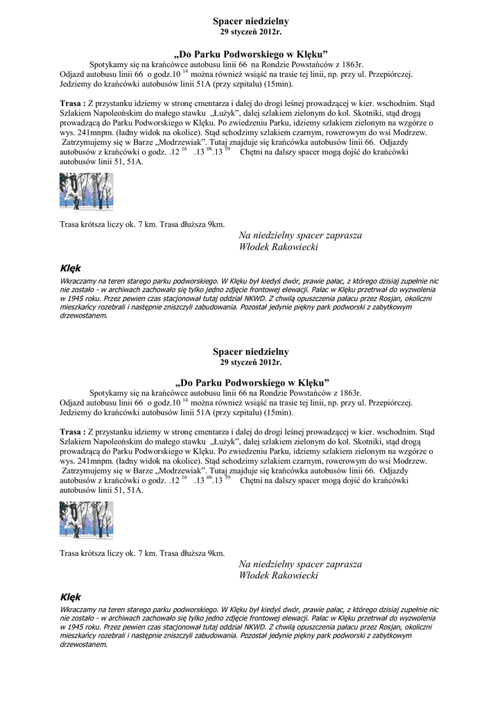 Spacer niedzielny 29 styczeń 2012r. „Do Parku Podworskiego w Klęku” Spotykamy się na krańcówce autobusu linii 66 na Rondzie Powstańców z 1863r. Odjazd autobusu linii 66 o godz.10 14 można również wsiąść na trasie tej linii, np. przy ul. Przepiórczej. Jedziemy do krańcówki autobusów linii 51A (przy szpitalu) (15min). Trasa : Z przystanku idziemy w stronę cmentarza i dalej do drogi leśnej prowadzącej w kier. wschodnim. Stąd Szlakiem Napoleońskim do małego stawku „Łużyk”, dalej szlakiem zielonym do kol. Skotniki, stąd drogą prowadzącą do Parku Podworskiego w Klęku. Po zwiedzeniu Parku, idziemy szlakiem zielonym na wzgórze o wys. 241mnpm. (ładny widok na okolice). Stąd schodzimy szlakiem czarnym, rowerowym do wsi Modrzew. Zatrzymujemy się w Barze „Modrzewiak”. Tutaj znajduje się krańcówka autobusów linii 66. Odjazdy autobusów z krańcówki o godz. .12 16 .13 06.13 59 Chętni na dalszy spacer mogą dojść do krańcówki autobusów linii 51, 51A. Trasa krótsza liczy ok. 7 km. Trasa dłuższa 9km. Na niedzielny spacer zaprasza Włodek Rakowiecki Klęk Wkraczamy na teren starego parku podworskiego. W Klęku był kiedyś dwór, prawie pałac, z którego dzisiaj zupełnie nic nie zostało - w archiwach zachowało się tylko jedno zdjęcie frontowej elewacji. Pałac w Klęku przetrwał do wyzwolenia w 1945 roku. Przez pewien czas stacjonował tutaj oddział NKWD. Z chwilą opuszczenia pałacu przez Rosjan, okoliczni mieszkańcy rozebrali i następnie zniszczyli zabudowania. Pozostał jedynie piękny park podworski z zabytkowym drzewostanem. Spacer niedzielny 29 styczeń 2012r. „Do Parku Podworskiego w Klęku” Spotykamy się na krańcówce autobusu linii 66 na Rondzie Powstańców z 1863r. Odjazd autobusu linii 66 o godz.10 14 można również wsiąść na trasie tej linii, np. przy ul. Przepiórczej. Jedziemy do krańcówki autobusów linii 51A (przy szpitalu) (15min). Trasa : Z przystanku idziemy w stronę cmentarza i dalej do drogi leśnej prowadzącej w kier. wschodnim. Stąd Szlakiem Napoleońskim do małego stawku „Łużyk”, dalej szlakiem zielonym do kol. Skotniki, stąd drogą prowadzącą do Parku Podworskiego w Klęku. Po zwiedzeniu Parku, idziemy szlakiem zielonym na wzgórze o wys. 241mnpm. (ładny widok na okolice). Stąd schodzimy szlakiem czarnym, rowerowym do wsi Modrzew. Zatrzymujemy się w Barze „Modrzewiak”. Tutaj znajduje się krańcówka autobusów linii 66. Odjazdy autobusów z krańcówki o godz. .12 16 .13 06.13 59 Chętni na dalszy spacer mogą dojść do krańcówki autobusów linii 51, 51A. Trasa krótsza liczy ok. 7 km. Trasa dłuższa 9km. Na niedzielny spacer zaprasza Włodek Rakowiecki Klęk Wkraczamy na teren starego parku podworskiego. W Klęku był kiedyś dwór, prawie pałac, z którego dzisiaj zupełnie nic nie zostało - w archiwach zachowało się tylko jedno zdjęcie frontowej elewacji. Pałac w Klęku przetrwał do wyzwolenia w 1945 roku. Przez pewien czas stacjonował tutaj oddział NKWD. Z chwilą opuszczenia pałacu przez Rosjan, okoliczni mieszkańcy rozebrali i następnie zniszczyli zabudowania. Pozostał jedynie piękny park podworski z zabytkowym drzewostanem.