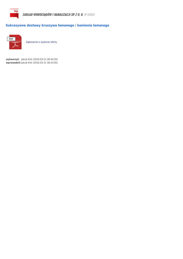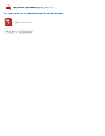 Sukcesywne dostawy kruszywa łamanego / kamienia łamanego Ogłoszenie o wyborze oferty wytworzył: Jakub Król (2016-03-21 06:40:50) wprowadził: Jakub Król (2016-03-21 06:43:05)