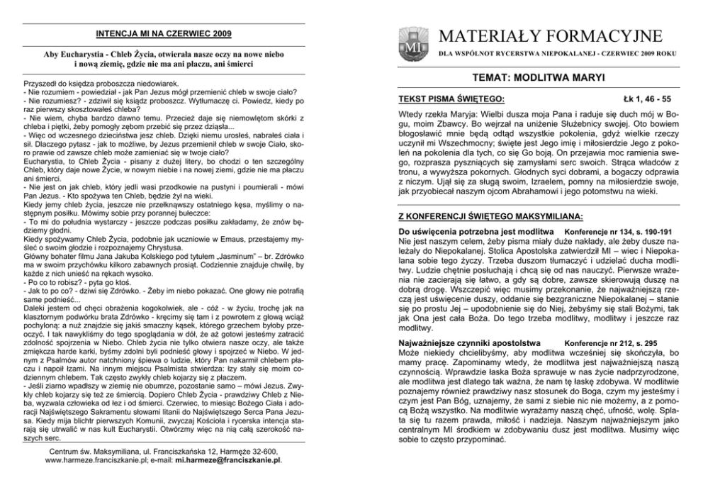 INTENCJA MI NA CZERWIEC 2009 Aby Eucharystia - Chleb Życia, otwierała nasze oczy na nowe niebo i nową ziemię, gdzie nie ma ani płaczu, ani śmierci Przyszedł do księdza proboszcza niedowiarek. - Nie rozumiem - powiedział - jak Pan Jezus mógł przemienić chleb w swoje ciało? - Nie rozumiesz? - zdziwił się ksiądz proboszcz. Wytłumaczę ci. Powiedz, kiedy po raz pierwszy skosztowałeś chleba? - Nie wiem, chyba bardzo dawno temu. Przecież daje się niemowlętom skórki z chleba i piętki, żeby pomogły zębom przebić się przez dziąsła... - Więc od wczesnego dzieciństwa jesz chleb. Dzięki niemu urosłeś, nabrałeś ciała i sił. Dlaczego pytasz - jak to możliwe, by Jezus przemienił chleb w swoje Ciało, skoro prawie od zawsze chleb może zamieniać się w twoje ciało? Eucharystia, to Chleb Życia - pisany z dużej litery, bo chodzi o ten szczególny Chleb, który daje nowe Życie, w nowym niebie i na nowej ziemi, gdzie nie ma płaczu ani śmierci. - Nie jest on jak chleb, który jedli wasi przodkowie na pustyni i poumierali - mówi Pan Jezus. - Kto spożywa ten Chleb, będzie żył na wieki. Kiedy jemy chleb życia, jeszcze nie przełknąwszy ostatniego kęsa, myślimy o następnym posiłku. Mówimy sobie przy porannej bułeczce: - To mi do południa wystarczy - jeszcze podczas posiłku zakładamy, że znów będziemy głodni. Kiedy spożywamy Chleb Życia, podobnie jak uczniowie w Emaus, przestajemy myśleć o swoim głodzie i rozpoznajemy Chrystusa. Główny bohater filmu Jana Jakuba Kolskiego pod tytułem „Jasminum” – br. Zdrówko ma w swoim przychówku kilkoro zabawnych prosiąt. Codziennie znajduje chwilę, by każde z nich unieść na rękach wysoko. - Po co to robisz? - pyta go ktoś. - Jak to po co? - dziwi się Zdrówko. - Żeby im niebo pokazać. One głowy nie potrafią same podnieść... Daleki jestem od chęci obrażenia kogokolwiek, ale - cóż - w życiu, trochę jak na klasztornym podwórku brata Zdrówko - kręcimy się tam i z powrotem z głową wciąż pochyloną: a nuż znajdzie się jakiś smaczny kąsek, którego grzechem byłoby przeoczyć. I tak nawykliśmy do tego spoglądania w dół, że aż gotowi jesteśmy zatracić zdolność spojrzenia w Niebo. Chleb życia nie tylko otwiera nasze oczy, ale także zmiękcza harde karki, byśmy zdolni byli podnieść głowy i spojrzeć w Niebo. W jednym z Psalmów autor natchniony śpiewa o ludzie, który Pan nakarmił chlebem płaczu i napoił łzami. Na innym miejscu Psalmista stwierdza: łzy stały się moim codziennym chlebem. Tak często zwykły chleb kojarzy się z płaczem. - Jeśli ziarno wpadłszy w ziemię nie obumrze, pozostanie samo – mówi Jezus. Zwykły chleb kojarzy się też ze śmiercią. Dopiero Chleb Życia - prawdziwy Chleb z Nieba, wyzwala człowieka od łez i od śmierci. Czerwiec, to miesiąc Bożego Ciała i adoracji Najświętszego Sakramentu słowami litanii do Najświętszego Serca Pana Jezusa. Kiedy mija blichtr pierwszych Komunii, zwyczaj Kościoła i rycerska intencja starają się utrwalić w nas kult Eucharystii. Otwórzmy więc na nią całą szerokość naszych serc. Centrum św. Maksymiliana, ul. Franciszkańska 12, Harmęże 32-600, www.harmeze.franciszkanie.pl; e-mail: [email protected]. MATERIAŁY FORMACYJNE DLA WSPÓLNOT RYCERSTWA NIEPOKALANEJ - CZERWIEC 2009 ROKU TEMAT: MODLITWA MARYI TEKST PISMA ŚWIĘTEGO: Łk 1, 46 - 55 Wtedy rzekła Maryja: Wielbi dusza moja Pana i raduje się duch mój w Bogu, moim Zbawcy. Bo wejrzał na uniżenie Służebnicy swojej. Oto bowiem błogosławić mnie będą odtąd wszystkie pokolenia, gdyż wielkie rzeczy uczynił mi Wszechmocny; święte jest Jego imię i miłosierdzie Jego z pokoleń na pokolenia dla tych, co się Go boją. On przejawia moc ramienia swego, rozprasza pyszniących się zamysłami serc swoich. Strąca władców z tronu, a wywyższa pokornych. Głodnych syci dobrami, a bogaczy odprawia z niczym. Ujął się za sługą swoim, Izraelem, pomny na miłosierdzie swoje, jak przyobiecał naszym ojcom Abrahamowi i jego potomstwu na wieki. Z KONFERENCJI ŚWIĘTEGO MAKSYMILIANA: Do uświęcenia potrzebna jest modlitwa Konferencje nr 134, s. 190-191 Nie jest naszym celem, żeby pisma miały duże nakłady, ale żeby dusze należały do Niepokalanej. Stolica Apostolska zatwierdził MI – wiec i Niepokalana sobie tego życzy. Trzeba duszom tłumaczyć i udzielać ducha modlitwy. Ludzie chętnie posłuchają i chcą się od nas nauczyć. Pierwsze wrażenia nie zacierają się łatwo, a gdy są dobre, zawsze skierowują duszę na dobrą drogę. Wszczepić więc musimy przekonanie, że najważniejszą rzeczą jest uświęcenie duszy, oddanie się bezgraniczne Niepokalanej – stanie się po prostu Jej – upodobnienie się do Niej, żebyśmy się stali Bożymi, tak jak Ona jest cała Boża. Do tego trzeba modlitwy, modlitwy i jeszcze raz modlitwy. Najważniejsze czynniki apostolstwa Konferencje nr 212, s. 295 Może niekiedy chcielibyśmy, aby modlitwa wcześniej się skończyła, bo mamy pracę. Zapominamy wtedy, że modlitwa jest najważniejszą naszą czynnością. Wprawdzie łaska Boża sprawuje w nas życie nadprzyrodzone, ale modlitwa jest dlatego tak ważna, że nam tę łaskę zdobywa. W modlitwie poznajemy również prawdziwy nasz stosunek do Boga, czym my jesteśmy i czym jest Pan Bóg, uznajemy, że sami z siebie nic nie możemy, a z pomocą Bożą wszystko. Na modlitwie wyrażamy naszą chęć, ufność, wolę. Splata się tu razem prawda, miłość i nadzieja. Naszym najważniejszym jako centralnym MI środkiem w zdobywaniu dusz jest modlitwa. Musimy więc sobie to często przypominać. WYJAŚNIENIE TEKSTÓW: ROZWAŻANIE: Modlitwa Narodu Wybranego Najświętsza Maryja Panna, jak zostało to powiedziane w poprzednim numerze „Materiałów formacyjnych”, była wierną córką Izraela – Córą Syjonu. Zatem najpierw, zanim przejdziemy do rozważania tekstu „Magnificat” – warto zatrzymać się na c