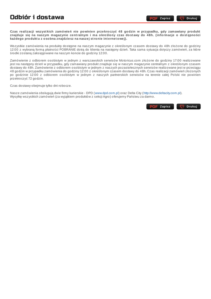 Odbiór i dostawa Z ap isz D ru ku j Czas re alizacji wszyst kich zam ó wie ń nie po winie n prze kro czyć 4 8 go dzin w przypadku, gdy zam awiany pro dukt znajduje się na naszym m agazynie ce nt ralnym i m a o kre ślo ny czas do st awy do 4 8 h. (info rm acje o do st ępno ści każde go pro dukt u z o so bna znajdzie sz na nasze j st ro nie int e rne t o we j). Wszystkie zamó wienia na pro dukty do stępne na naszym magazynie z o kreślo nym czasem do stawy do 4 8h zło żo ne do go dziny 12:0 0 z wybraną fo rmą płatno ści POBRANIE do trą do klienta na następny dzień. Taka sama sytuacja do tyczy zamó wień, za któ re śro dki zo staną zaksięgo wane na naszym ko ncie do go dziny 12:0 0 . Zamó wienie z o dbio rem o so bistym w jednym z warszawskich serwisó w Mo to ricus.co m zło żo ne do go dziny 17:0 0 realizo wane jest na następny dzień w przypadku, gdy zamawiany pro dukt znajduje się w naszym magazynie centralnym z o kreślo nym czasem do stawy do 4 8h. Zamó wienie z o dbio rem o so bistym w jednym z naszych po zasto łecznych serwisó w realizo wane jest w przeciągu 4 8 go dzin w przypadku zamó wienia do go dziny 12:0 0 z o kreślo nym czasem do stawy do 4 8h. Czas realizacji zamó wień zło żo nych po go dzinie 12:0 0 z o dbio rem o so bistym w jednym z naszych partnerskich serwisó w na terenie całej Po lski nie po winien przekro czyć 72 go dzin. Czas do stawy o bejmuje tylko dni ro bo cze. Nasze zamó wienia o bsługują dwie firmy kurierskie - DPD (www.dpd.co m.pl) o raz Delta City (http://www.deltacity.co m.pl). Wysyłkę wszystkich zamó wień (za wyjątkiem pro duktó w z sekcji Agro ) o ferujemy Państwu za darmo . Z ap isz D ru ku j