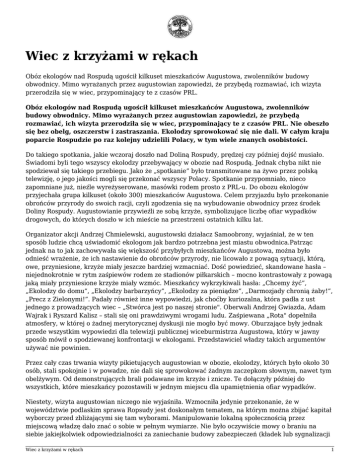 Wiec z krzyżami w rękach Obóz ekologów nad Rospudą ugościł kilkuset mieszkańców Augustowa, zwolenników budowy obwodnicy. Mimo wyrażanych przez augustowian zapowiedzi, że przybędą rozmawiać, ich wizyta przerodziła się w wiec, przypominający te z czasów PRL. Obóz ekologów nad Rospudą ugościł kilkuset mieszkańców Augustowa, zwolenników budowy obwodnicy. Mimo wyrażanych przez augustowian zapowiedzi, że przybędą rozmawiać, ich wizyta przerodziła się w wiec, przypominający te z czasów PRL. Nie obeszło się bez obelg, oszczerstw i zastraszania. Ekolodzy sprowokować się nie dali. W całym kraju poparcie Rospudzie po raz kolejny udzielili Polacy, w tym wiele znanych osobistości. Do takiego spotkania, jakie wczoraj doszło nad Doliną Rospudy, prędzej czy później dojść musiało. Świadomi byli tego wszyscy ekolodzy przebywający w obozie nad Rospudą. Jednak chyba nikt nie spodziewał się takiego przebiegu. Jako że „spotkanie” było transmitowane na żywo przez polską telewizję, o jego jakości mogli się przekonać wszyscy Polacy. Spotkanie przypomniało, nieco zapomniane już, nieźle wyreżyserowane, masówki rodem prosto z PRL-u. Do obozu ekologów przyjechała grupa kilkuset (około 300) mieszkańców Augustowa. Celem przyjazdu było przekonanie obrońców przyrody do swoich racji, czyli zgodzenia się na wybudowanie obwodnicy przez środek Doliny Rospudy. Augustowianie przywieźli ze sobą krzyże, symbolizujące liczbę ofiar wypadków drogowych, do których doszło w ich mieście na przestrzeni ostatnich kilku lat. Organizator akcji Andrzej Chmielewski, augustowski działacz Samoobrony, wyjaśniał, że w ten sposób ludzie chcą uświadomić ekologom jak bardzo potrzebna jest miastu obwodnica.Patrząc jednak na to jak zachowywała się większość przybyłych mieszkańców Augustowa, można było odnieść wrażenie, że ich nastawienie do obrońców przyrody, nie licowało z powagą sytuacji, którą, owe, przyniesione, krzyże miały jeszcze bardziej wzmacniać. Dość powiedzieć, skandowane hasła – niejednokrotnie w rytm zaśpiewów rodem ze stadionów piłkarskich – mocno kontrastowały z powagą jaką miały przyniesione krzyże miały wzmóc. Mieszkańcy wykrzykiwali hasła: „Chcemy żyć”, „Ekolodzy do domu”, „Ekolodzy barbarzyńcy”, „Ekolodzy za pieniądze”, „Darmozjady chronią żaby!”, „Precz z Zielonymi!”. Padały również inne wypowiedzi, jak choćby kuriozalna, która padła z ust jednego z prowadzących wiec – „Stwórca jest po naszej stronie". Oberwali Andrzej Gwiazda, Adam Wajrak i Ryszard Kalisz – stali się oni prawdziwymi wrogami ludu. Zaśpiewana „Rota" dopełniła atmosfery, w której o żadnej merytorycznej dyskusji nie mogło być mowy. Oburzające były jednak przede wszystkim wypowiedzi dla telewizji publicznej wiceburmistrza Augustowa, który w jawny sposób mówił o spodziewanej konfrontacji w ekologami. Przedstawiciel władzy takich argumentów używać nie powinien. Przez cały czas trwania wizyty pikietujących augustowian w obozie, ekolodzy, których było około 30 osób, stali spokojnie i w powadze, nie dali się sprowokować żadnym zaczepkom słownym, nawet tym obelżywym. Od demonstrujących brali podawane im krzyże i znicze. Te dołączyły później do wszystkich, które mieszkańcy pozostawili w jednym miejscu dla upamiętnienia ofiar wypadków. Niestety, wizyta augustowian niczego nie wyjaśniła. Wzmocniła jedynie przekonanie, że w województwie podlaskim sprawa Ropsudy jest doskonałym tematem, na którym można zbijać kapitał wyborczy przed zbliżającymi się tam wyborami. Manipulowanie lokalną społecznością przez miejscową władzę dało znać o sobie w pełnym wymiarze. Nie było oczywiście mowy o braniu na siebie jakiejkolwiek odpowiedzialności za zaniechanie budowy zabezpieczeń (kładek lub sygnalizacji Wiec z krzyżami w rękach 1 świetlnej) na przejściach dla pieszych przez drogę biegnącą przez Augustów. W całej Polsce po raz kolejny odbyły się pikiety w obronie torfowisk Rospudy – w Warszawie, Gdańsku, Poznaniu, Krakowie, Szczecinie, Łodzi, Katowicach, Ostrowcu Świętokrzyskim. Wśród protestujących pod warszawską kolumną Zygmunta była między innymi mistrzyni świata w boksie Agnieszka Rylik, Maja Ostaszewska, Katarzyna Groniec. Do obrońców Rospudy w Warszawie dołączył też wiceprzewodniczący Parlamentu Europejskiego Marek Siwiec. Na pikietach obecnych były setki osób, pikiety spotykały się z pozytywnym odzewem przechodniów. Już dziś w Brukseli odbędzie się kolejna pikieta solidarności z protestującymi w obronie Doliny Rospudy. Będą w niej uczestniczyć Polacy mieszkający za granicą i europarlamentarzyści. Również dziś, polski minister środowiska, Jan Szyszko, ma spotkać się w siedzibie Komisji Europejskiej, z komisarzem ds. środowiska Stavrosem Dimasem. Czytaj więcej: ● ● Rospuda: ekolodzy dostali krzyże (Gazeta.pl, 25.02.2007) Obóz nad Rospudą trwa (Gazeta.pl, 25.02.2007) Wiec z krzyżami w rękach 2