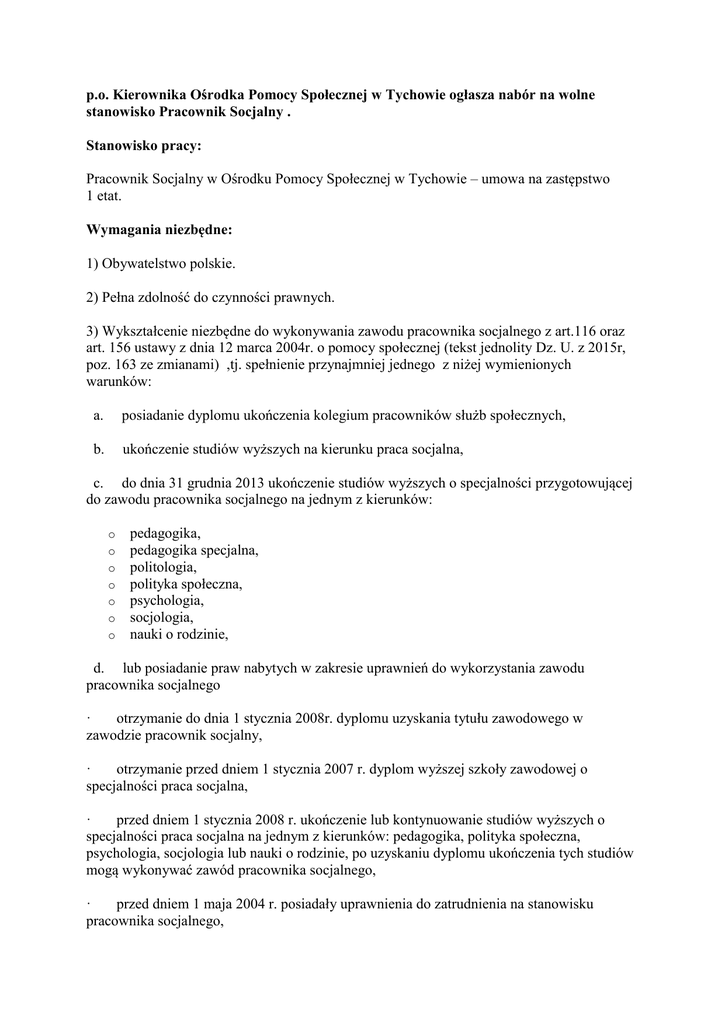 p.o. Kierownika Ośrodka Pomocy Społecznej w Tychowie ogłasza nabór na wolne stanowisko Pracownik Socjalny . Stanowisko pracy: Pracownik Socjalny w Ośrodku Pomocy Społecznej w Tychowie – umowa na zastępstwo 1 etat. Wymagania niezbędne: 1) Obywatelstwo polskie. 2) Pełna zdolność do czynności prawnych. 3) Wykształcenie niezbędne do wykonywania zawodu pracownika socjalnego z art.116 oraz art. 156 ustawy z dnia 12 marca 2004r. o pomocy społecznej (tekst jednolity Dz. U. z 2015r, poz. 163 ze zmianami) ,tj. spełnienie przynajmniej jednego z niżej wymienionych warunków: a. posiadanie dyplomu ukończenia kolegium pracowników służb społecznych, b. ukończenie studiów wyższych na kierunku praca socjalna, c. do dnia 31 grudnia 2013 ukończenie studiów wyższych o specjalności przygotowującej do zawodu pracownika socjalnego na jednym z kierunków: o o o o o o o pedagogika, pedagogika specjalna, politologia, polityka społeczna, psychologia, socjologia, nauki o rodzinie, d. lub posiadanie praw nabytych w zakresie uprawnień do wykorzystania zawodu pracownika socjalnego · otrzymanie do dnia 1 stycznia 2008r. dyplomu uzyskania tytułu zawodowego w zawodzie pracownik socjalny, · otrzymanie przed dniem 1 stycznia 2007 r. dyplom wyższej szkoły zawodowej o specjalności praca socjalna, · przed dniem 1 stycznia 2008 r. ukończenie lub kontynuowanie studiów wyższych o specjalności praca socjalna na jednym z kierunków: pedagogika, polityka społeczna, psychologia, socjologia lub nauki o rodzinie, po uzyskaniu dyplomu ukończenia tych studiów mogą wykonywać zawód pracownika socjalnego, · przed dniem 1 maja 2004 r. posiadały uprawnienia do zatrudnienia na stanowisku pracownika socjalnego, 4) znajomość przepisów ustawy z dnia 12 marca 2004r. o pomocy społecznej, ustawy z dnia 14.06.1960r. kodeks postępowania administracyjnego oraz innych przepisów odnoszących się do spraw pomocy społecznej. 5) biegła znajomość obsługi komputera (Microsoft Office, środowisko Windows) oraz obsługi internetu i poczty elektronicznej . 6) prawo jazdy kat. B, oraz własny środek komunikacji po terenie Gminy Tychowo /praca w terenie/, 7) doświadczenie zawodowe 2. Wymagania dodatkowe: 1) stan zdrowia pozwalający na zatrudnienie na stanowisku pracownik socjalny, 2) niekaralność za umyślne przestępstwo ścigane z oskarżenia publicznego lub umyślne przestępstwo skarbowe, 3) umiejętność skutecznego komunikowania się, 4) umiejętność analizy problemu i poprawnego wyciągania wniosków, 5) umiejętność pracy zespołowej, 6) umiejętność organizowania pracy własnej, 7) samodzielność, 8) zaangażowanie, 9) dyspozycyjność oraz możliwość swobodnego poruszania się na terenie Gminy Tychowo 10) wysoka kultura osobista. 3. Zakres wykonywanych zadań na stanowisku: 1) prowadzenie pracy socjalnej w środowisku 2) dokonywanie analizy i oceny zjawisk, które powodują zapotrzebowanie na świadczenia z pomocy społecznej oraz kwalifikowanie do uzyskania tych świadczeń 3) współdziałanie z instytucjami, organizacjami pozarządowymi i społecznością lokalną w celu zaspokajania potrzeb środowiska w zakresie pomocy społecznej 4) rozpatrywanie wniosków i kompletowanie dokumentacji osób ubiegających się o świadczenia z pomocy społecznej 5) przeprowadzenie wywiadów środowiskowych własnych i na zlecenie innych instytucji 6) analiza wykorzystania środków, sporządzanie sprawozdań z realizacji środków 7) weryfikacja pod względem formalno-prawnym decyzji administracyjnych w sprawie udzielenia bądź odmowy świadczeń z pomocy społecznej 8) prowadzenie prawidłowej dokumentacji pracy i czuwanie nad terminowym załatwieniem spraw i realizacją zaplanowanych zadań 9) wprowadzanie danych osobowych świadczeniobiorców do programu informatycznego 10) bieżące śledzenie i stosowanie przepisów prawa. 4. Wymagane dokumenty: 1) Życiorys (CV), 2) List motywacyjny, 3) Kwestionariusz osobowy (Rozporządzenie Ministra Gospodarki, Pracy i Polityki Społecznej z dnia 17 grudnia 2003r. zmieniające rozporządzenie w sprawie zakresu prowadzenia przez pracodawców dokumentacji w sprawach związanych ze stosunkiem pracy oraz sposobu prowadzenia akt osobowych pracownika) 4) Oświadczenie o treści : „Posiadam pełną zdolność do czynności prawnych oraz korzystam w pełni z praw publicznych, nie byłam (byłem) karana (karany) za umyślne przestępstwo ścigane z oskarżenia publicznego lub umyślne przestępstwo skarbowe”, 5) Kopie dokumentów potwierdzających wymagane wykształcenie, 6) Kopie dokumentów potwierdzających doświadczenie zawodowe/ kserokopie świadectw pracy lub innych dokumentów potwierdzających doświadczenie zawodowe kandydata/, 7) Oświadczenie o stanie zdrowia pozwalającym na zatrudnienie na stanowisku pracownika socjalnego. 5. Określenie terminu, sposobu i miejsca złożenia dokumentów. Wszystkie wymagane dokumenty należy złożyć osobiście w Gminnym Ośrodku Pomocy Społecznej w Tychowie lub przesłać na adres: Gminny Ośrodek Pomocy Społecznej w Tychowie, ul. Wolności 7, 78-220 Tychowo, w zamkniętej kopercie z dopiskiem „Konkurs na stanowisko pracownika socjalnego” w nieprzekraczalnym terminie do dnia 16-05-2016 do godz. 12 (decyduje data faktycznego wpływu do GOPS). Dokumenty, które wpłyną po terminie nie będą brane pod uwagę. O terminie rozmowy kwalifikacyjnej wybrani kandydaci zostaną powiadomieni indywidualnie. Wymagane dokumenty: list motywacyjny, szczegółowe CV (z uwzględnieniem dokładnego przebiegu kariery zawodowej), powinny być opatrzone klauzulą: „Wyrażam zgodę na przetwarzanie moich danych osobowych zawartych w ofercie pracy dla potrzeb niezbędnych do realizacji procesu rekrutacji zgodnie z ustawą z dnia 29.08.1997 o ochronie danych osobowych (j.t. Dz. U. z 2014r., poz. 1182 ze zmianami) oraz własnoręcznym podpisem. Informacja o wynikach naboru będzie umieszczona na stronie internetowej B