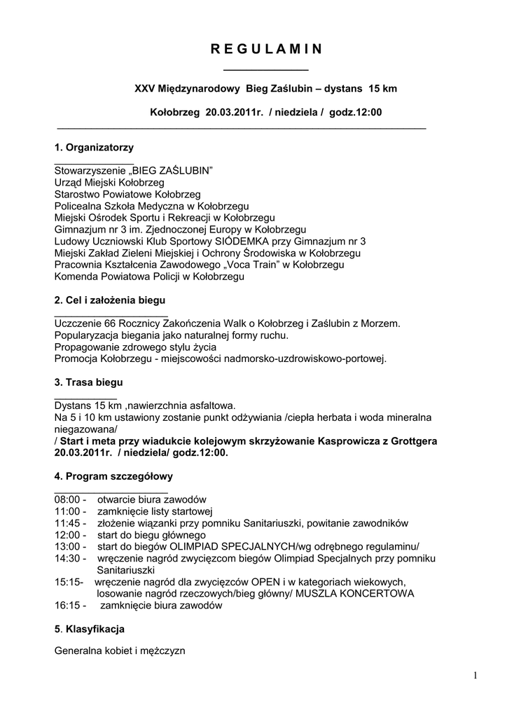 REGULAMIN _______________ XXV Międzynarodowy Bieg Zaślubin – dystans 15 km Kołobrzeg 20.03.2011r. / niedziela / godz.12:00 _________________________________________________________________ 1. Organizatorzy ______________ Stowarzyszenie „BIEG ZAŚLUBIN” Urząd Miejski Kołobrzeg Starostwo Powiatowe Kołobrzeg Policealna Szkoła Medyczna w Kołobrzegu Miejski Ośrodek Sportu i Rekreacji w Kołobrzegu Gimnazjum nr 3 im. Zjednoczonej Europy w Kołobrzegu Ludowy Uczniowski Klub Sportowy SIÓDEMKA przy Gimnazjum nr 3 Miejski Zakład Zieleni Miejskiej i Ochrony Środowiska w Kołobrzegu Pracownia Kształcenia Zawodowego „Voca Train” w Kołobrzegu Komenda Powiatowa Policji w Kołobrzegu 2. Cel i założenia biegu ____________________ Uczczenie 66 Rocznicy Zakończenia Walk o Kołobrzeg i Zaślubin z Morzem. Popularyzacja biegania jako naturalnej formy ruchu. Propagowanie zdrowego stylu życia Promocja Kołobrzegu - miejscowości nadmorsko-uzdrowiskowo-portowej. 3. Trasa biegu ___________ Dystans 15 km ,nawierzchnia asfaltowa. Na 5 i 10 km ustawiony zostanie punkt odżywiania /ciepła herbata i woda mineralna niegazowana/ / Start i meta przy wiadukcie kolejowym skrzyżowanie Kasprowicza z Grottgera 20.03.2011r. / niedziela/ godz.12:00. 4. Program szczegółowy ____________________ 08:00 - otwarcie biura zawodów 11:00 - zamknięcie listy startowej 11:45 - złożenie wiązanki przy pomniku Sanitariuszki, powitanie zawodników 12:00 - start do biegu głównego 13:00 - start do biegów OLIMPIAD SPECJALNYCH/wg odrębnego regulaminu/ 14:30 - wręczenie nagród zwycięzcom biegów Olimpiad Specjalnych przy pomniku Sanitariuszki 15:15- wręczenie nagród dla zwycięzców OPEN i w kategoriach wiekowych, losowanie nagród rzeczowych/bieg główny/ MUSZLA KONCERTOWA 16:15 - zamknięcie biura zawodów 5. Klasyfikacja Generalna kobiet i mężczyzn 1 Mężczyźni Kobiety M16 16-19lat (1995-92) K16 16- 19lat (1995-92) M20 20-29lat (1991-82) K 20 20-29lat (1991-82) M30 30-39lat (1981-72) K 30 30-39lat (1981-72) M40 40-49lat (1971-62) K 40 40-49lat (1971-62) M50 50-59lat (1961-52) K 50 50-59lat (1961-52) M60 60-69lat (1951-42) K 60 60–69 lat (1951-42) M70 70-79lat (1941-32) K 70 70- 79 lat(1941-32) M80 80-i więcej lat (1931 i starsi) M Wojska Polskiego i służb mundurowych K + M Kategoria małżeńska - niepełnosprawni - amputacje kończyn dolnych, amputacje górne, niedowidzący i inne schorzenia - zapewniamy jednakowe upominki - stają poniżej podium Kategoria M 60-69 poświęcona pierwszemu organizatorowi 16 Biegów Zaślubin Witoldowi Janowskiemu III Mistrzostwa Kołobrzegu i Powiatu Kołobrzeskiego na dystansie 15km M 16 – 39 lat (1995- 72) M 40 - 49 lat (1971- 62) M 50 - 59 lat (1961-52) M 60 - i więcej (1951 i więcej K 16 – 39 lat (1995-72) K 40 i więcej (1971 i więcej) 6. Nagrody _________ Mężczyźni - klasyfikacja generalna miejsca I-VI Kobiet - klasyfikacja generalna miejsca I-IV Zawodnicy i zawodniczki otrzymają puchary. Nagrody pieniężne wg odrębnego regulaminu. W kategoriach wiekowych K i M miejsca I-III puchary i dyplomy Przewiduje się puchar dla najstarszego zawodnika. Upominki rzeczowe za ukończenie 25 i 24 biegów/3 zawodników/ Wszyscy uczestnicy, którzy ukończą bieg otrzymają pamiątkowe medale, dyplomy Mistrzostwa Kołobrzegu. Mężczyźni klasyfikacja generalna I - III Kobiety klasyfikacja generalna kobiet I- III Zawodnicy i zawodniczki otrzymają puchary Nagrody pieniężne wg. odrębnego regulaminu W kategoriach wiekowych K i M za miejsca I – III puchary i dyplomy 7. Uczestnictwo _____________ Do startu dopuszczeni zostaną zawodnicy którzy ukończą przed 20 marca 2011 16-ty rok życia -dokonają weryfikacji w Biurze Zawodów, -przedstawią zaświadczenie lekarskie stwierdzające zdolność do udziału w biegu długodystansowym lub złożą oświadczenie wyrażające zgodę na udział w biegu na własną 2 odpowiedzialność podpisane własnoręcznie (podstawa prawna: Dz.U.nr 101 poz.1095 z dn.12.09.2001) UWAGA ! Warunkiem dopuszczenia osób niepełnoletnich do startu jest obecność rodzica lub opiekuna prawnego(legitymującego się dokumentem ze zdjęciem) w momencie weryfikacji zawodnika w Biurze Zawodów lub posiadanie i przedłożenie, podczas weryfikacji zawodnika, pozwolenia na udział w biegach, podpisanego przez rodzica lub opiekuna, wraz z numerem PESEL. Pobranie numeru startowego przez zawodnika będzie równoznaczne z akceptacją regulaminu biegu. Każdy zawodnik ma obowiązek zapoznać się z regulaminem biegu i zobowiązany jest do jego przestrzegania. 8. Sprawy finansowe _________________ Koszty organizacyjne ponoszą organizatorzy. Koszty osobowe ponoszą uczestnicy lub jednostki delegujące. Od zgłaszających się do biegu pobierana będzie opłata startowa: Wpłaty do - data 15.03.2011 16.03.- 19.03.2011 20.03.2011 Kwota 20,00 zł 30,00 zł 40,00 zł Z opłaty startowej zwolnieni są emeryci ,którzy ukończyli 65 lat mężczyźni i 60 lat kobiety a także członkowie założyciele Stowarzyszenia Bieg Zaślubin.( 8 osób) Wpisowe należy wpłacać na konto organizatora : Stowarzyszenie BIEG ZAŚLUBIN Kołobrzeg ul. Kniewskiego 15/7 78-100 Kołobrzeg Konto PekaO S.A. 57 1240 6508 1111 0000 5413 1484 z dopiskiem: startowe 25 Bieg Zaślubin, Imię i nazwisko zawodnika i data urodzenia W przypadku wpłacenia na konto należy podczas pobierania numerów startowych okazać się dowodem wpłaty i dokumentem tożsamości. 9. Zgłoszenia ___________ Należy przesłać w formie pisemnej lub elektronicznej na adres organizatora do dnia 18.03.2011r . Adres organizatora: Stowarzyszenie Bieg Zaślubin ul. Kniewskiego 15/7, 78-100 Kołobrzeg Tel/fax. 94 3540689, Tel. Kom. 605661480 e-mail [email protected] , Strona internetowa biegu: www.bieg.kolobrzerzeg.pl W przypadku zgłoszenia listownego dane powinny zawierać: 3 Nazwisko imię, Adres: kod, miejscowość, ulicę, nr domu, Kogo reprezentuje :klub Data urodzenia: dzień miesiąc rok. Lub na