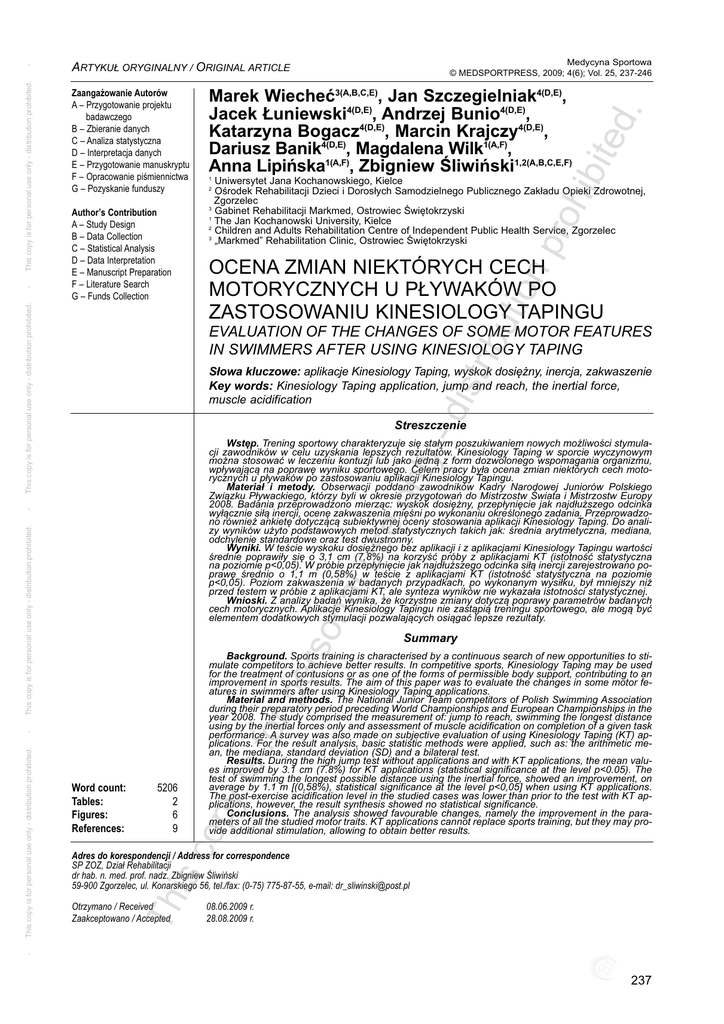 ed . tio np roh ibit Marek Wiecheć3(A,B,C,E), Jan Szczegielniak4(D,E), Jacek Łuniewski4(D,E), Andrzej Bunio4(D,E), Katarzyna Bogacz4(D,E), Marcin Krajczy4(D,E), Dariusz Banik4(D,E), Magdalena Wilk1(A,F), Anna Lipińska1(A,F), Zbigniew Śliwiński1,2(A,B,C,E,F) 1 Uniwersytet Jana Kochanowskiego, Kielce Ośrodek Rehabilitacji Dzieci i Dorosłych Samodzielnego Publicznego Zakładu Opieki Zdrowotnej, Zgorzelec 3 Gabinet Rehabilitacji Markmed, Ostrowiec Świętokrzyski 1 The Jan Kochanowski University, Kielce 2 Children and Adults Rehabilitation Centre of Independent Public Health Service, Zgorzelec 3 „Markmed” Rehabilitation Clinic, Ostrowiec Świętokrzyski 2 ibu OCENA ZMIAN NIEKTÓRYCH CECH MOTORYCZNYCH U PŁYWAKÓW PO ZASTOSOWANIU KINESIOLOGY TAPINGU dis tr EVALUATION OF THE CHANGES OF SOME MOTOR FEATURES IN SWIMMERS AFTER USING KINESIOLOGY TAPING Słowa kluczowe: aplikacje Kinesiology Taping, wyskok dosiężny, inercja, zakwaszenie Key words: Kinesiology Taping application, jump and reach, the inertial force, muscle acidification ly - Streszczenie rso na lu This copy is for personal use only - distribution prohibited. se - on Wstęp. Trening sportowy charakteryzuje się stałym poszukiwaniem nowych możliwości stymulacji zawodników w celu uzyskania lepszych rezultatów. Kinesiology Taping w sporcie wyczynowym można stosować w leczeniu kontuzji lub jako jedną z form dozwolonego wspomagania organizmu, wpływającą na poprawę wyniku sportowego. Celem pracy była ocena zmian niektórych cech motorycznych u pływaków po zastosowaniu aplikacji Kinesiology Tapingu. Materiał i metody. Obserwacji poddano zawodników Kadry Narodowej Juniorów Polskiego Związku Pływackiego, którzy byli w okresie przygotowań do Mistrzostw Świata i Mistrzostw Europy 2008. Badania przeprowadzono mierząc: wyskok dosiężny, przepłynięcie jak najdłuższego odcinka wyłącznie siłą inercji, ocenę zakwaszenia mięśni po wykonaniu określonego zadania. Przeprowadzono również ankietę dotyczącą subiektywnej oceny stosowania aplikacji Kinesiology Taping. Do analizy wyników użyto podstawowych metod statystycznych takich jak: średnia arytmetyczna, mediana, odchylenie standardowe oraz test dwustronny. Wyniki. W teście wyskoku dosiężnego bez aplikacji i z aplikacjami Kinesiology Tapingu wartości średnie poprawiły się o 3,1 cm (7,8%) na korzyść próby z aplikacjami KT (istotność statystyczna na poziomie p<0,05). W próbie przepłynięcie jak najdłuższego odcinka siłą inercji zarejestrowano poprawę średnio o 1,1 m (0,58%) w teście z aplikacjami KT (istotność statystyczna na poziomie p<0,05). Poziom zakwaszenia w badanych przypadkach, po wykonanym wysiłku, był mniejszy niż przed testem w próbie z aplikacjami KT, ale synteza wyników nie wykazała istotności statystycznej. Wnioski. Z analizy badań wynika, że korzystne zmiany dotyczą poprawy parametrów badanych cech motorycznych. Aplikacje Kinesiology Tapingu nie zastąpią treningu sportowego, ale mogą być elementem dodatkowych stymulacji pozwalających osiągać lepsze rezultaty. Summary 5206 2 6 9 is c Word count: Tables: Figures: References: y is - for pe Background. Sports training is characterised by a continuous search of new opportunities to stimulate competitors to achieve better results. In competitive sports, Kinesiology Taping may be used for the treatment of contusions or as one of the forms of permissible body support, contributing to an improvement in sports results. The aim of this paper was to evaluate the changes in some motor features in swimmers after using Kinesiology Taping applications. Material and methods. The National Junior Team competitors of Polish Swimming Association during their preparatory period preceding World Championships and European Championships in the year 2008. The study comprised the measurement of: jump to reach, swimming the longest distance using by the inertial forces only and assessment of muscle acidification on completion of a given task performance. A survey was also made on subjective evaluation of using Kinesiology Taping (KT) applications. For the result analysis, basic statistic methods were applied, such as: the arithmetic mean, the mediana, standard deviation (SD) and a bilateral test. Results. During the high jump test without applications and with KT applications, the mean values improved by 3.1 cm (7.8%) for KT applications (statistical significance at the level p<0.05). The test of swimming the longest possible distance using the inertial force, showed an improvement, on average by 1.1 m [(0,58%), statistical significance at the level p<0,05] when using KT applications. The post-exercise acidification level in the studied cases was lower than prior to the test with KT applications, however, the result synthesis showed no statistical significance. Conclusions. The analysis showed favourable changes, namely the improvement in the parameters of all the studied motor traits. KT applications cannot replace sports training, but they may provide additional stimulation, allowing to obtain better results. op This copy is for personal use only - distribution prohibited. Author’s Contribution A – Study Design B – Data Collection C – Statistical Analysis D – Data Interpretation E – Manuscript Preparation F – Literature Search G – Funds Collection This copy is for personal use only - distribution prohibited. - Zaangażowanie Autorów A – Przygotowanie projektu badawczego B – Zbieranie danych C – Analiza statystyczna D – Interpretacja danych E – Przygotowanie manuskryptu F – Opracowanie piśmiennictwa G – Pozyskanie funduszy Th Adres do korespondencji / Address for correspondence SP ZOZ, Dział Rehabilitacji dr hab. n. med. prof. nadz. Zbigniew Śliwiński 59-900 Zgorzelec, ul. Konarskiego 56, tel./fax: (0-75) 775-87-55, e-mail: [email protected] Otrzymano / Received Zaakceptowano / Accepted 08.06.2009 r. 28.08.2009 r. - This copy is for perso