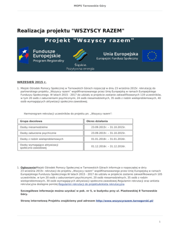 MOPS Tarnowskie Góry Realizacja projektu "WSZYSCY RAZEM" WRZESIEŃ 2015 r. 1. Miejski Ośrodek Pomocy Społecznej w Tarnowskich Górach rozpoczął w dniu 23 września 2015r. rekrutację do partnerskiego projektu „Wszyscy razem” współfinansowanego przez Unię Europejską w ramach Europejskiego Funduszu Społecznego. W latach 2015 - 2017 do udziału w projekcie zostanie zakwalifikowanych 119 uczestników, w tym 20 osób z zaburzeniami psychicznymi, 24 osób niesamodzielnych, 35 osób z rodzin wieloproblemowych, 40 osób wymagających aktywizacji społeczno-zawodowej. Harmonogram rekrutacji uczestników do projektu pn. „Wszyscy razem": Grupa docelowa Okres działania Osoby niesamodzielne 23.09.2015r. – 31.10.2015r. Osoby zaburzone psychicznie 23.09.2015r. – 31.10.2015r. Osoby z rodzin wieloproblemowych 01.01.2016r. – 31.01.2016r. Osoby wymagające aktywizacji społeczno-zawodowej 01.12.2016r. – 31.12.2016r. 1. OgłoszenieMiejski Ośrodek Pomocy Społecznej w Tarnowskich Górach informuje o rozpoczętej w dniu 23 września 2015r. rekrutacji do projektu „Wszyscy razem” współfinansowanego przez Unię Europejską w ramach Europejskiego Funduszu Społecznego.W latach 2015 - 2017 do udziału w projekcie zostanie zakwalifikowanych 105 uczestników, w tym 20 osób z zaburzeniami psychicznymi, 20 osób niesamodzielnych, 35 osób z rodzin wieloproblemowych, 30 osób wymagających aktywizacji społeczno-zawodowej.Regulamin rekrutacji oraz ankieta rekrutacyjna dostępne poniżej:Regulamin rekrutacji do projektuAnkieta rekrutacyjna Szczegółowe informacje można uzyskać w pok. nr 5, w budynku przy ul. Piastowskiej 8 Tarnowskie Góry. Stronę internetową Projektu znajdziemy pod adresem http://www.wszyscyrazem.tarnogorski.pl/ 1 MOPS Tarnowskie Góry PAŹDZIERNIK 2015 r. We wrześniu 2015r. zgodnie z harmonogramem rozpoczęła się rekrutacja uczestników i uczestniczek projektu. Zgodnie z wnioskiem o dofinasowanie grupa docelowa składa się z 24 osób niesamodzielnych/starszych oraz 20 osób zaburzonych psychicznie. Rekrutacja uczestników i uczestniczek do projektu miała charakter otwarty i odbywała się w poszanowaniu zasady równości płci. Informacje o realizacji projektu były dostępne w takich miejscach jak: tablice ogłoszeń, strona internetowa czy bezpośrednio informacja w MOPS. Zespół projektowy wraz z pracownikami socjalnymi weryfikowali ankiety rekrutacyjne z zachowaniem dbałości w stosowaniu zasady równości szans kobiet i mężczyzn. LISTOPAD – GRUDZIEŃ 2015 r. 1. W okresie od listopada do grudnia br. pracownicy socjalni rozpoczęli podpisywanie kontraktów socjalnych klientami MOPS zakwalifikowanymi do udziału w Po podpisaniu kontraktów zostaną opracowane ścieżki reintegracji dla każdego uczestnika projektu, które pozwolą zaproponować udział w działaniach pomocowych dopasowanych do indywidualnych potrzeb uczestnika. 1. Biuro projektu „Wszyscy razem” Miejskiego Ośrodka Pomocy Społecznej w Tarnowskich Górach rozpoczęło przygotowania do zakupu min. sprzętu fitness, łóżka i fotela do masażu. Sprzęt sportowy zakupiony z dotacji EFS będzie wykorzystany do prowadzenia zajęć gimnastyczno – rehabilitacyjnych z osobami niesamodzielnymi i zaburzonymi psychicznie. Dodatkowo zostanie zakupionych 5 laptopów, które będą służyły uczestnikom projektu do nauki obsługi komputera. STYCZEŃ - LUTY 2016 r. 1. Rozpoczął się II etap rekrutacji uczestników projektu. Rekrutacja dotyczy 35 osób pochodzących z rodzin, które wymagają wsparcia w procesie wychowawczym. Uczestnikami projektu mogą być dzieci i osoby dorosłe. Rekrutację będą prowadzili pracownicy socjalni, którzy znają potrzeby rodzin korzystających z pomocy MOPS. 1. W styczniu rozpoczęliśmy przygotowania do wszczęcia postępowania ofertowego w celu zakupu artykułów spożywczych niezbędnych do przygotowania serwisu kawowego, laptopów oraz wynajmu sali szkoleniowej z przeznaczeniem na poprowadzenie zajęć grupy samopomocowej, indywidualnego poradnictwa psychologicznego dla osób zaburzonych psychicznie oraz indywidualnych konsultacji logopedycznych dla rodzin wieloproblemowych . Pierwszy etap prac obejmował wycenę wartości zamówienia. W kolejnych etapach zostanie wybrana firma, która zrealizuje zamówienie. MARZEC 2016 r. 1. W marcu została wybrana terapeutka zajęciowa, która poprowadzi z osobami niesamodzielnymi i zaburzonymi psychicznie zajęcia z choreoterapii i arteterapii. Wyboru dokonano zgodnie z Regulaminem Zamówień Publicznych w MOPS. Podpisaliśmy umowy na zakup biletów do kina (OLBRZYM w Tarnowskich Górach) i na basen (PARK WODNY Tarnowskie Góry). Rozpoczęliśmy przygotowania do wszczęcia postępowania w celu przeprowadzenia pogłębionej diagnozy psychologicznej dla osób z rodzin wieloproblemowych. 1. W marcu dla grupy 44 osób w zależności od indywidualnych potrzeb prowadzono: zajęcia gimnastyczne, indywidualne poradnictwo psychologiczne, grupę samopomocowa, zajęcia komputerowe i logopedyczne, zajęcia nauki czytania i pisania. Zajęcia prowadzą zaangażowani w projekt specjaliści (pracownicy) MOPS. 2 MOPS Tarnowskie Góry 1. W okresie od 9 marca do 23 marca zgodnie z harmonogramem przeprowadzono warsztaty Wen Do, w których udział wzięły 22 uczestniczki projektu. Warsztaty asertywności i samoobrony skierowane do kobiet miały na celu wzmocnić poczucie bezpieczeństwa u uczestniczek projektu. KWIECIEŃ 2016 r. 1. Dla osób niesamodzielnych i zaburzonych psychicznie odbyły się pierwsze zajęcia z choreoterapii prowadzone przez terapeutkę. Zajęcia zaplanowane są 1-2 razy w miesiącu do listopada 2016r. Opisywana grupa docelowa rozpoczęła także kulturoterapię poprzez wyjścia do kina i hydroterapię poprzez wyjścia na basen. Wszystkie działania są omawiane, a postępy wzmacniane na grupie samopomocowej. W czasie takich spotkań wypływają kolejne potrzeby uczestników projektu, które w miarę możliwośc