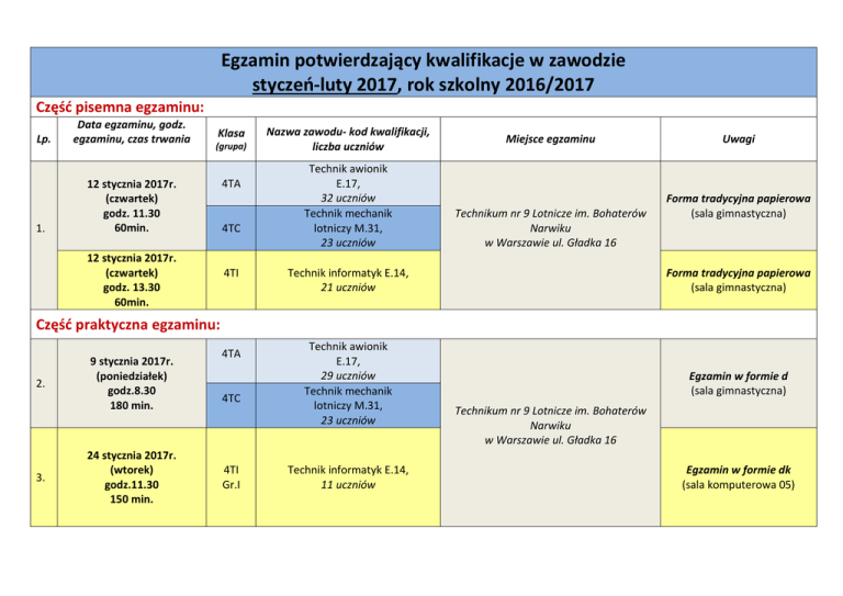 Egzamin potwierdzający kwalifikacje w zawodzie styczeń-luty 2017, rok szkolny 2016/2017 Część pisemna egzaminu: Lp. Data egzaminu, godz. egzaminu, czas trwania 1. 12 stycznia 2017r. (czwartek) godz. 11.30 60min. Klasa (grupa) 12 stycznia 2017r. (czwartek) godz. 13.30 60min. 4TA 4TC 4TI Nazwa zawodu- kod kwalifikacji, liczba uczniów Technik awionik E.17, 32 uczniów Technik mechanik lotniczy M.31, 23 uczniów Miejsce egzaminu Technikum nr 9 Lotnicze im. Bohaterów Narwiku w Warszawie ul. Gładka 16 Uwagi Forma tradycyjna papierowa (sala gimnastyczna) Technik informatyk E.14, 21 uczniów Forma tradycyjna papierowa (sala gimnastyczna) Technik awionik E.17, 29 uczniów Technik mechanik lotniczy M.31, 23 uczniów Egzamin w formie d (sala gimnastyczna) Część praktyczna egzaminu: 2. 3. 9 stycznia 2017r. (poniedziałek) godz.8.30 180 min. 24 stycznia 2017r. (wtorek) godz.11.30 150 min. 4TA 4TC 4TI Gr.I Technik informatyk E.14, 11 uczniów Technikum nr 9 Lotnicze im. Bohaterów Narwiku w Warszawie ul. Gładka 16 Egzamin w formie dk (sala komputerowa 05) 4. 25 stycznia 2017r. (środa) godz.11.30 150 min. 4TI Gr.II Technik informatyk E.14, 10 uczniów Technikum nr 9 Lotnicze im. Bohaterów Narwiku w Warszawie ul. Gładka 16 Szczegółowe listy uczniów/absolwentów zostały wywieszone na tablicy informacyjnej obok sali lekcyjnej 25. Egzamin w formie dk (sala komputerowa 05)