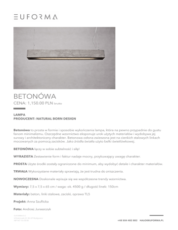 BETONÓWA CENA: 1,150.00 PLN brutto LAMPA PRODUCENT: NATURAL BORN DESIGN Betonówa to prosta w formie i sposobie wykończenia lampa, która na pewno przypadnie do gustu fanom minimalizmu. Oszczędne wzornictwo eksponuje urok użytych materiałów i wydobywa jej surowy i architektoniczny charakter. Betonowa osłona zwieszona jest na cienkich stalowych linkach mocowanych za pomocą zacisków. Jako źródła światła użyto belki świetlówkowej. BETONÓWA łączy w sobie subtelność i siłę! WYRAZISTA Zestawienie form i faktur nadaje mocny, przykuwający uwagę charakter. PROSTA Użyte środki zostały ograniczone do minimum, aby wydobyć detale i charakter materiałów. TRWAŁA Wykorzystane materiały sprawiają, że jest trudna do zniszczenia. NOWOCZESNA Doskonale wpisuje się we współczesne trendy wzornictwa. Wymiary: 7,5 x 7,5 x 65 cm / waga: ok. 4500 g / długość linek: 150cm Materiały: beton, linki stalowe, zaciski, oprawa TL5 Projekt: Anna Szuflicka Foto: Andrzej Juraszczyk Czas oczekiwania: około 3 tygodni Powered by TCPDF (www.tcpdf.org)