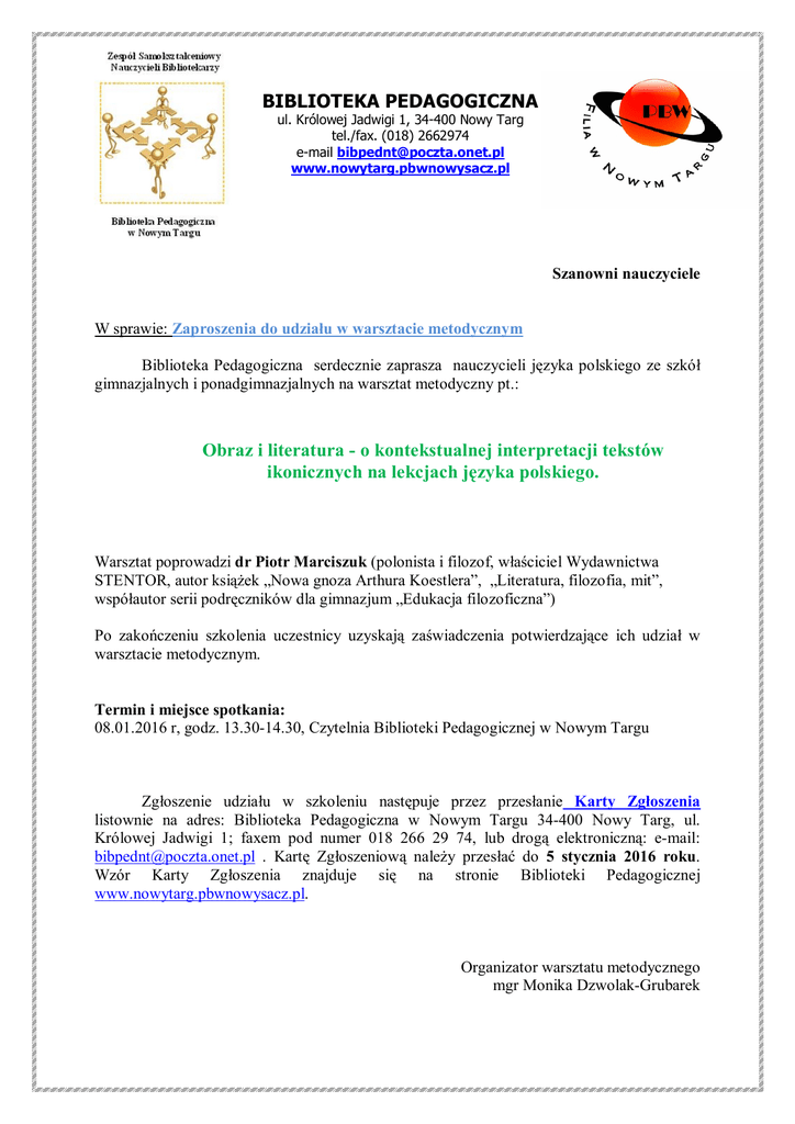 BIBLIOTEKA PEDAGOGICZNA ul. Królowej Jadwigi 1, 34-400 Nowy Targ tel./fax. (018) 2662974 e-mail [email protected] www.nowytarg.pbwnowysacz.pl Szanowni nauczyciele W sprawie: Zaproszenia do udziału w warsztacie metodycznym Biblioteka Pedagogiczna serdecznie zaprasza nauczycieli języka polskiego ze szkół gimnazjalnych i ponadgimnazjalnych na warsztat metodyczny pt.: Obraz i literatura - o kontekstualnej interpretacji tekstów ikonicznych na lekcjach języka polskiego. Warsztat poprowadzi dr Piotr Marciszuk (polonista i filozof, właściciel Wydawnictwa STENTOR, autor książek „Nowa gnoza Arthura Koestlera”, „Literatura, filozofia, mit”, współautor serii podręczników dla gimnazjum „Edukacja filozoficzna”) Po zakończeniu szkolenia uczestnicy uzyskają zaświadczenia potwierdzające ich udział w warsztacie metodycznym. Termin i miejsce spotkania: 08.01.2016 r, godz. 13.30-14.30, Czytelnia Biblioteki Pedagogicznej w Nowym Targu Zgłoszenie udziału w szkoleniu następuje przez przesłanie Karty Zgłoszenia listownie na adres: Biblioteka Pedagogiczna w Nowym Targu 34-400 Nowy Targ, ul. Królowej Jadwigi 1; faxem pod numer 018 266 29 74, lub drogą elektroniczną: e-mail: [email protected] . Kartę Zgłoszeniową należy przesłać do 5 stycznia 2016 roku. Wzór Karty Zgłoszenia znajduje się na stronie Biblioteki Pedagogicznej www.nowytarg.pbwnowysacz.pl. Organizator warsztatu metodycznego mgr Monika Dzwolak-Grubarek