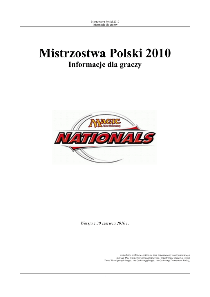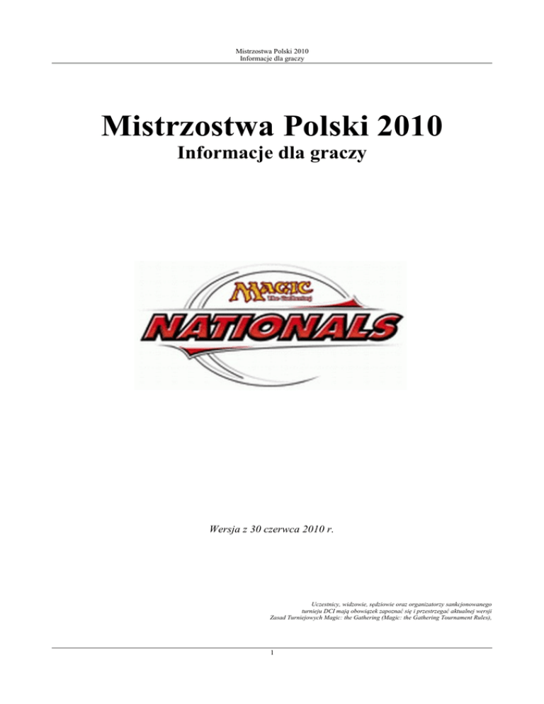 Mistrzostwa Polski 2010 Informacje dla graczy Mistrzostwa Polski 2010 Informacje dla graczy Wersja z 30 czerwca 2010 r. Uczestnicy, widzowie, sędziowie oraz organizatorzy sankcjonowanego turnieju DCI mają obowiązek zapoznać się i przestrzegać aktualnej wersji Zasad Turniejowych Magic: the Gathering (Magic: the Gathering Tournament Rules), 1 Mistrzostwa Polski 2010 Informacje dla graczy 1. SPRAWY ORGANIZACYJNE 1.1. Lokalizacja Hotel Gromada - sala Koral ul. 17 Stycznia 32 Warszawa 1.2. Dojazd Z Dworca Centralnego: Autobus nr 175. Czas przejazdu ok. 30 minut. W piątek czas dojazdu może być dłuższy. Z Dworca Zachodniego: Autobus nr 154. Czas przejazdu ok. 30 minut. W piątek czas dojazdu może być dłuższy. 1.3. Termin rozgrywek Mistrzostwa Polski 2010 odbędą się w dniach 3-4 lipca 2010 r. Dzień wcześniej (2. lipca) odbędą się turnieje kwalifikacyjne ostatniej szansy – Grindery. 1.4. Noclegi Noclegi należy zapewnić sobie we własnym zakresie. 1.5. Przydatne informacje w Internecie Najnowsze informacje o Mistrzostwach Polski: Strona firmy ISA Informacje o Warszawie: Plan Warszawy Rozkład komunikacji miejskiej Strona Hotelu Gromada 1.6. Wybory Prezydenta Rzeczypospolitej Polskiej Najbliższa Komisja Wyborcza znajduje się w Przedszkolu nr 175, ul. Astronautów 5 Lokalizacja najbliższej Komisji Wyborczej 2 Mistrzostwa Polski 2010 Informacje dla graczy 2. ZASADY OBOWIĄZUJĄCE PODCZAS MISTRZOSTW POLSKI 2.1. Widzowie Widzowie mogą oglądać przebieg meczów. Muszą jednak przestrzegać następujących reguł: – Nie wolno rozmawiać z graczami i między sobą. – Należy umożliwić sędziom swobodne przejście i dostęp do stolików, przy których odbywają się mecze. – Widzom nie wolno siadać przy stolikach. – Nie wolno przestawiać krzeseł, stołów, numerów stolików. – Gracz ma prawo poprosić sędziego o odsunięcie widza od stolika, przy którym gra, bez podania przyczyny. Osoby, które zauważyły złamanie zasad gry bądź DCI, powinny niezwłocznie powiadomić sędziego. W żadnym wypadku NIE wolno interweniować samodzielnie, można jedynie poprosić graczy, aby przerwali grę. Na terenie Mistrzostw Polski obowiązuje zakaz spożywania alkoholu i palenia. Sędzia główny, organizator lub kierownictwo obsługi obiektu mogą zakazać wstępu na teren Mistrzostw Polski osobom nieprzestrzegającym powyższych zasad lub innych obowiązujących regulaminów. 2.2. Prasa Przebieg meczów i draftów mogą notować, fotografować lub nagrywać wyłącznie osoby, które uzyskały zgodę sędziego głównego. Osoby, które chcą relacjonować mecze, w szczególności mecze pokazowe (ang. feature match), powinny skontaktować się wcześniej z sędzią głównym. 2.3. Uczestnicy Mistrzostw Polski Uczestnicy Mistrzostw Polski są zobowiązani do przestrzegania zasad, o których mowa w punkcie 2.1. Widzowie. Ponadto: – na stołach do gry nie wolno stawiać napojów i jedzenia; – na prośbę sędziego ze stołu należy usunąć maskotki, pudełka na karty itp. 2.4. Mecze pokazowe W każdej rundzie jedna lub więcej par graczy może zostać wybrana do meczu pokazowego. Mecze te rozgrywa się w specjalnie do tego wyznaczonym miejscu. Gracz nie może odmówić uczestnictwa w takim meczu i jest zobowiązany ujawnić osobie relacjonującej przebieg rozgrywki swoje decyzje dotyczące wymiany kart pomiędzy talią a talią pomocniczą (ang. sideboard). 2.5. Telefony komórkowe Na terenie Mistrzostw Polski obowiązuje zakaz rozmawiania przez telefony komórkowe. Aparaty powinny mieć wyciszony dzwonek. Sędzia główny może uchylić tę zasadę w wyjątkowych okolicznościach na indywidualną prośbę uczestnika. 3 Mistrzostwa Polski 2010 Informacje dla graczy 3. DODATKOWE ATRAKCJE 3.1. Grinder A Data: Format: Nagrody: Koszt: Rejestracja: Start turnieju: Uwagi: 2 lipca 2010 (piątek) Standard, system pucharowy (single-elimination) 4 zaproszenia na Mistrzostwa Polski 25 zł 11.00-11.30 11.30 po wyłonieniu Top 4 turniej nie będzie kontynuowany Grinder B Data: Format: Nagrody: Koszt: Rejestracja: Start turnieju: Uwagi: 2 lipca 2010 (piątek) Standard, system pucharowy (single-elimination) 4 zaproszenia na Mistrzostwa Polski 25 zł 16.00-16.30 16.30 po wyłonieniu Top 4 turniej nie będzie kontynuowany 3.2. Egzaminy sędziowskie Egzaminy sędziowskie przeprowadza Paweł Kazimierczuk. Osoby pragnące zdawać egzamin sędziowski powinny przesłać taką informację na adres amplitur[maupa]wp.pl. Egzamin sędziowski wymaga wcześniejszego przygotowania, w tym nauczenia się zasad gry oraz zasad turniejowych, a także zaliczonego Rules Advisor Test (http://judge.wizards.com). Od kandydatów będzie wymagane sędziowanie podczas wszystkich trzech dni Mistrzostw Polski. 3.3. Turnieje otwarte (Public events) Przewiduje się następujące turnieje towarzyszące podczas Mistrzostw Polski: Piątek: 11.00 – GPT Göteborg (Sealed Deck) wpisowe 80 zł, nagrody: 200 zł + box dla każdego zdobywcy bye 11.30 – Grinder A (patrz wyżej) 15.30 – Turniej „Na Życzenie” (Draft) wpisowe 130 zł, pula nagród: 100 zł za każdego uczestnika 16.30 – Grinder B (patrz wyżej) 17.00 – Turniej „Na Życzenie Bis” (Legacy) wpisowe 40 zł, pula nagród: boostery starych edycji i inne Sobota: cały dzień – dowolny format, start od razu po zebraniu ośmiu chętnych Niedziela: 11.15 – PTQ Amsterdam (Standard) wpisowe 45 zł, nagrody: bilet dla zwycięzcy oraz nagrody pocieszenia dla Top 8 4 Mistrzostwa Polski 2010 Informacje dla graczy Ponadto, codziennie będą się odbywać sankcjonowane turnieje Booster Draft i Constructed. Początek każdego turnieju od razu po zebraniu ośmiu chętnych. Wpisowe: Constructed – 15 zł, pula nagród: booster za każdego uczestnika Booster Draft – 30 zł / 24 zł (zależnie od edycji), nagrody: zestaw draftowy dla zwycięzcy Booster Draft promocyjny – 10 zł / 5 zł / 3 zł (zależnie od edycji) Podobnie jak w zeszłym roku, firma ISA