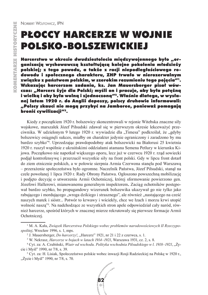 komentarze historyczne Norbert Wójtowicz, IPN Płoccy harcerze w wojnie polsko-bolszewickiej Harcerstwo w okresie dwudziestolecia międzywojennego było „organizacją wychowawczą kształtującą kolejne pokolenia młodzieży polskiej; z tego powodu, a także z racji niepodległościowego rodowodu i społecznego charakteru, ZHP trwało w nierozerwalnym związku z państwem polskim, w szerokim rozumieniu tego pojęcia”. Wskazując harcerzom zadania, ks. Jan Mauersberger pisał wówczas: „Harcerz żyje dla Polski; myśli on i pracuje, aby była potężną i wielką i aby była wolną i zjednoczoną” . Właśnie dlatego, w wysłanej latem 1920 r. do Anglii depeszy, polscy druhowie informowali: „Polscy skauci nie mogą przybyć na Jamboree, ponieważ pomagają bronić cywilizacji”. Kiedy z początkiem 1920 r. bolszewicy skoncentrowali w rejonie Witebska znaczne siły wojskowe, marszałek Józef Piłsudski zdawał się w pierwszym okresie lekceważyć przeciwnika. W udzielonym 9 lutego 1920 r. wywiadzie dla „Timesa” podkreślał, że „gdyby bolszewicy osiągnęli sukces, miałby on charakter jedynie ograniczony i zaradzono by mu bardzo szybko”. Uprzedzając prawdopodobny atak bolszewicki na Białorusi 25 kwietnia 1920 r. ruszył wspólnie z ukraińskimi oddziałami atamana Semena Petlury w kierunku Kijowa. Początkowo nie napotkał większego oporu, lecz już w czerwcu 1920 r. rząd sowiecki podjął kontrofensywę i przerzucił wszystkie siły na front polski. Gdy w lipcu front dotarł do ziem etnicznie polskich, a w połowie sierpnia Armia Czerwona stanęła pod Warszawą – przerażenie społeczeństwa było ogromne. Naczelnik Państwa, Józef Piłsudski, stanął na czele powołanej 1 lipca 1920 r. Rady Obrony Państwa. Ogłoszono powszechną mobilizację i podjęto decyzję o utworzeniu Armii Ochotniczej, której sformowanie powierzono gen. Józefowi Hallerowi, mianowanemu generalnym inspektorem. Zaciąg ochotników postępował bardzo szybko, bo propagandowy wizerunek bolszewika ukazywał go nie tylko jako rabującego i mordującego „wroga dzikiego i strasznego”, ale również „nastającego na cześć naszych matek i sióstr... Potwór to krwawy i wściekły, chce we łzach i morzu krwi utopić wolność naszą”. Na nadchodzące ze wszystkich stron apele odpowiedział cały naród, również harcerze, spośród których w znacznej mierze rekrutowały się pierwsze formacje Armii Ochotniczej. M. A. Kała, Związek Harcerstwa Polskiego wobec problemów narodowościowych II Rzeczypospolitej, Wrocław 1996, s. 1, mps. J. Mauersberger, Do harcerzy!, „Harcerz” 1921, nr 21 i 22 z czerwca, s. 1. W. Nekrasz, Harcerze w bojach w latach 1914–1921, Warszawa 1931, cz. 2, s. 8. Cyt. za: A. Czubiński, Wiatr od wschodu. Polityka wschodnia Piłsudskiego w l. 1918–1921, „Życie i Myśl” 1990, nr 7/8, s. 39. Cyt. za: H. Lisiak, Społeczeństwo polskie wobec inwazji Rosji Radzieckiej na Polskę w 1920 r., „Życie i Myśl” 1990, nr 7/8, s. 70. 82 Pogotowie harcerstwa płockiego, „Kurier Płocki” 1920, nr 158 z 9 VII, s. 4. Rozkaz do wszystkich dr-n harcerskich okręgu płockiego, „Kurier Płocki” 1920, nr 160 z 11 VII, s. 3. List Naczelnictwa ZHP do Rodziców, władz szkolnych i Kół Przyjaciół Harcerstwa, „Kurier Płocki” 1920, nr 167 z 20 VII, s. 4; Tekst tego dokumentu przedrukowany został również [w:] W. Nekrasz, Harcerze w bojach w latach 1914–1921. Cz. 2, Warszawa 1931, s. 12–13. Ibidem. 10 Odezwa Obywatelskiego Komitetu Wykonawczego Obrony Polski na powiat płocki, „Kurier Płocki” 1920, nr 174 z 28 VII, s. 1. 11 Cyt. za: R. Juszkiewicz, Obrona Płocka w 1920 roku, „Zapiski Ciechanowskie” t. 8, s. 120. Na podstawie „Żołnierz Polski” 1920, nr z 31 VIII; R. Juszkiewicz, Obrona Płocka w 1920, „Tygodnik Płocki” 1989, nr 16 z 16 IV, s. 9. 12 W. Sikorski, Nad Wisłą i Wkrą. Studium z polsko-rosyjskiej wojny 1920 roku, Lwów–Warszawa–Kraków 1928, s. 194. 13 I Drużyna Męska im. Szymona Kohorta, III Drużyna Męska im. Jana Kilińskiego, IV Drużyna Męska im. Bartosza Głowackiego, V Drużyna Męska im. Romualda Traugutta. 83 komentarze historyczne W zaistniałej sytuacji na początku lipca gen. Haller objął dowództwo także nad harcerstwem polskim. Po ogłoszeniu odezwy nowego Prezesa Harcerstwa Polskiego, „Kurier Płocki” z 9 lipca 1920 r. donosił. „Ruch ożywiony zapanował w harcerstwie płockim”. Wkrótce został ogłoszony rozkaz skierowany do wszystkich drużyn harcerskich okręgu płockiego: „Harcerstwo polskie staje w pogotowiu pod rozkazy Rady Obrony. Zorganizować stałą służbę komend i drużyn, nazwiska komendantów i ilość [sic!] młodzieży od lat 16 w górę zameldować niezwłocznie w Dowództwie Okręgu”. W „Kurierze Płockim” opublikowano 20 lipca „List Naczelnictwa ZHP do Rodziców, władz szkolnych i Kół Przyjaciół Harcerstwa”, w którym wzywano „do służby czynnej dla kraju wszystkich członków organizacji”. W liście przedstawiono możliwość pełnienia określonych zadań przez poszczególne grupy wiekowe. Znalazł się w nim również następujący passus: „[...] pragnąc zapobiec wypadkom nieposłuszeństwa i nieposzanowania woli rodzicielskiej przez bardziej zapaloną młodzież, uprasza się wszystkich Rodziców o zaopatrywanie nieletnich chłopców i dziewcząt w piśmienne pozwolenie na wstąpienie do służby ochotniczej. Młodzież szkolna, o ile to tylko ze względu na czas wakacyjny możliwe, winna mieć zezwolenie swej władzy szkolnej”. Tydzień później – 28 lipca – Obywatelski Komitet Wykonawczy Obrony Polski na powiat płocki wydał odezwę, w której nawoływał m.in.: „Mężczyźni zdolni do noszenia broni, czy z poboru czy na ochotnika – do wojska!”10. W wyniku akcji werbunkowej prowadzonej w powiecie płockim, do czynnej służby wojskowej zgłosiło się około tysiąc osób. Pisząc o walkach w obronie Płocka Sł