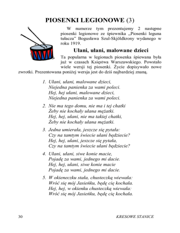 PIOSENKI LEGIONOWE (3) W numerze tym prezentujemy 2 następne piosenki legionowe ze śpiewnika „Piosenki leguna tułacza” Bogusława Szul-Skjöldkrony wydanego w roku 1919. Ułani, ułani, malowane dzieci Ta popularna w legionach piosenka śpiewana była już w czasach Księstwa Warszawskiego. Powstało wiele wersji tej piosenki. Życie dopisywało nowe zwrotki. Prezentowana poniżej wersja jest do dziś najbardziej znaną. 1. Ułani, ułani, malowane dzieci, Niejedna panienka za wami poleci. Hej, hej ułani, malowane dzieci, Niejedna panienka za wami poleci. 2. Nie ma tego domu, nie ma i tej chatki Żeby nie kochały ułana mężatki. Hej, hej, ułani, nie ma takiej chatki, Żeby nie kochały ułana mężatki. 3. Jedna umierała, jeszcze się pytała: Czy na tamtym świecie ułani będziecie? Hej, hej, ułani, jeszcze się pytała, Czy na tamtym świecie ułani będziecie? 4. Ułani, ułani, siwe konie macie, Pojadę za wami, jednego mi dacie. Hej, hej, ułani, siwe konie macie Pojadę za wami, jednego mi dacie. 5. W okieneczku stała, chusteczką wiewała: Wróć się mój Jasieńku, będę cię kochała. Hej, hej, w okienku chusteczką wiewała: Wróć się mój Jasieńku, będę cię kochała. 30 KRESOWE STANICE O Belinie Piosenka ta powstała w oddziale legendarnego rotmistrza BelinyPrażmowskiego na jesieni 1914 roku. Beliniacy mieli również inne popularne utwory na własny temat. Tego typu piosenki powstawały w okopach i na ułańskich kwaterach. l. Hej tam od Krakowa modra Wisła płynie, Szemrzą fale, fale szemrzą piosenki o Belinie. 2. Piosenki o Belinie i o jego sławie, Wyjm Belino swą szabelkę, prowadź ku Warszawie. 3. Brak naszym ułanom lanc i chorągiewek, Ale za to mają szczęście do sarmackich dziewek. 4. Gdy Moskale ujrzą ułańskie rabaty, Uciekną strachem zdjęte moskiewskie psubraty. 5. Hej tam pod Warszawą, kędy Wisła płynie, Szemrzą fale, fale szemrzą piosenki o Belinie. 6. Piosenki o Belinie i jego ułanach, Brzmij piosenko, brzmij ułańska, siej postrach w tyranach. Na podstawie „Złotej Księgi Pieśni Polskich” Zbigniewa Adrjańskiego wydanej przez Oficynę Wydawniczą VOLUMEN, Wydawnictwo BELLONA, Warszawa 1997 r, opracował Janusz Szuba. KRESOWE STANICE 31