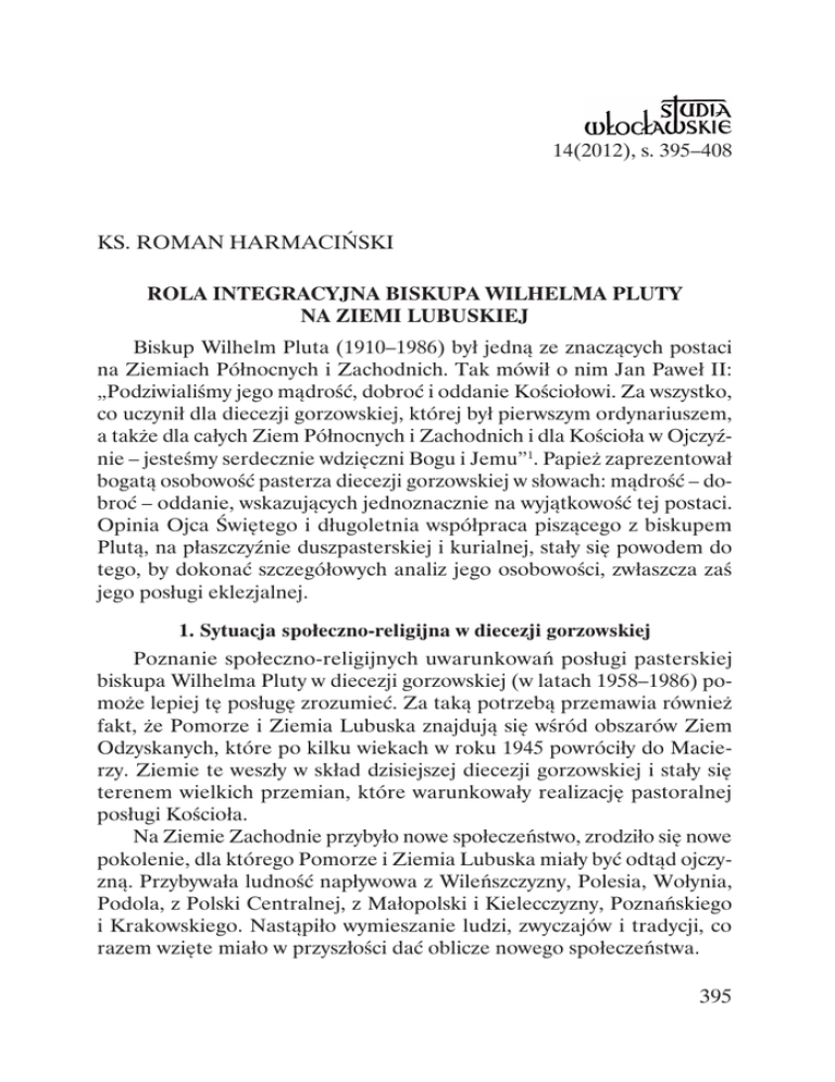 395 ks. Roman HaRmaciński Rola integRacyjna biskupa Wilhelma