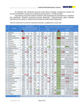 Okręgowa Komisja Egzaminacyjna w Jaworznie W szkołach dla młodzieży procent osób, które uzyskały świadectwo wynosi od 61,31% do 86,09%, natomiast w szkołach dla dorosłych – od 0% do 80%. Zauważamy znacznie większy odsetek osób uzyskujących świadectwo w szkołach dla młodzieży. Wyjątek stanowią powiaty kłobucki i częstochowski, gdzie odsetek sukcesów jest wyższy w szkołach dla dorosłych (mała liczba zdających). Tabela 26. Zdawalnośd w powiatach województw śląskiego z uwzględnieniem typów szkół Lp. Liczba zdających, którzy przystąpili do wszystkich egzaminów obowiązkowych Powiat 1. będzioski 2. 3. bielski Bielsko-Biała 4. 5. bieruosko-lędzioski Bytom 6. 7. Chorzów cieszyoski 8. 9. Częstochowa częstochowski 10. Dąbrowa Górnicza 11. Gliwice 12. gliwicki 13. Jastrzębie-Zdrój 14. Jaworzno 15. Katowice 16. kłobucki 17. lubliniecki 18. mikołowski 19. Mysłowice 20. myszkowski 21. Piekary Śląskie 22. pszczyoski 23. raciborski 24. Ruda Śląska 25. rybnicki 26. Rybnik 27. Siemianowice Śląskie 28. Sosnowiec 29. Świętochłowice 30. tarnogórski 31. Tychy 32. wodzisławski 33. Zabrze 34. zawierciaoski 35. Żory 36. żywiecki Zdający, którzy otrzymali świadectwo dojrzałości liczba LU LO LP LU T TU LO LP 505 410 1530 195 737 848 728 2816 94 751 1228 177 492 481 1968 206 323 370 310 284 170 497 512 361 75 909 239 984 155 761 760 676 915 623 323 662 108 1 29 27 30 96 62 90 2 23 48 39 39 32 20 0 0 27 65 71 1 58 54 15 42 18 73 87 - 62 36 20 41 59 9 38 62 37 34 38 5 8 11 13 11 16 8 34 30 5 43 5 26 4 10 44 39 48 18 27 30 173 162 972 154 473 332 593 1140 77 282 653 155 398 403 988 165 174 199 105 187 95 257 391 376 65 532 125 569 27 685 532 473 397 351 325 730 38 3 30 4 11 17 6 32 14 27 8 3 3 2 31 6 58 44 2 1 13 9 435 338 1398 188 622 723 685 2366 71 662 1101 153 383 417 1674 172 298 318 294 256 155 443 432 308 64 802 174 776 133 653 665 622 756 541 286 536 66 0 15 9 18 57 32 41 0 8 15 22 19 19 9 0 0 24 28 27 0 28 31 5 19 12 37 59 - 20 10 3 12 6 8 13 15 13 2 7 4 5 1 2 9 1 5 1 2 1 7 0 3 0 4 9 9 1 1 4 5 T TU LO 96 - 86,14 110 - 82,44 708 5 91,37 88 2 96,41 275 4 84,40 207 1 85,26 452 2 94,09 700 1 84,02 32 - 75,53 171 1 88,15 421 4 89,66 80 - 86,44 277 4 77,85 273 - 86,69 610 5 85,06 113 - 83,50 135 - 92,26 135 0 85,95 65 - 94,84 105 - 90,14 61 - 91,18 164 1 89,13 267 1 84,38 207 0 85,32 45 - 85,33 368 5 88,23 83 - 72,80 347 1 78,86 11 - 85,81 442 3 85,81 378 - 87,50 364 10 92,01 248 1 82,62 189 1 86,84 203 2 88,54 508 0 80,97 LP procent LU 61,11 0,00 51,72 33,33 60,00 59,38 51,61 45,56 0,00 34,78 31,25 56,41 48,72 59,38 45,00 88,89 43,08 38,03 0,00 48,28 57,41 33,33 45,24 66,67 50,68 67,82 - 32,26 27,78 15,00 29,27 10,17 88,89 34,21 24,19 35,14 5,88 18,42 80,00 62,50 9,09 15,38 81,82 6,25 62,50 2,94 6,67 20,00 16,28 0,00 11,54 0,00 40,00 20,45 23,08 2,08 5,56 14,81 16,67 T Razem 23075 1157 871 13715 362 19900 600 183 8938 54 86,24 51,86 21,01 65,17 Wydział Badań i Analiz Strona 32 z 49 TU 55,49 67,90 72,84 13,16 57,14 66,67 58,14 13,33 62,35 25,00 76,22 18,18 61,40 5,88 41,56 60,64 16,67 64,47 12,50 51,61 69,60 28,57 67,74 61,74 18,52 68,48 77,59 67,84 0,00 61,90 56,15 64,21 63,81 33,33 68,29 33,33 55,05 0,00 69,23 69,17 16,13 66,40 60,98 16,67 40,74 64,53 5,17 71,05 76,96 22,73 62,47 50,00 53,85 100,00 62,46 15,38 69,59 0,00 14,92