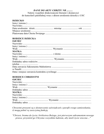 DANE DO AKTU CHRZTU NR .......... Należy wypełnić drukowanymi literami i dostarczyć do kancelarii parafialnej wraz z aktem urodzenia dziecka z USC DZIECKO Imię ( imiona ) ........................................................................................................ Nazwisko................................................................................................................. Data urodzenia: dzień............................... miesiąc .......................... rok .............. Miejsce urodzenia ................................................................................................... Planowana data Chrztu Świętego ........................................................................... RODZICE DZIECKA OJCIEC Nazwisko ................................................................................................................ Imię ( imiona ) ........................................................................................................ Wiek ........................................................ Wyznanie ............................................. MATKA Nazwisko ................................................. z domu ................................................. Imię ( imiona ) ........................................................................................................ Wiek .......................................................... Wyznanie............................................ Dokładny adres rodziców........................................................................................ telefon .............................. Data zawarcia Sakramentu Małżeństwa ................................... w Parafii ................................................................................................................. Data i miejsce zawarcia kontraktu cywilnego ........................................................ RODZICE CHRZESTNI OJCIEC Nazwisko ................................................................................................................ Imię ( imiona ) ........................................................................................................ Wiek ............................................... Wyznanie ...................................................... Dokładny adres ....................................................................................................... MATKA Nazwisko ................................................................................................................ Imię ( imiona ) ........................................................................................................ Wiek ................................................. Wyznanie .................................................... Dokładny adres ....................................................................................................... Chrzestni proszeni są o dostarczenie zaświadczeń z parafii swego zamieszkania, iż mogą pełnić tę zaszczytną funkcję. "Chrzest, brama do życia i królestwa Bożego, jest pierwszym sakramentem nowego prawa; przyniósł go Chrystus wszystkim ludziom, aby mieli życie wieczne…"