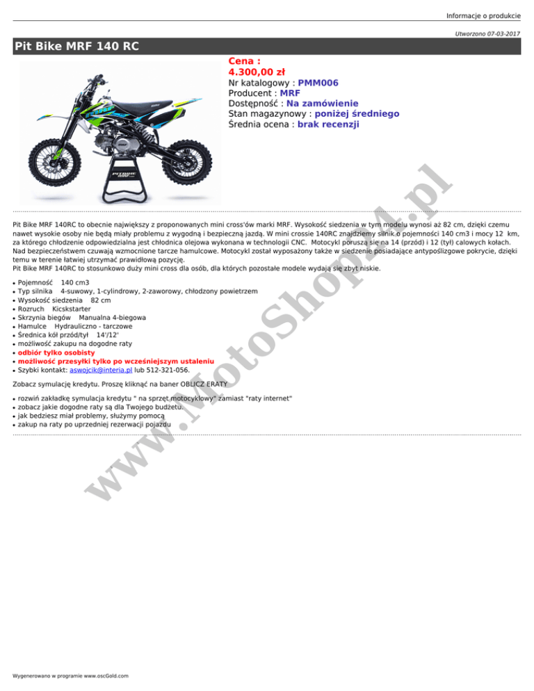 Informacje o produkcie Utworzono 07-03-2017 Pit Bike MRF 140 RC Cena : 4.300,00 zł 4. p l Nr katalogowy : PMM006 Producent : MRF Dostępność : Na zamówienie Stan magazynowy : poniżej średniego Średnia ocena : brak recenzji ● ● ● ● ● ● ● ● ● ● Pojemność 140 cm3 Typ silnika 4-suwowy, 1-cylindrowy, 2-zaworowy, chłodzony powietrzem Wysokość siedzenia 82 cm Rozruch Kicskstarter Skrzynia biegów Manualna 4-biegowa Hamulce Hydrauliczno - tarczowe Średnica kół przód/tył 14'/12' możliwość zakupu na dogodne raty odbiór tylko osobisty możliwość przesyłki tylko po wcześniejszym ustaleniu Szybki kontakt: [email protected] lub 512-321-056. ot oS ● ho p2 Pit Bike MRF 140RC to obecnie największy z proponowanych mini cross'ów marki MRF. Wysokość siedzenia w tym modelu wynosi aż 82 cm, dzięki czemu nawet wysokie osoby nie będą miały problemu z wygodną i bezpieczną jazdą. W mini crossie 140RC znajdziemy silnik o pojemności 140 cm3 i mocy 12 km, za którego chłodzenie odpowiedzialna jest chłodnica olejowa wykonana w technologii CNC. Motocykl poruszą się na 14 (przód) i 12 (tył) calowych kołach. Nad bezpieczeństwem czuwają wzmocnione tarcze hamulcowe. Motocykl został wyposażony także w siedzenie posiadające antypoślizgowe pokrycie, dzięki temu w terenie łatwiej utrzymać prawidłową pozycję. Pit Bike MRF 140RC to stosunkowo duży mini cross dla osób, dla których pozostałe modele wydają się zbyt niskie. ● ● ● rozwiń zakładkę symulacja kredytu " na sprzęt motocyklowy" zamiast "raty internet" zobacz jakie dogodne raty są dla Twojego budżetu. jak bedziesz miał problemy, służymy pomocą zakup na raty po uprzedniej rezerwacji pojazdu w w w ● .M Zobacz symulację kredytu. Proszę kliknąć na baner OBLICZ ERATY Wygenerowano w programie www.oscGold.com