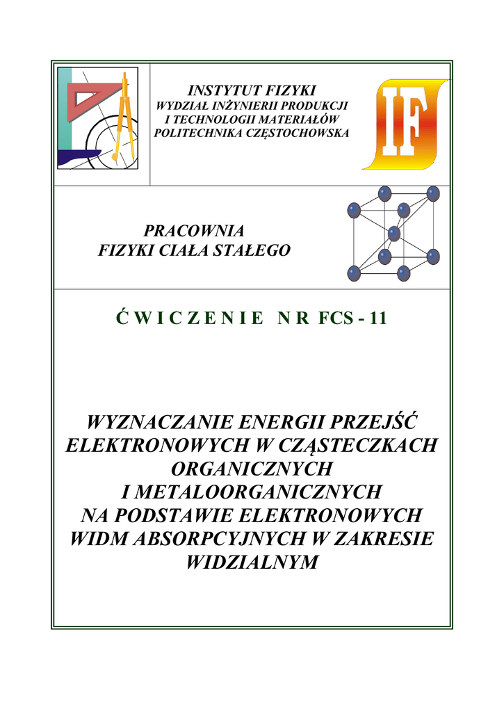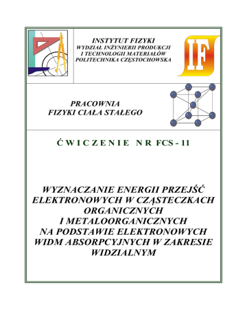 INSTYTUT FIZYKI WYDZIAŁ INŻYNIERII PRODUKCJI I TECHNOLOGII MATERIAŁÓW POLITECHNIKA CZĘSTOCHOWSKA PRACOWNIA FIZYKI CIAŁA STAŁEGO Ć W I C Z E N I E N R FCS - 11 WYZNACZANIE ENERGII PRZEJŚĆ ELEKTRONOWYCH W CZĄSTECZKACH ORGANICZNYCH I METALOORGANICZNYCH NA PODSTAWIE ELEKTRONOWYCH WIDM ABSORPCYJNYCH W ZAKRESIE WIDZIALNYM Ćwiczenie FCS-11: Wyznaczanie energii przejść elektronowych w cząsteczkach organicznych i metaloorganicznych na podstawie elektronowych widm absorpcyjnych w zakresie widzialnym I. 1. 2. 3. 4. II. Zagadnienia do opracowania Kwantowa charakterystyka stanów elektronowych. Elektronowe widma absorpcyjne – intensywność pasm, reguły wyboru, moc oscylatora. Porfiryny i metaloporfiryny – struktura molekularna i ich występowanie w przyrodzie. Spektrofotometr – zasada działania. Przebieg ćwiczenia 1. Rejestracja elektronowych widm absorpcyjnych tetrafenyloporfiryny i Fetetrafenyloporfiryny w fazie ciekłej a. Założyć arkusz do rejestracji widm zwracając uwagę na pokrycie się pionowych kresek odniesienia na arkuszu i na rejestratorze. b. Podnieść pokrywę komory kuwet i umieścić w uchwycie kuwetę z roztworem tetrafenyloporfiryny. c. Opuścić pokrywę komory i włączyć spektrofotometr wyłącznikiem 50 (rys. 1). d. Włączyć lampę żarową włącznikiem 54. Uwaga!!! Przed włączeniem lampy żarowej upewnić się, czy komora kuwet jest szczelnie zamknięta. e. Przekręcają w lewo pokrętło 55 sprowadzić pisak w lewe skrajne położenie. f. Ustawić przełącznik 58 na zakres 0-100. g. Przyciskiem 56 opuścić pisak i rozpocząć rejestrację. h. Wyłączyć lampę żarową przełącznikiem 54. i. Zmienić próbkę na Fe-tetrafenyloporfirynę. j. Powtórzyć czynności 2-8. k. Zdjąć arkusz z zarejestrowanymi widmami i wymienić na czysty. 2. Rejestracja elektronowych widm absorpcyjnych w fazie stałej. a. Podnieść pokrywę komory kuwet i umieścić w uchwycie próbkę z naniesioną warstwą tetrafenyloporfiryny. b. Wykonując czynności 3-8 z punktu II.1 zarejestrować widmo. c. Zmienić próbkę na Fe-tetrafenyloporfirynę. d. wykonując czynności jak w punkcie 2 zarejestrować widmo warstwy Fetetrafenyloporfiryny. e. Wyjąć próbkę z komory kuwet i wyłączyć spektrofotometr przełącznikiem 50. III. Tabela pomiarowa Próbka IV. Pasmo Liczna falowa k [1000 cm-1] Długość fali [nm] Energia przejścia E [eV] Opracowanie pomiarów 1. Określić położenie pików (w cm-1) w elektronowych widmach absorpcyjnych i wyniki wpisać do tabeli. 2. Przeliczyć wartości liczb falowych z cm-1 na m-1 oraz na długość fali wyrażonej w nm. 2 Ćwiczenie FCS-11: Wyznaczanie energii przejść elektronowych w cząsteczkach organicznych i metaloorganicznych na podstawie elektronowych widm absorpcyjnych w zakresie widzialnym hc i wyrazić je w eV. 4. Określić dokładność położenia pików w widmach k i określić metodą różniczki zupełnej błąd wartości energii przejść elektronowych. 5. Porównać elektronowe widma absorpcyjne uzyskane dla kompleksów tetrafenyloporfiryny i Fe-tetrafenyloporfiryny, i przedyskutować wpływ jonu Fe(III) na energię przejść elektronowych i elektronowe widma absorpcyjne. 3. Obliczyć energie przejść elektronowych z zależności E V. Literatura 1. Z. Kęcki „Podstawy spektroskopii molekularnej” PWN, Warszawa, 1998. 2. C. N. R. Rao „Spektroskopia elektronowa związków organicznych” PWN, Warszawa 1982. 3. „Ćwiczenia laboratoryjne z fizyki” pod red. F. Kaczmarka, PWN, Warszawa, 1982. VI. Schematy pomiarowe Rys. 1. Płyta czołowa spektrofotometru z przełącznikami 50 – włącznik sieciowy 53 – lampka kontrolna lampy 56 – przycisk „start” 59 – pokrętło korekcji 100% 51 – lampka kontrolna napięcia 52 – włącznik lampy deuterowej sieci 54 – włącznik lampy żarowej 55 – przełącznik programu 57 – przycisk „stop” 58 – przełącznik zakresu pom. 60 – płyta czołowa 3 Ćwiczenie FCS-11: Wyznaczanie energii przejść elektronowych w cząsteczkach organicznych i metaloorganicznych na podstawie elektronowych widm absorpcyjnych w zakresie widzialnym Rys. 2. Schemat optyczny spektrofotometru 21 – zwierciadło wklęsłe 24 – lampa deuterowa 27 – pryzmat z kwarcu synt. 31 – soczewka cylindryczna 34 – zwierciadło ruchome 38 – probówka porównawcza 41 – powielacz fotoelektronowy 22 – żarówka 25 – szczelina wejściowa 28, 29 – zwierciadła wklęsłe 32 – zwierciadło wklęsłe 35, 36 – zwierciadła sferyczne 39 – próbka mierzona 23 – zwierciadło płaskie 26 – zwierciadło Littrowa 30 – szczelina wejściowa 33 – tarcza modulatora 37 – zwierciadło płaskie 40 – kuwety do próbek rozpr. 4