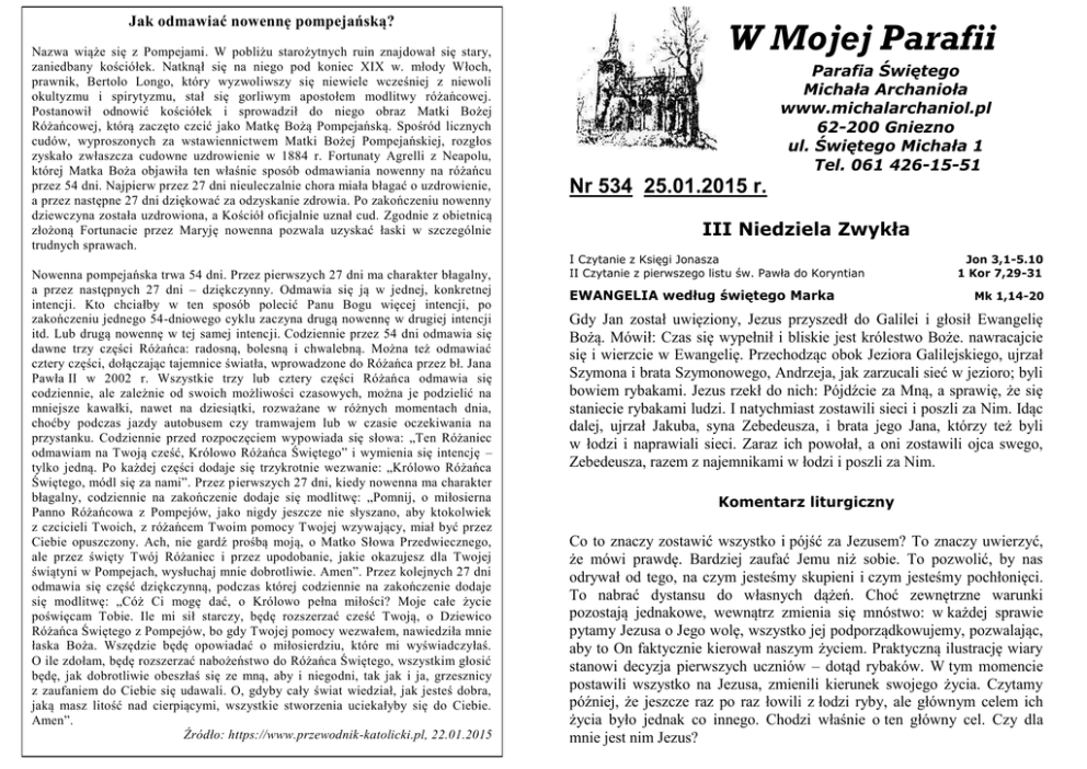 Jak odmawiać nowennę pompejańską? Nazwa wiąże się z Pompejami. W pobliżu starożytnych ruin znajdował się stary, zaniedbany kościółek. Natknął się na niego pod koniec XIX w. młody Włoch, prawnik, Bertolo Longo, który wyzwoliwszy się niewiele wcześniej z niewoli okultyzmu i spirytyzmu, stał się gorliwym apostołem modlitwy różańcowej. Postanowił odnowić kościółek i sprowadził do niego obraz Matki Bożej Różańcowej, którą zaczęto czcić jako Matkę Bożą Pompejańską. Spośród licznych cudów, wyproszonych za wstawiennictwem Matki Bożej Pompejańskiej, rozgłos zyskało zwłaszcza cudowne uzdrowienie w 1884 r. Fortunaty Agrelli z Neapolu, której Matka Boża objawiła ten właśnie sposób odmawiania nowenny na różańcu przez 54 dni. Najpierw przez 27 dni nieuleczalnie chora miała błagać o uzdrowienie, a przez następne 27 dni dziękować za odzyskanie zdrowia. Po zakończeniu nowenny dziewczyna została uzdrowiona, a Kościół oficjalnie uznał cud. Zgodnie z obietnicą złożoną Fortunacie przez Maryję nowenna pozwala uzyskać łaski w szczególnie trudnych sprawach. Nowenna pompejańska trwa 54 dni. Przez pierwszych 27 dni ma charakter błagalny, a przez następnych 27 dni – dziękczynny. Odmawia się ją w jednej, konkretnej intencji. Kto chciałby w ten sposób polecić Panu Bogu więcej intencji, po zakończeniu jednego 54-dniowego cyklu zaczyna drugą nowennę w drugiej intencji itd. Lub drugą nowennę w tej samej intencji. Codziennie przez 54 dni odmawia się dawne trzy części Różańca: radosną, bolesną i chwalebną. Można też odmawiać cztery części, dołączając tajemnice światła, wprowadzone do Różańca przez bł. Jana Pawła II w 2002 r. Wszystkie trzy lub cztery części Różańca odmawia się codziennie, ale zależnie od swoich możliwości czasowych, można je podzielić na mniejsze kawałki, nawet na dziesiątki, rozważane w różnych momentach dnia, choćby podczas jazdy autobusem czy tramwajem lub w czasie oczekiwania na przystanku. Codziennie przed rozpoczęciem wypowiada się słowa: „Ten Różaniec odmawiam na Twoją cześć, Królowo Różańca Świętego” i wymienia się intencję – tylko jedną. Po każdej części dodaje się trzykrotnie wezwanie: „Królowo Różańca Świętego, módl się za nami”. Przez pierwszych 27 dni, kiedy nowenna ma charakter błagalny, codziennie na zakończenie dodaje się modlitwę: „Pomnij, o miłosierna Panno Różańcowa z Pompejów, jako nigdy jeszcze nie słyszano, aby ktokolwiek z czcicieli Twoich, z różańcem Twoim pomocy Twojej wzywający, miał być przez Ciebie opuszczony. Ach, nie gardź prośbą moją, o Matko Słowa Przedwiecznego, ale przez święty Twój Różaniec i przez upodobanie, jakie okazujesz dla Twojej świątyni w Pompejach, wysłuchaj mnie dobrotliwie. Amen”. Przez kolejnych 27 dni odmawia się część dziękczynną, podczas której codziennie na zakończenie dodaje się modlitwę: „Cóż Ci mogę dać, o Królowo pełna miłości? Moje całe życie poświęcam Tobie. Ile mi sił starczy, będę rozszerzać cześć Twoją, o Dziewico Różańca Świętego z Pompejów, bo gdy Twojej pomocy wezwałem, nawiedziła mnie łaska Boża. Wszędzie będę opowiadać o miłosierdziu, które mi wyświadczyłaś. O ile zdołam, będę rozszerzać nabożeństwo do Różańca Świętego, wszystkim głosić będę, jak dobrotliwie obeszłaś się ze mną, aby i niegodni, tak jak i ja, grzesznicy z zaufaniem do Ciebie się udawali. O, gdyby cały świat wiedział, jak jesteś dobra, jaką masz litość nad cierpiącymi, wszystkie stworzenia uciekałyby się do Ciebie. Amen”. Źródło: https://www.przewodnik-katolicki.pl, 22.01.2015 W Mojej Parafii Parafia Świętego Michała Archanioła www.michalarchaniol.pl 62-200 Gniezno ul. Świętego Michała 1 Tel. 061 426-15-51 Nr 534 25.01.2015 r. III Niedziela Zwykła I Czytanie z Księgi Jonasza II Czytanie z pierwszego listu św. Pawła do Koryntian EWANGELIA według świętego Marka Jon 3,1-5.10 1 Kor 7,29-31 Mk 1,14-20 Gdy Jan został uwięziony, Jezus przyszedł do Galilei i głosił Ewangelię Bożą. Mówił: Czas się wypełnił i bliskie jest królestwo Boże. nawracajcie się i wierzcie w Ewangelię. Przechodząc obok Jeziora Galilejskiego, ujrzał Szymona i brata Szymonowego, Andrzeja, jak zarzucali sieć w jezioro; byli bowiem rybakami. Jezus rzekł do nich: Pójdźcie za Mną, a sprawię, że się staniecie rybakami ludzi. I natychmiast zostawili sieci i poszli za Nim. Idąc dalej, ujrzał Jakuba, syna Zebedeusza, i brata jego Jana, którzy też byli w łodzi i naprawiali sieci. Zaraz ich powołał, a oni zostawili ojca swego, Zebedeusza, razem z najemnikami w łodzi i poszli za Nim. Komentarz liturgiczny Co to znaczy zostawić wszystko i pójść za Jezusem? To znaczy uwierzyć, że mówi prawdę. Bardziej zaufać Jemu niż sobie. To pozwolić, by nas odrywał od tego, na czym jesteśmy skupieni i czym jesteśmy pochłonięci. To nabrać dystansu do własnych dążeń. Choć zewnętrzne warunki pozostają jednakowe, wewnątrz zmienia się mnóstwo: w każdej sprawie pytamy Jezusa o Jego wolę, wszystko jej podporządkowujemy, pozwalając, aby to On faktycznie kierował naszym życiem. Praktyczną ilustrację wiary stanowi decyzja pierwszych uczniów – dotąd rybaków. W tym momencie postawili wszystko na Jezusa, zmienili kierunek swojego życia. Czytamy później, że jeszcze raz po raz łowili z łodzi ryby, ale głównym celem ich życia było jednak co innego. Chodzi właśnie o ten główny cel. Czy dla mnie jest nim Jezus? Intencje mszalne Poniedziałek 26.01.2015 św. Tymoteusza i Tytusa Wtorek 27.01.2015 bł. Jerzego Matulewicza Środa 28.01.2015 św. Tomasza z Akwinu 8:00 + Barbara Purol – Różańska 17:00 + Stanisław Wiśniewski 8:00 + Helena Pawłowska 17:00 + Irena Krajka 17:00 + Rozalia Śleziona 8:00 + Stanisław Wiśniewski 17:00 + Edmund Sieczkowski w 25 rocz.