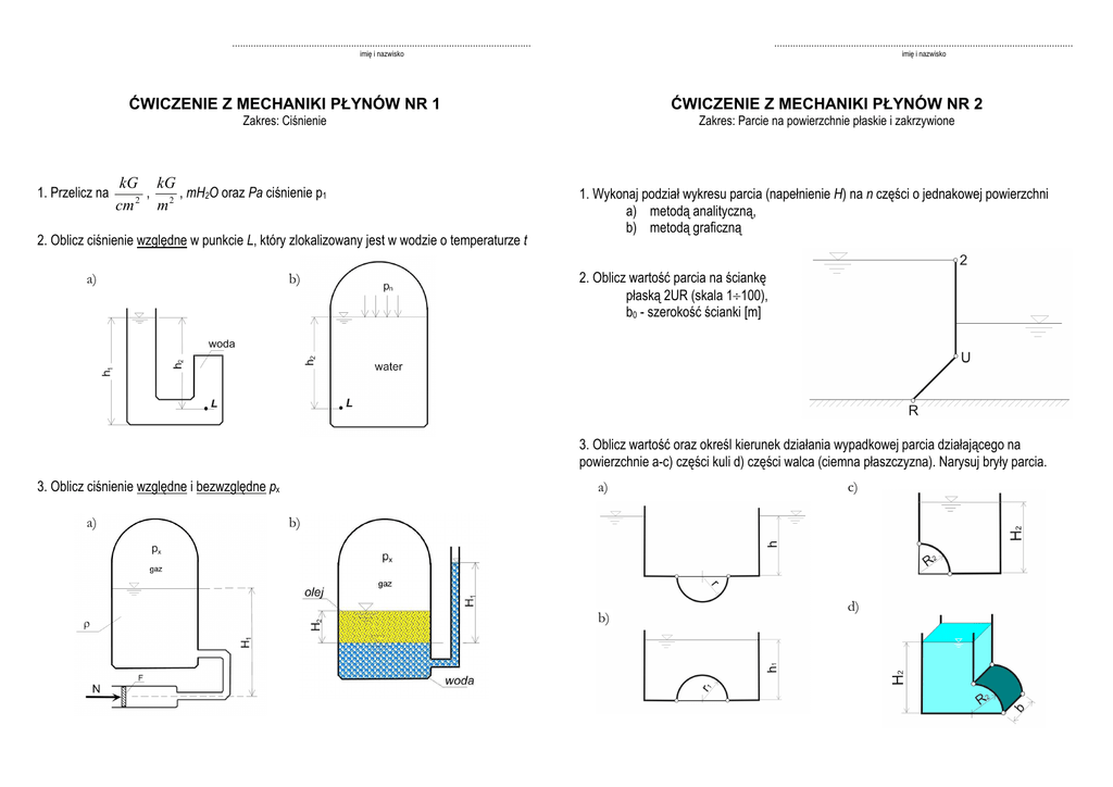 1. Przelicz na ................................................................................................................. ................................................................................................................. imię i nazwisko imię i nazwisko ĆWICZENIE Z MECHANIKI PŁYNÓW NR 1 ĆWICZENIE Z MECHANIKI PŁYNÓW NR 2 Zakres: Ciśnienie Zakres: Parcie na powierzchnie płaskie i zakrzywione kG kG , , mH2O oraz Pa ciśnienie p1 cm 2 m 2 2. Oblicz ciśnienie względne w punkcie L, który zlokalizowany jest w wodzie o temperaturze t a) b) 1. Wykonaj podział wykresu parcia (napełnienie H) na n części o jednakowej powierzchni a) metodą analityczną, b) metodą graficzną 2. Oblicz wartość parcia na ściankę płaską 2UR (skala 1÷100), b0 - szerokość ścianki [m] 3. Oblicz wartość oraz określ kierunek działania wypadkowej parcia działającego na powierzchnie a-c) części kuli d) części walca (ciemna płaszczyzna). Narysuj bryły parcia. 3. Oblicz ciśnienie względne i bezwzględne px a) a) c) b) b) d)