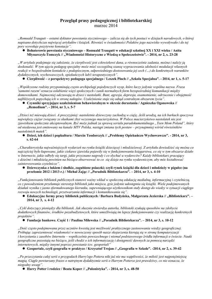 Przegląd prasy pedagogicznej i bibliotekarskiej marzec 2014