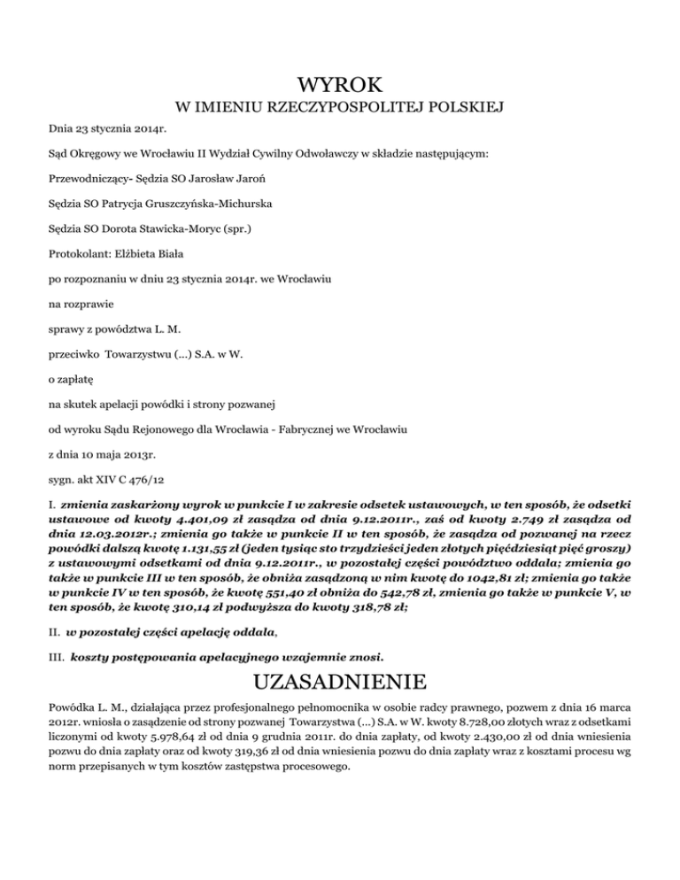 WYROK W IMIENIU RZECZYPOSPOLITEJ POLSKIEJ Dnia 23 stycznia 2014r. Sąd Okręgowy we Wrocławiu II Wydział Cywilny Odwoławczy w składzie następującym: Przewodniczący- Sędzia SO Jarosław Jaroń Sędzia SO Patrycja Gruszczyńska-Michurska Sędzia SO Dorota Stawicka-Moryc (spr.) Protokolant: Elżbieta Biała po rozpoznaniu w dniu 23 stycznia 2014r. we Wrocławiu na rozprawie sprawy z powództwa L. M. przeciwko Towarzystwu (...) S.A. w W. o zapłatę na skutek apelacji powódki i strony pozwanej od wyroku Sądu Rejonowego dla Wrocławia - Fabrycznej we Wrocławiu z dnia 10 maja 2013r. sygn. akt XIV C 476/12 I. zmienia zaskarżony wyrok w punkcie I w zakresie odsetek ustawowych, w ten sposób, że odsetki ustawowe od kwoty 4.401,09 zł zasądza od dnia 9.12.2011r., zaś od kwoty 2.749 zł zasądza od dnia 12.03.2012r.; zmienia go także w punkcie II w ten sposób, że zasądza od pozwanej na rzecz powódki dalszą kwotę 1.131,55 zł (jeden tysiąc sto trzydzieści jeden złotych pięćdziesiąt pięć groszy) z ustawowymi odsetkami od dnia 9.12.2011r., w pozostałej części powództwo oddala; zmienia go także w punkcie III w ten sposób, że obniża zasądzoną w nim kwotę do 1042,81 zł; zmienia go także w punkcie IV w ten sposób, że kwotę 551,40 zł obniża do 542,78 zł, zmienia go także w punkcie V, w ten sposób, że kwotę 310,14 zł podwyższa do kwoty 318,78 zł; II. w pozostałej części apelację oddala, III. koszty postępowania apelacyjnego wzajemnie znosi. UZASADNIENIE Powódka L. M., działająca przez profesjonalnego pełnomocnika w osobie radcy prawnego, pozwem z dnia 16 marca 2012r. wniosła o zasądzenie od strony pozwanej Towarzystwa (...) S.A. w W. kwoty 8.728,00 złotych wraz z odsetkami liczonymi od kwoty 5.978,64 zł od dnia 9 grudnia 2011r. do dnia zapłaty, od kwoty 2.430,00 zł od dnia wniesienia pozwu do dnia zapłaty oraz od kwoty 319,36 zł od dnia wniesienia pozwu do dnia zapłaty wraz z kosztami procesu wg norm przepisanych w tym kosztów zastępstwa procesowego. Zaskarżonym wyrokiem z dnia 10 maja 2013r. Sąd Rejonowy dla Wrocławia-Fabrycznej we Wrocławiu zasądził od strony pozwanej Towarzystwa (...) SA w W. na rzecz powódki L. M. kwotę 7.150 zł wraz z ustawowymi odsetkami liczonymi od dnia 9 grudnia 2011r. do dnia zapłaty ( pkt I ); dalej idące powództwo oddalił ( pkt II ), zasądził od strony pozwanej na rzecz powódki 1415 zł tytułem kosztów procesu ( pkt III ), nakazał stronie pozwanej uiścić na rzecz Skarbu Państwa kwotę 551,40 zł tytułem brakujących wydatków związanych z opinią biegłego ( pkt IV ); nakazał powódce uiścić na rzecz Skarbu Państwa kwotę 310,14 zł tytułem brakujących wydatków związanych z opinią biegłego ( pkt V ). Sąd Rejonowy swoje rozstrzygnięcie Sąd oparł na następującym stanie faktycznym. W dniu 22 października 2011 r. około godz. 18:00 doszło do wypadku komunikacyjnego, podczas którego uległ uszkodzeniu pojazd powódki M. (...) rok produkcji 2003 o nr rej (...). Ze zdarzenia została sporządzona notatka policyjna, w której ustalono, że sprawcą wypadku był J. G., kierujący pojazdem marki H. (...) o nr rej (...). Właściciel pojazd posiadał wykupione ubezpieczenie OC u strony pozwanej. Szkoda została zgłoszona stronie pozwanej w dniu 8 listopada 2011 r. Strona pozwana na podstawie wyceny z dnia 11 listopada 2011r. ustaliła wartość samochodu powódki na kwotę 17.900,00 zł brutto oraz oszacowała wartość szkody w pojeździe na kwotę 4.898,91 zł netto ( 6.025,66 zł brutto). Powódka zleciła wykonanie kosztorysu wyceny naprawy uszkodzonego pojazdu rzeczoznawcom techniki samochodowej i ruchu drogowego z zakładu (...), za sporządzenie wyceny została wystawiona na rzecz powoda faktura VAT nr (...) na kwotę 392,81 zł. Pismem z dnia 23 stycznia 2012r. strona pozwana zawiadomiła powódkę o przyznaniu odszkodowania w wysokości 4.898,91 zł. Powódka złożyła odwołanie w dniu 28 stycznia 2012r. od powyższej decyzji., w którym domagała się wypłaty uzupełniającej wartości szkody wycenionej przez rzeczoznawcę samochodowego, kwoty 3.000 zł za koszty ponoszone na wynajem środka transportu w miesiącach listopad i grudzień 2011r. oraz kwotę 392,81 zł za wydaną wyceną. Do pisma dołączyła fakturę VAT nr (...) oraz rachunek wystawiony na jej rzecz z dnia 30 listopada 2011r. nr (...) za jazdę taksówką osobową w miesiącu listopad 2011 r. z firmy (...) i rachunek wystawiony na jej rzecz z dnia 31 grudnia 2011r. nr (...) za jazdę taksówką osobową w miesiącu grudniu 2011r. z firmy (...) . Koszt naprawy samochodu powoda wynosi 16.213,07 zł brutto. Koszty naprawy pojazdu ustalono uwzględniając średnie stawki warsztatowe (blacharsko lakiernicze) na okres 2011 roku tj. 100 zł netto za 1 rbg. Wartość pojazdu przed wypadkiem wynosiła 17.300,00 zł. Po wypadku wartość pojazdu została określona na kwotę 8.000,00 zł. z uwagi na fakt zbycia pojazdu bez dokonywania naprawy. Naprawa pojazdu była ekonomicznie uzasadniona. Do wymiany zakwalifikowane zostały: nakładka zderzaka tylnego, listwa tylna, wzmocnienie zderzaka tylnego, ściana tylna, pokrywa bagażnika, emblemat tylny, napis tylny lewy, kpl kleju szyby tylnej, uszczelka szyby tylnej, uchwyt lampy tylnej lewej, wzmocnienie wspornika lampy tylnej lewej. Powódka w dacie wypadku prowadziła działalność gospodarczą pod firmą PHU (...). Powódka była płatnikiem podatku VAT . Uszkodzony samochód był zaksięgowany jako środek trwały. Przy tak ustalonym stanie faktycznym Sąd Rejonowy ocenił, iż powództwo było zasadne w przeważającej części i dlatego podlegało uwzględnieniu. Sąd Rejonowy ustalił stan faktyczny w oparciu o dowody z dokumentów prywatnych w aktach szkody oraz w oparciu o opinię biegłego z zakresu motoryzacji, techniki samochodowej i rekonstrukcji wypadków drogowych. W niniejszej sprawie bezspornymi okolicznością był fakt zajścia zdarzeni