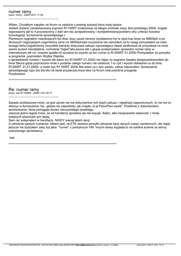 numer ramy Autor: Cichy - 2005/10/31 11:39 _____________________________________ Witam. Chcialbym zapytac na forum co sadzicie o pewnej sytuacji ktora nizej opisze: Jestem (bylem) zainteresowany kupnem R1150RT znalezionej na allegro,motorek nowy 3km.przebiegu 2004r. bogato wyposazony jak to rt,przywieziony z italii tam tez zarejestrowany i wyrejestrowany(podobno aby uniknac kosztow homologacji, tlumaczenie sprzedajacego.) Pierwszym sygnalem niepokojacym byl dosc duzy upust cenowy (wystawiony byl w opcji kup teraz za 48800pln a po dluzszych negocjacjach uzgonilismy cene na 38000pln)ale oczywiscie nie zwrocilem na to uwagi pomyslalem ze mam duzego farta.Uzgodnilismy wszystkie pierdoly dotyczace zakupu (sprzedajacy nawet zaoferowal ze przywiezie mi moto swiom busem nieodplatnie, normalnie "bajka")ale jeszce tak z glupia postanowilem sprawdzic numer ramy w internetowym etk no i troszke spadla mi szczena bo wyszlo ze ten numer to R1200RT 01,2005r.Pomyslalem ze pomylka w programie ,poprosilem Wojtka Olejnika o sprawdzenie numeru i wyszlo tak samo tzn.R1200RT 01,2005r.nie dajac za wygrana (taaaka okazja)zadzwonilem do bmw Sikora gdzie poproszono mnie o podanie calego numeru nie ostatnich 7-iu cyfr i wyszlo dokladnie co do dnia R1200RT 31,01,2005r. a mialo byc R1150RT 2004r.Nie wiem co o tym sadzic, zakup odpuscilem ,tlumaczenia sprzedajacego typu bla bla bla nie bede przytaczal,moze ktos na forum mial podobna przygode. Pozdrawiam ============================================================================ Re: numer ramy Autor: Irek R1100RS - 2005/11/01 00:17 _____________________________________ Zasada podstawowa mowi, ze jesli sprzet nie ma dokumentow (ich kopii) zakupu / rejestracji zagranicznych, to nie ma co wierzyc w tlumaczenia "aa.. gdzies sie zapodzialy; jak znajde, to je Panu/Pani wysle". Podobnie z dokumentami serwisowania, ktore pomagaja dociec rzeczywistego przebiegu. Jeszcze jedna regula mowi, ze od handlarzy sprzetow sie nie kupuje. Salon, albo bezposredni wlasciciel. I mniej kolejnych wlascicieli tym lepiej. Sam raz wdepnalem w handlarzy. NIGDY wiecej takich akcji. A odnosnie samych numerow: faktem jest, ze ETK zawiera pomylki odnosnie bazy danych czesci zamiennych, ale nigdy jeszcze nie slyszalem zeby byl jakis "numer" z pomylonym VIN. Innymi slowy wyglada to na solidna scieme ze strony szanownego sprzedawcy. Irek ============================================================================ ARCHIWUM FoRUM BOXER-MOTOR - MOTOCYKLE BMW sklep BOXER-PARTS.eu MamboBoard czê¶ci i akcesoria Forum Component version: 1.4 Stable Generated: 7 March, 2017, 16:13