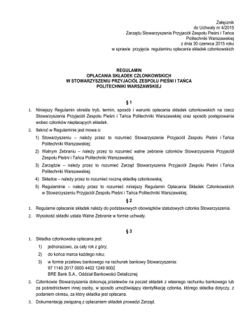 Załącznik do Uchwały nr 4/2015 Zarządu Stowarzyszenia Przyjaciół Zespołu Pieśni i Tańca Politechniki Warszawskiej z dnia 30 czerwca 2015 roku w sprawie przyjęcia regulaminu opłacania składek członkowskich REGULAMIN OPŁACANIA SKŁADEK CZŁONKOWSKICH W STOWARZYSZENIU PRZYJACIÓŁ ZESPOŁU PIEŚNI I TAŃCA POLITECHNIKI WARSZAWSKIEJ §1 1. Niniejszy Regulamin określa tryb, termin, sposób i warunki opłacania składek członkowskich na rzecz Stowarzyszenia Przyjaciół Zespołu Pieśni i Tańca Politechniki Warszawskiej oraz sposób postępowania wobec członków niepłacących składek. 2. Ilekroć w Regulaminie jest mowa o: 1) Stowarzyszeniu – należy przez to rozumieć Stowarzyszenie Przyjaciół Zespołu Pieśni i Tańca Politechniki Warszawskiej; 2) Walnym Zebraniu – należy przez to rozumieć walne zebranie członków Stowarzyszenia Przyjaciół Zespołu Pieśni i Tańca Politechniki Warszawskiej; 3) Zarządzie – należy przez to rozumieć Zarząd Stowarzyszenia Przyjaciół Zespołu Pieśni i Tańca Politechniki Warszawskiej; 4) Składce – należy przez to rozumieć roczną składkę członkowską; 5) Regulaminie – należy przez to rozumieć niniejszy Regulamin Opłacania Składek Członkowskich w Stowarzyszeniu Przyjaciół Zespołu Pieśni i Tańca Politechniki Warszawskiej. §2 1. Regularne opłacanie składek należy do podstawowych obowiązków statutowych członka Stowarzyszenia. 2. Wysokość składki ustala Walne Zebranie w formie uchwały. §3 1. Składka członkowska opłacana jest: 1) jednorazowo, za cały rok z góry; 2) do końca marca każdego roku; 3) w formie przelewu bankowego na rachunek bankowy Stowarzyszenia: 97 1140 2017 0000 4402 1249 9002 BRE Bank S.A., Oddział Bankowości Detalicznej 2. Członkowie Stowarzyszenia dokonują przelewów na poczet składek z własnego rachunku bankowego lub za pośrednictwem innej osoby, w sposób umożliwiający identyfikację członka, którego składka dotyczy, z podaniem okresu, za który składka jest opłacana. 3. Dokumentację związaną z opłacaniem składek prowadzi Zarząd. §4 1. Osoby przyjęte w poczet członków Stowarzyszenia do dnia 31 marca danego roku kalendarzowego opłacają składkę roczną w pełnej wysokości. 2. Osoby przyjęte w poczet członków Stowarzyszenia w okresie od 1 kwietnia do 31 grudnia opłacają składkę w wysokości proporcjonalnej do liczby miesięcy pozostałych do końca roku kalendarzowego, licząc od miesiąca następującego po miesiącu, w którym podjęta została decyzja o przyjęciu. 3. Nowo przyjęci członkowie wpłacają składkę w ciągu dwóch tygodni od dnia otrzymania zawiadomienia o przyjęciu do Stowarzyszenia. §5 1. W sytuacji wyjątkowej członek Stowarzyszenia może wystąpić do Zarządu z pisemnym wnioskiem o zgodę na opłacenie składki w innym terminie, niż wskazany w Regulaminie, lub na spłatę zadłużenia w ratach. 2. Zarząd w terminie 2 tygodni podejmuje decyzję w formie uchwały, czy i na jakich zasadach prośba, o której mowa w ust. 1 zostaje uwzględniona, oraz powiadamia o decyzji zainteresowaną osobę. 3. Opłata składek w innym terminie lub spłata zadłużenia w ratach nie zwalnia członka z obowiązku terminowego opłacania bieżących składek zgodnie z ustaleniami niniejszego Regulaminu. §6 1. Nieusprawiedliwione zaleganie z opłatą składki przez okres przekraczający 6 miesięcy stanowi podstawę podjęcia przez Zarząd uchwały o wykluczeniu ze Stowarzyszenia. 2. Podjęcie uchwały o wykluczeniu członka ze Stowarzyszenia z tytułu zalegania z opłatą składek Zarząd poprzedza przesłaniem upomnienia, w którym określa ostateczny termin uregulowania zaległych składek. 3. Od uchwały Zarządu w sprawie pozbawienia członkostwa w Stowarzyszeniu z powodu zalegania z opłatą składek przysługuje odwołanie do Walnego Zebrania za pośrednictwem Zarządu, który zobowiązany jest do wniesienia tego odwołania do porządku obrad najbliższego Walnego Zebrania. 4. Uchwała Walnego Zebrania w sprawie odwołania od uchwały Zarządu, dotyczącej pozbawienia członkostwa w Stowarzyszeniu z powodu zalegania z opłatą składek, jest ostateczna. §7 Osoba wykluczona ze Stowarzyszenia z powodu nieopłacania składek może starać się o ponowne przyjęcie do Stowarzyszenia po uiszczeniu zadłużenia powstałego do dnia wykluczenia jej ze Stowarzyszenia. §8 Składka nie podlega zwrotowi w przypadku złożenia przez członka rezygnacji z członkostwa w Stowarzyszeniu przed końcem roku, za który składka została opłacona. §9 1. W sprawach nieuregulowanych w niniejszym Regulaminie decyduje Zarząd, kierując się obowiązującymi przepisami prawa, statutem Stowarzyszenia oraz uchwałami Walnego Zebrania. 2. Regulamin wchodzi w życie z dniem podjęcia uchwały przez Zarząd w sprawie jego przyjęcia. 3. Regulamin podaje się do wiadomości wszystkich członków Stowarzyszenia w sposób przyjęty w Stowarzyszeniu.