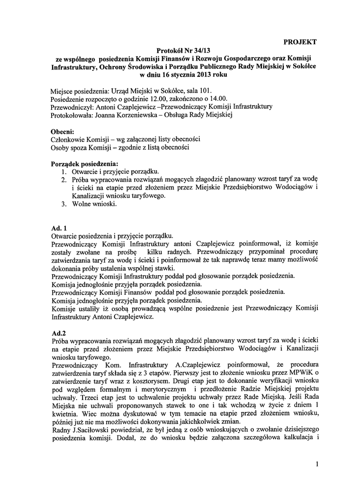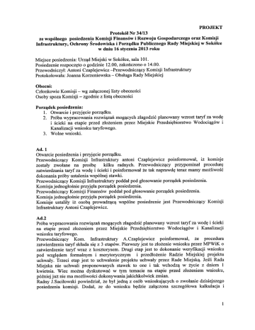 Protokół Nr 34/13 ze wspólnego posiedzenia Komisji Finansów i Rozwoju Gospodarczego oraz Komisji Infrastruktury, Ochrony Środowiska i Porządku Publicznego Rady Miejskiej w Sokółce w dniu 16 stycznia 2013 roku Miejsce posiedzenia: Urząd Miejski w Sokółce, sala 101. Posiedzenie rozpoczęto o godzinie 12.00, zakończono o 14.00. Przewodniczył: Antoni Czaplejewicz -Przewodniczący Komisji Infrastruktury Protokołowała: Joanna Korzeniewska - Obsługa Rady Miejskiej Obecni: Członkowie Komisji - wg załączonej listy obecności Osoby spoza Komisji - zgodnie z listą obecności Porządek posiedzenia: 1. Otwarcie i przyjęcie porządku. 2. Próba wypracowania rozwiązań mogących złagodzić planowany wzrost taryf za wodę i ścieki na etapie przed złożeniem przez Miejskie Przedsiębiorstwo Wodociągów i Kanalizacji wniosku taryfowego. 3. Wolne wnioski. Ad. 1 Otwarcie posiedzenia i przyjęcie porządku. Przewodniczący Komisji Infrastruktury antoni Czaplejewicz poinformował, iż komisje zostały zwołane na prośbę kilku radnych. Przewodniczący przypominał procedurę zatwierdzania taryf za wodę i ścieki i poinformował że tak naprawdę teraz mamy możliwość dokonania próby ustalenia wspólnej stawki. Przewodniczący Komisji Infrastruktury poddał pod głosowanie porządek posiedzenia. Komisja jednogłośnie przyjęła porządek posiedzenia. Przewodniczący Komisji Finansów poddał pod głosowanie porządek posiedzenia. Komisja jednogłośnie przyjęła porządek posiedzenia. Komisje ustaliły iż osobą prowadzącą wspólne posiedzenie jest Przewodniczący Komisji Infrastruktury Antoni Czaplejewicz. Ad.2 Próba wypracowania rozwiązań mogących złagodzić planowany wzrost taryf za wodę i ścieki na etapie przed złożeniem przez Miejskie Przedsiębiorstwo Wodociągów i Kanalizacji wniosku taryfowego. Przewodniczący Kom. Infrastruktury A.Czaplej ewicz poinformował, że procedura zatwierdzenia taryf składa się z 3 etapów. Pierwszy jest to złożenie wniosku przez MPWiK o zatwierdzenie taryf wraz z kosztorysem. Drugi etap jest to dokonanie weryfikacji wniosku pod względem formalnym i merytorycznym i przedłożenie Radzie Miejskiej projektu uchwały. Trzeci etap jest to uchwalenie projektu uchwały przez Rade Miejską. Jeśli Rada Miejska nie uchwali proponowanych stawek to one i tak wchodzą w życie z dniem 1 kwietnia. Wiec można dyskutować w tym temacie na etapie przed złożeniem wniosku, później już nie ma możliwości dokonywania jakichkolwiek zmian. Radny J.Saciłowski powiedział, że był jedną z osób wnioskujących o zwołanie dzisiejszego posiedzenia komisji. Dodał, ze do wniosku będzie załączona szczegółowa kalkulacja i wieloletni plan rozwoju. Chcielibyśmy się dowiedzieć czy istnieje jakakolwiek możliwość zminimalizowania lub w ogóle żeby nie było podwyżki cen na wodę i ścieki. W jakiej skali Dyrektor MPWiK przewiduje podwyżkę? Radna J.Wysocka przypominała iż w po [przednim roku przy uchwalaniu stawkę była mowa że jest to podwyżka tylko na rok. Może można w jakiś sposób zminimalizować ta podwyżkę i dopłacić dla mieszkańców do tej ceny. Dyrektor MPWiK A Sakowicz poinformował, że głównym powodem do podwyżki w tym roku stawek jest to że mleczarnia zmniejszyła zużycie wody co za tym idzie zrzut ścieków ze względu na zmianę produkcji w Sokółce. Jeśli był by taki pobór jak w 2011 r. to w ogóle bym w tym roku nie wnosił o podwyżkę tylko o pozostawienie na tym samym poziomie. Tymczasem zużycie spadło o ponad 37 tysięcy metrów sześciennych. Mleczarnia wyprowadziła też o 43 tysiące metrów sześciennych ścieków mniej. Wszystko to wiąże się z wyprowadzeniem z Sokółki produkcji serów z sokólskiero zakładu. Produkcja wody dostarczanej do odbiorców przez MPWiK spadła z 890 tys. m do 848 tys. m3 w 2012 roku. Planuję, że w związku z tym opłaty za wodę wzrosną o około 0,20 zł. na metrze sześciennym, czyli o 8,85 %, a ścieków - o 0,29 zł., czyli o 6,09 %. Jest jednak możliwość zmniejszenia planowanej podwyżki o około 0,10 zł., gdyby gmina zleciła nam wykonanie kanalizacji za około 380 tys. zł na ulicach Żwirki i Wigury, Matejki, Dywizjonu 303. W takim przypadku podwyżka cen wody wyniosłaby 0,11 zł., czyli około 5 %. Na zlewni też są zmniejszone zrzuty, mieszkańcy dalej nie mają podłączeń a zrzutów ścieków jest mniej. Więc na pewno przewożone są ścieki do Eskimosa. Radny ACzaplejewicz zapytał jaki jest spadek na zlewni. Dyrektor MPwiK ASakowicz wyjaśnił że ponad 35 % czyli 1/3 w stosunku do poprzedniego roku. Radny W.Bieszczad dodał, ze ma wrażenie że przez to że mleczarnia mniej wody bierze to ma za to płacić sokólskie społeczeństwo. Radny S.Sawicki przypominał sesje budżetową na której chciał zdjąć 2 inwestycje żeby przeznaczyć środki na inwestycje kanalizacyjne. Przypominał również sytuację gdzie to MPWiK wymuszało na firmie Eskimos budowę oczyszczalni i nie zadbało o to żeby zrzucali ścieki do miejskich wodociągów. w tej chwili Eskimos potrzebuje ścieków i przyjmuje je w tej chwili. W 2011 r. złożył 6 interpelacji d Pana Sakowicza i otrzymywałem odpowiedzi typu tajemnica handlowa, tajemnica spółki. Zainwestowaliśmy 8,5 mln. zł. w oczyszczalnie bo jak twierdzi Dyrektor zakład był całkowicie wyeksploatowany. teraz dyrektor zwraca się z prośba o możliwość wykonania inwestycji żeby zwiększyć przychody ale jest to o rok za późno. Czy MPWik może tak funkcjonować że przez jeden zakład są takie straty i płaca za to mieszkańcy? Decyzja o wystąpienie o inwestycje przez Dyrektora jest słuszna ale czy to nie jest za mało? Czy nie powinniśmy przyśpieszyć decyzji o łączeniu spółek i dać większe możliwości? Radna J.Wysocka dodała, że nie jest do końca przekonana czy połączenie spółek jest dobrym rozwiązaniem. Mam nadzieje że Burmistrz wyrazi zgodę na przekazanie spół