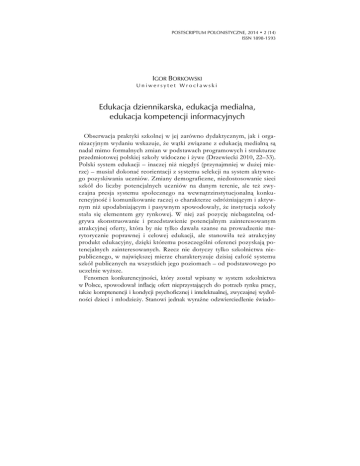 POSTSCRIPTUM POLONISTYCZNE, 2014 • 2 (14) ISSN 1898-1593 IGOR BORKOWSKI Uniwersytet Wrocławski Edukacja dziennikarska, edukacja medialna, edukacja kompetencji informacyjnych Obserwacja praktyki szkolnej w jej zarówno dydaktycznym, jak i organizacyjnym wydaniu wskazuje, że wątki związane z edukacją medialną są nadal mimo formalnych zmian w podstawach programowych i strukturze przedmiotowej polskiej szkoły widoczne i żywe (Drzewiecki 2010, 22–33). Polski system edukacji – inaczej niż niegdyś (przynajmniej w dużej mierze) – musiał dokonać reorientacji z systemu selekcji na system aktywnego pozyskiwania uczniów. Zmiany demograficzne, niedostosowanie sieci szkół do liczby potencjalnych uczniów na danym terenie, ale też zwyczajna presja systemu społecznego na wewnątrzinstytucjonalną konkurencyjność i komunikowanie raczej o charakterze odróżniającym i aktywnym niż upodabniającym i pasywnym spowodowały, że instytucja szkoły stała się elementem gry rynkowej. W niej zaś pozycję niebagatelną odgrywa skonstruowanie i przedstawienie potencjalnym zainteresowanym atrakcyjnej oferty, która by nie tylko dawała szanse na prowadzenie merytorycznie poprawnej i celowej edukacji, ale stanowiła też atrakcyjny produkt edukacyjny, dzięki któremu poszczególni oferenci pozyskają potencjalnych zainteresowanych. Rzecz nie dotyczy tylko szkolnictwa niepublicznego, w największej mierze charakteryzuje dzisiaj całość systemu szkół publicznych na wszystkich jego poziomach – od podstawowego po uczelnie wyższe. Fenomen konkurencyjności, który został wpisany w system szkolnictwa w Polsce, spowodował inflację ofert nieprzystających do potrzeb rynku pracy, także komptenencji i kondycji psychoficznej i intelektualnej, zwyczajnej wydolności dzieci i młodzieży. Stanowi jednak wyraźne odzwierciedlenie świado- 170 POSTSCRIPTUM POLONISTYCZNE, 2014 • 2 (14) mości na temat zapotrzebowań rynkowych, rozpoznawania zainteresowań, atrakcyjności zawodów, profesji, dyferencji regionów i środowisk1. Względna łatwość przygotowania i wdrożenia innowacji pedagogicznej w szkole2, operowania przez szkołę jako instytucję komunikacją na temat atrakcyjności własnej oferty dydaktycznej i wychowawczej stają się przepustką do tworzenia licznych eksperymentalnych klas, profili kształcenia, specjalności, nierzadko także formalnej gry z systemem oświaty i jego uregulowaniami wewnętrznymi. W tym właśnie upatrywałbym niezwykłej popularności w ofertach dydaktycznych szkół różnych typów i poziomów kształcenia klas odnoszących się w nazwie profilu (modułu, rozszerzonego bloku przedmiotów, innowacji) do dziennikarstwa i/lub edukacji medialnej. Bardzo dobrze ilustrują mechanizm popularności tego typu kształcenia odpowiedzi, których udzielają rodzice uczniów kandydujących do klas z dodatkowymi zajęciami o profilu dziennikarskim3. Najczęściej wskazują oni na oczekiwania uzyskania przez dziecko szybszej samodzielności i dojrzałości. Zakładają, że wykonywanie działań nawiązujących do realnych kompetencji i aktywności zawodowych dziennikarzy pozwoli lepiej wytrenować odwagę, bezkompromisowość, pewność siebie, podniesie samoocenę i nauczy śmiałości w kontaktach z otoczeniem. Dla wielu jest to także droga do pewnego rodzaju nobilitacji: klasa „dziennikarska” daje swoistą przewagę, bardzo wyraźnie rodzice łączą naukę w takiej klasie z pewnymi forami ze strony nauczycieli, gdyż wciąż pokutuje w nich – wdrukowane przez działające autoreferencjalnie media – przekonanie o rzeczywistej i skutecznie realizowanej Rzecz wymagałaby szerszego namysłu; raport dotyczący społecznej hierarchii prestiżu zawodów w Polsce przygotowany przez CBOS w listopadzie 2013 r. wskazywał, że największym poważaniem cieszą się: strażacy, profesorowie uniwersytetu, robotnicy wykwalifikowani (murarz, tokarz), górnicy, inżynierowie, pielęgniarki; moje uwagi nie odnoszą się, rzecz jasna, do tak pojmowanej stratyfikacji, lecz do wyobrażonego konstruktu atrakcyjności edukacyjnej i zawodowej, por. http://www.cbos.pl/SPISKOM.POL/2013/K_164_13.PDF, [dostęp 30.09.2014]. 2 M. Maziarz pisze: „Zlikwidowano odrębne treści edukacji medialnej, wpleciono je w treści innych przedmiotów, jednak nie znaczy to, że realizacja edukacji medialnej jako samodzielnego przedmiotu nie jest możliwa. Zarówno dotychczasowe, jak i nowe przepisy pozwalały i pozwalają nadal na wdrażanie innowacyjnych sposobów realizacji edukacji medialnej. Innowacja pedagogiczna jest jednym z nich” (Maziarz 2012, 137). 3 Posługuję się tu własnymi doświadczeniami z rozmów z rodzicami uczniów klas szóstych, kandydatów do klasy z zajęciami z edukacji medialnej w Gimnazjum nr 2 im. Żołnierza Polskiego w Strzelinie. 1 IGOR BORKOWSKI: Edukacja dziennikarska, edukacja medialna… 171 funkcji kontrolnej środków przekazu, ich atrakcyjności, mocy sprawczej, prestiżu zawodowych dziennikarzy (wyobrażonym, nie realnym, na co wskazują liczne badania opinii publicznej wcześniej wskazane). Bardzo często wskazania rodziców tylko pośrednio lub w ogóle nie odnoszą się do potencjalnych korzyści merytorycznych dla dziecka, rodzice w zasadzie nie zauważają takich wartości nauki w klasie dziennikarskiej, jak trening form wypowiedzi ustnych i pisanych, rozwijanie zainteresowań i kompetencji humanistycznych, językowych, twórczych czy literackich. Wydaje się, że rodzice, stojąc przed koniecznością preorientacji kompetencyjnej swojego dziecka, wybierają klasę z zajęciami dziennikarskimi dlatego, by uniknąć dookreślenia uzdolnień i zainteresowań nastolatka (który nie nadaje się z racji warunków fizycznych do klasy sportowej lub z powodu niewystarczającej kompetencji lingwistycznej do nauki w klasie dwujęzycznej, a to są najliczniejsze i najpopularniejsze w gimnazjach typy klas, dających możliwość przyjmowania bez ograni