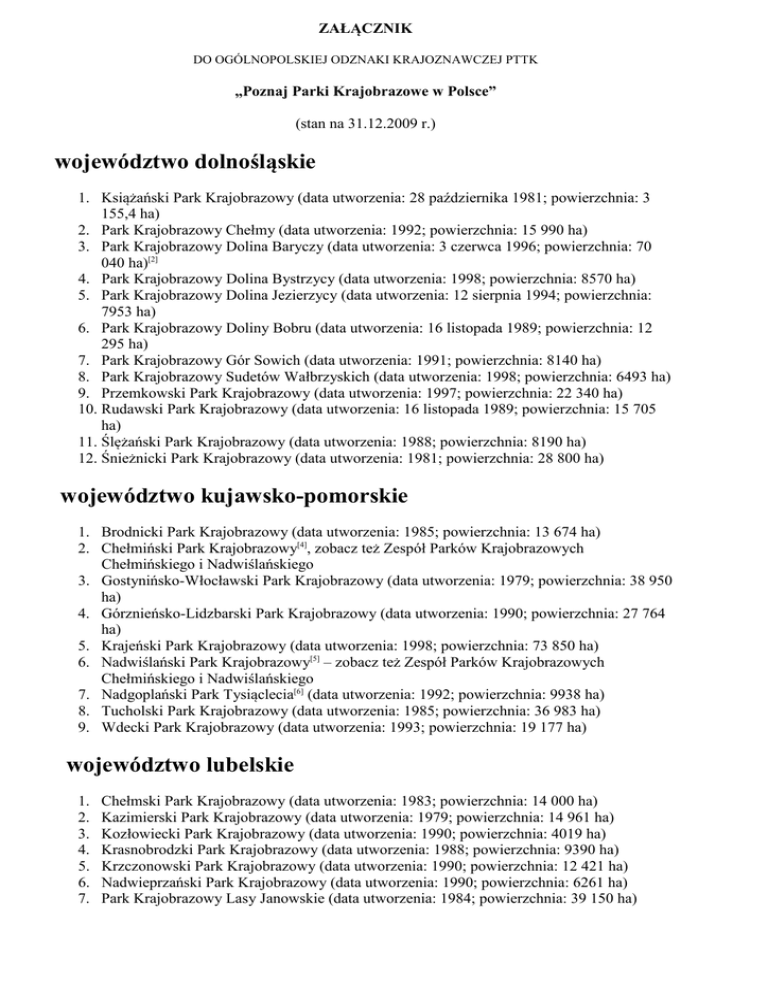 ZAŁĄCZNIK DO OGÓLNOPOLSKIEJ ODZNAKI KRAJOZNAWCZEJ PTTK „Poznaj Parki Krajobrazowe w Polsce” (stan na 31.12.2009 r.) województwo dolnośląskie 1. Książański Park Krajobrazowy (data utworzenia: 28 października 1981; powierzchnia: 3 155,4 ha) 2. Park Krajobrazowy Chełmy (data utworzenia: 1992; powierzchnia: 15 990 ha) 3. Park Krajobrazowy Dolina Baryczy (data utworzenia: 3 czerwca 1996; powierzchnia: 70 040 ha)[2] 4. Park Krajobrazowy Dolina Bystrzycy (data utworzenia: 1998; powierzchnia: 8570 ha) 5. Park Krajobrazowy Dolina Jezierzycy (data utworzenia: 12 sierpnia 1994; powierzchnia: 7953 ha) 6. Park Krajobrazowy Doliny Bobru (data utworzenia: 16 listopada 1989; powierzchnia: 12 295 ha) 7. Park Krajobrazowy Gór Sowich (data utworzenia: 1991; powierzchnia: 8140 ha) 8. Park Krajobrazowy Sudetów Wałbrzyskich (data utworzenia: 1998; powierzchnia: 6493 ha) 9. Przemkowski Park Krajobrazowy (data utworzenia: 1997; powierzchnia: 22 340 ha) 10. Rudawski Park Krajobrazowy (data utworzenia: 16 listopada 1989; powierzchnia: 15 705 ha) 11. Ślężański Park Krajobrazowy (data utworzenia: 1988; powierzchnia: 8190 ha) 12. Śnieżnicki Park Krajobrazowy (data utworzenia: 1981; powierzchnia: 28 800 ha) województwo kujawsko-pomorskie 1. Brodnicki Park Krajobrazowy (data utworzenia: 1985; powierzchnia: 13 674 ha) 2. Chełmiński Park Krajobrazowy[4], zobacz też Zespół Parków Krajobrazowych Chełmińskiego i Nadwiślańskiego 3. Gostynińsko-Włocławski Park Krajobrazowy (data utworzenia: 1979; powierzchnia: 38 950 ha) 4. Górznieńsko-Lidzbarski Park Krajobrazowy (data utworzenia: 1990; powierzchnia: 27 764 ha) 5. Krajeński Park Krajobrazowy (data utworzenia: 1998; powierzchnia: 73 850 ha) 6. Nadwiślański Park Krajobrazowy[5] – zobacz też Zespół Parków Krajobrazowych Chełmińskiego i Nadwiślańskiego 7. Nadgoplański Park Tysiąclecia[6] (data utworzenia: 1992; powierzchnia: 9938 ha) 8. Tucholski Park Krajobrazowy (data utworzenia: 1985; powierzchnia: 36 983 ha) 9. Wdecki Park Krajobrazowy (data utworzenia: 1993; powierzchnia: 19 177 ha) województwo lubelskie 1. 2. 3. 4. 5. 6. 7. Chełmski Park Krajobrazowy (data utworzenia: 1983; powierzchnia: 14 000 ha) Kazimierski Park Krajobrazowy (data utworzenia: 1979; powierzchnia: 14 961 ha) Kozłowiecki Park Krajobrazowy (data utworzenia: 1990; powierzchnia: 4019 ha) Krasnobrodzki Park Krajobrazowy (data utworzenia: 1988; powierzchnia: 9390 ha) Krzczonowski Park Krajobrazowy (data utworzenia: 1990; powierzchnia: 12 421 ha) Nadwieprzański Park Krajobrazowy (data utworzenia: 1990; powierzchnia: 6261 ha) Park Krajobrazowy Lasy Janowskie (data utworzenia: 1984; powierzchnia: 39 150 ha) 8. Park Krajobrazowy Podlaski Przełom Bugu (data utworzenia: 1994; powierzchnia: 30 904 ha) 9. Park Krajobrazowy Pojezierze Łęczyńskie (data utworzenia: 1990; powierzchnia: 11 816 ha) 10. Park Krajobrazowy Puszczy Solskiej (data utworzenia: 1988; powierzchnia: 28 978 ha) 11. Poleski Park Krajobrazowy (data utworzenia: 1983; powierzchnia: 5113 ha) 12. Południoworoztoczański Park Krajobrazowy (data utworzenia: 1989; powierzchnia: 20 256 ha) 13. Skierbieszowski Park Krajobrazowy (data utworzenia: 1995; powierzchnia: 35 488 ha) 14. Sobiborski Park Krajobrazowy (data utworzenia: 1983; powierzchnia: 10 000 ha) 15. Strzelecki Park Krajobrazowy (data utworzenia: 1983; powierzchnia: 11 117 ha) 16. Szczebrzeszyński Park Krajobrazowy (data utworzenia: 1991; powierzchnia: 20 209 ha) 17. Wrzelowiecki Park Krajobrazowy (data utworzenia: 1990; powierzchnia: 4990 ha) województwo lubuskie 1. Barlinecko-Gorzowski Park Krajobrazowy (data utworzenia: 1991; powierzchnia: 23 286 ha) 2. Krzesiński Park Krajobrazowy (data utworzenia: 1998; powierzchnia: 8546 ha)[7] 3. Gryżyński Park Krajobrazowy (data utworzenia: 1996; powierzchnia: 2755 ha) 4. Łagowski Park Krajobrazowy (data utworzenia: 1985; powierzchnia: 4929 ha) 5. Park Krajobrazowy Łuk Mużakowa (data utworzenia: 2001; powierzchnia: 18 200 ha)[8] 6. Pszczewski Park Krajobrazowy (data utworzenia: 1986; powierzchnia: 12 220 ha) 7. Przemęcki Park Krajobrazowy (data utworzenia: 1991; powierzchnia: 21 450 ha) 8. Park Krajobrazowy Ujście Warty (data utworzenia: 1996; powierzchnia: 20 532 ha) województwo łódzkie 1. Bolimowski Park Krajobrazowy (data utworzenia: 1986; powierzchnia: 23 130 ha) 2. Park Krajobrazowy Międzyrzecza Warty i Widawki (data utworzenia: 1989; powierzchnia: 25 330 ha) 3. Park Krajobrazowy Wzniesień Łódzkich (data utworzenia: 1996; powierzchnia: 10 747 ha) 4. Sulejowski Park Krajobrazowy (data utworzenia: 1994; powierzchnia: 17 444 ha) 5. Załęczański Park Krajobrazowy (data utworzenia: 1978; powierzchnia: 14 810 ha) 6. Spalski Park Krajobrazowy (data utworzenia: 1995; powierzchnia: 12 875 ha) 7. Przedborski Park Krajobrazowy (data utworzenia: 1988; powierzchnia: 16 640 ha) województwo małopolskie 1. Bielańsko-Tyniecki Park Krajobrazowy (data utworzenia: 1981; powierzchnia: 6502 ha) 2. Ciężkowicko-Rożnowski Park Krajobrazowy (data utworzenia: 1995; powierzchnia: 21 130 ha) 3. Dłubniański Park Krajobrazowy (data utworzenia: 1981; powierzchnia: 9924 ha) 4. Park Krajobrazowy Dolinki Krakowskie (data utworzenia: 1980; powierzchnia: 19 737 ha) 5. Park Krajobrazowy Pasma Brzanki (data utworzenia: 1995; powierzchnia: 18 867 ha) 6. Popradzki Park Krajobrazowy (data utworzenia: 1987; powierzchnia: 54 393 ha) 7. Rudniański Park Krajobrazowy (data utworzenia: 1981; powierzchnia: 5560 ha) 8. Tenczyński Park Krajobrazowy (data utworzenia: 1980; powierzchnia: 12 582 ha) 9. Wiśnicko-Lipnicki Park Krajobrazowy (data utworzenia: 1997; powierzchnia: 14 311 ha) 10. Park Krajobrazowy Orlich Gniazd (data utworzenia: 1980; powierzchnia: 59 731 ha) 11. Park Krajobrazowy Beskidu Małego (data utworzenia: 1998; powierzchnia: 25 770 ha) województwo mazowieckie 1. 2. 3. 4. 5. 6. 7. 8. 9. Bolimowski Park Krajobrazowy (data utworzenia: 1986; powierzchnia: 23 130 ha) Brudzeński Park Krajobrazowy (dat