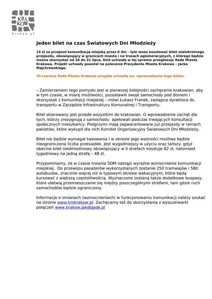 Jeden bilet na czas Światowych Dni Młodzieży 15 zł za przejazd komunikacją miejską przez 6 dni – tyle może kosztować bilet wielokrotnego przejazdu, obowiązujący w granicach miasta i na trasach aglomeracyjnych, z którego będzie można skorzystać od 26 do 31 lipca. Dziś uchwałę w tej sprawie przegłosuje Rada Miasta Krakowa. Projekt uchwały powstał na polecenie Prezydenta Miasta Krakowa – Jacka Majchrowskiego. 29 czerwca Rada Miasta Krakowa przyjęła uchwałę ws. wprowadzenie tego biletu. – Zamierzeniem tego pomysłu jest w pierwszej kolejności zachęcenie krakowian, aby w tym czasie, w miarę możliwości, pozostawili swoje samochody pod domem i skorzystali z komunikacji miejskiej – mówi Łukasz Franek, zastępca dyrektora ds. transportu w Zarządzie Infrastruktury Komunalnej i Transportu. Bilet skierowany jest przede wszystkim do krakowian. O wprowadzenie zachęt dla tych, którzy zrezygnują z samochodu apelowali podczas trwających konsultacji społecznych mieszkańcy. Pielgrzymi mają zagwarantowane już przejazdy w ramach pakietów, które wykupił dla nich Komitet Organizacyjny Światowych Dni Młodzieży. Bilet nie będzie wymagał kasowania i w okresie jego ważności możliwa będzie nieograniczona liczba przesiadek. Jest wygodniejszy w użyciu oraz tańszy, gdyż obecnie bilet siedmiodniowy obowiązujący w II strefach kosztuje 62 zł, natomiast tygodniowy na jedną strefę – 48 zł. Przypominamy, że w czasie trwania ŚDM nastąpi wyraźne wzmocnienie komunikacji miejskiej. Do przewozu pasażerów wykorzystanych zostanie 250 tramwajów i 580 autobusów, znacznie więcej niż w typowym okresie wakacyjnym, które będą kursować z większą częstotliwością. Wyznaczone zostaną także dodatkowe buspasy, które ułatwią przemieszczanie się między poszczególnymi strefami, tam gdzie ruch samochodów będzie ograniczony. Informacje o zmianach (wzmocnieniach) w funkcjonowaniu komunikacji należy szukać na stronie www.kmkrakow.pl. Zachęcamy też do skorzystania z wyszukiwarki połączeń www.krakow.jakdojade.pl Powered by TCPDF (www.tcpdf.org)