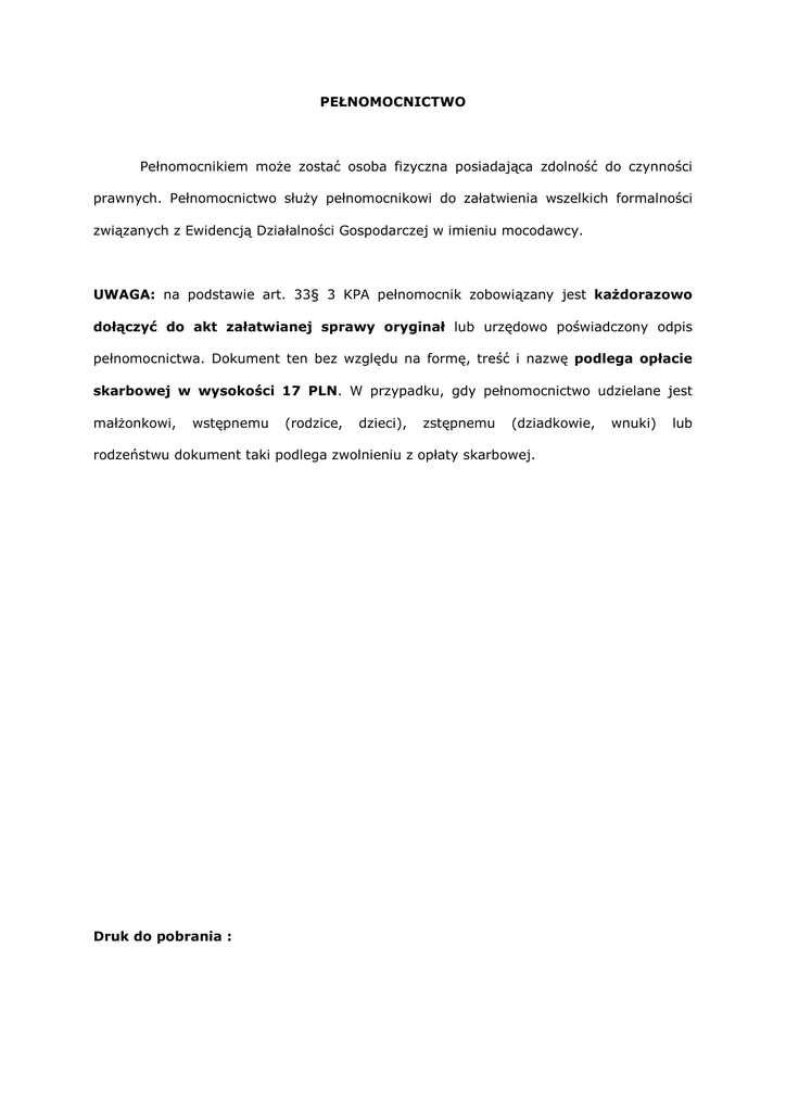 PEŁNOMOCNICTWO Pełnomocnikiem moŜe zostać osoba fizyczna posiadająca zdolność do czynności prawnych. Pełnomocnictwo słuŜy pełnomocnikowi do załatwienia wszelkich formalności związanych z Ewidencją Działalności Gospodarczej w imieniu mocodawcy. UWAGA: na podstawie art. 33§ 3 KPA pełnomocnik zobowiązany jest kaŜdorazowo dołączyć do akt załatwianej sprawy oryginał lub urzędowo poświadczony odpis pełnomocnictwa. Dokument ten bez względu na formę, treść i nazwę podlega opłacie skarbowej w wysokości 17 PLN. W przypadku, gdy pełnomocnictwo udzielane jest małŜonkowi, wstępnemu (rodzice, dzieci), zstępnemu (dziadkowie, rodzeństwu dokument taki podlega zwolnieniu z opłaty skarbowej. Druk do pobrania : wnuki) lub Trzebinia, dnia ……………………………..….. PEŁNOMOCNICTWO Ja niŜej podpisany/a ………………………………………., zamieszkały/a w …............................ ……………………………………………………………………………………………………………………………………………. legitymujący/a się dowodem osobistym nr ……………………….…………………….oświadczam, Ŝe ustanawiam swoim pełnomocnikiem (małŜonek, wstępny, zstępny, rodzeństwo, inna osoba*) zamieszkałego/ą w ……………………………………………………………………………..…………………, ……………………………………………………………………………………………………………………………………………. legitymującego/ą się dowodem osobistym nr …………………………, do reprezentowania mnie przed wszelkimi urzędami, organami administracji rządowej i samorządowej, w sprawach związanych z prowadzeniem działalności gospodarczej, a w szczególności do załatwienia w organie ewidencyjnym spraw związanych z dokonaniem wpisu do ewidencji działalności gospodarczej, późniejszych zmian we wpisie, aktualności wpisu, potwierdzenia informacji o zawieszeniu lub wznowieniu wykonywania działalności gospodarczej oraz o wykreśleniu wpisu z przedmiotowej działalności*. ……………………………………..……………….. (podpis) * odpowiednie podkreślić