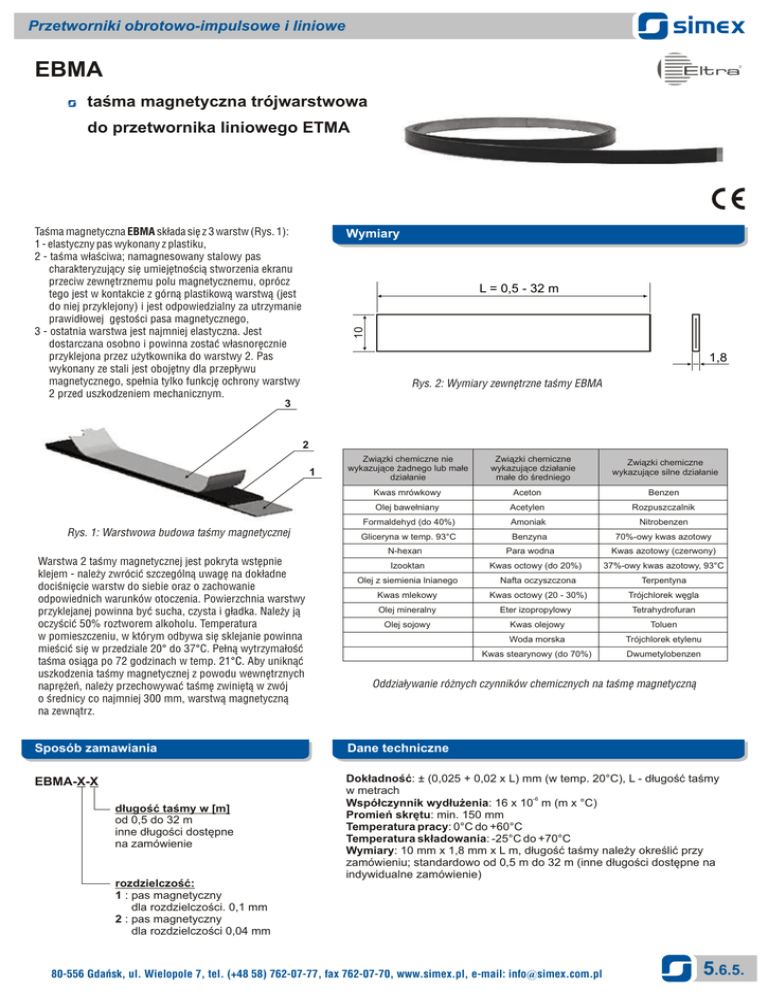 Przetworniki obrotowo-impulsowe i liniowe EBMA taœma magnetyczna trójwarstwowa do przetwornika liniowego ETMA Taœma magnetyczna EBMA sk³ada siê z 3 warstw (Rys. 1): 1 - elastyczny pas wykonany z plastiku, 2 - taœma w³aœciwa; namagnesowany stalowy pas charakteryzuj¹cy siê umiejêtnoœci¹ stworzenia ekranu przeciw zewnêtrznemu polu magnetycznemu, oprócz tego jest w kontakcie z górn¹ plastikow¹ warstw¹ (jest do niej przyklejony) i jest odpowiedzialny za utrzymanie prawid³owej gêstoœci pasa magnetycznego, 3 - ostatnia warstwa jest najmniej elastyczna. Jest dostarczana osobno i powinna zostaæ w³asnorêcznie przyklejona przez u¿ytkownika do warstwy 2. Pas wykonany ze stali jest obojêtny dla przep³ywu magnetycznego, spe³nia tylko funkcjê ochrony warstwy 2 przed uszkodzeniem mechanicznym. 3 Wymiary 10 L = 0,5 - 32 m 1,8 Rys. 2: Wymiary zewnêtrzne taœmy EBMA 2 1 Rys. 1: Warstwowa budowa taœmy magnetycznej Zwi¹zki chemiczne nie wykazuj¹ce ¿adnego lub ma³e dzia³anie Zwi¹zki chemiczne wykazuj¹ce silne dzia³anie Kwas mrówkowy Aceton Benzen Rozpuszczalnik Olej bawe³niany Acetylen Formaldehyd (do 40%) Amoniak Nitrobenzen Gliceryna w temp. 93°C Benzyna 70%-owy kwas azotowy N-hexan Warstwa 2 taœmy magnetycznej jest pokryta wstêpnie klejem - nale¿y zwróciæ szczególn¹ uwagê na dok³adne dociœniêcie warstw do siebie oraz o zachowanie odpowiednich warunków otoczenia. Powierzchnia warstwy przyklejanej powinna byæ sucha, czysta i g³adka. Nale¿y j¹ oczyœciæ 50% roztworem alkoholu. Temperatura w pomieszczeniu, w którym odbywa siê sklejanie powinna mieœciæ siê w przedziale 20° do 37°C. Pe³n¹ wytrzyma³oœæ taœma osi¹ga po 72 godzinach w temp. 21°C. Aby unikn¹æ uszkodzenia taœmy magnetycznej z powodu wewnêtrznych naprê¿eñ, nale¿y przechowywaæ taœmê zwiniêt¹ w zwój o œrednicy co najmniej 300 mm, warstw¹ magnetyczn¹ na zewn¹trz. Zwi¹zki chemiczne wykazuj¹ce dzia³anie ma³e do œredniego Izooktan Para wodna Kwas octowy (do 20%) Kwas azotowy (czerwony) 37%-owy kwas azotowy, 93°C Olej z siemienia lnianego Nafta oczyszczona Terpentyna Kwas mlekowy Kwas octowy (20 - 30%) Trójchlorek wêgla Olej mineralny Eter izopropylowy Olej sojowy Kwas olejowy Tetrahydrofuran Toluen Woda morska Trójchlorek etylenu Kwas stearynowy (do 70%) Dwumetylobenzen Oddzia³ywanie ró¿nych czynników chemicznych na taœmê magnetyczn¹ Sposób zamawiania Dane techniczne EBMA-X-X Dok³adnoœæ: ± (0,025 + 0,02 x L) mm (w temp. 20°C), L - d³ugoœæ taœmy w metrach Wspó³czynnik wyd³u¿enia: 16 x 10-6 m (m x °C) Promieñ skrêtu: min. 150 mm Temperatura pracy: 0°C do +60°C Temperatura sk³adowania: -25°C do +70°C Wymiary: 10 mm x 1,8 mm x L m, d³ugoœæ taœmy nale¿y okreœliæ przy zamówieniu; standardowo od 0,5 m do 32 m (inne d³ugoœci dostêpne na indywidualne zamówienie) d³ugoœæ taœmy w [m] od 0,5 do 32 m inne d³ugoœci dostêpne na zamówienie rozdzielczoœæ: 1 : pas magnetyczny dla rozdzielczoœci. 0,1 mm 2 : pas magnetyczny dla rozdzielczoœci 0,04 mm 80-556 Gdañsk, ul. Wielopole 7, tel. (+48 58) 762-07-77, fax 762-07-70, www.simex.pl, e-mail: [email protected] 5.6.5.