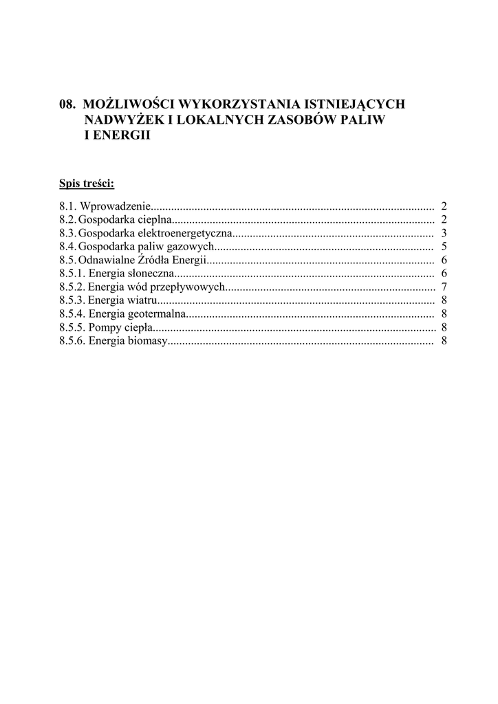 08. MOŻLIWOŚCI WYKORZYSTANIA ISTNIEJĄCYCH NADWYŻEK I LOKALNYCH ZASOBÓW PALIW I ENERGII Spis treści: 8.1. Wprowadzenie................................................................................................. 8.2. Gospodarka cieplna.......................................................................................... 8.3. Gospodarka elektroenergetyczna..................................................................... 8.4. Gospodarka paliw gazowych........................................................................... 8.5. Odnawialne Źródła Energii.............................................................................. 8.5.1. Energia słoneczna......................................................................................... 8.5.2. Energia wód przepływowych........................................................................ 8.5.3. Energia wiatru............................................................................................... 8.5.4. Energia geotermalna..................................................................................... 8.5.5. Pompy ciepła................................................................................................. 8.5.6. Energia biomasy........................................................................................... 2 2 3 5 6 6 7 8 8 8 8 AKTUALIZACJA ZAŁOŻEŃ DO PLANU ZAOPATRZENIA W CIEPŁO, ENERGIĘ ELEKTRYCZNĄ I PALIWA GAZOWE GMINY MIASTO BRZEG NA LATA 2015-2030 8.1. Wprowadzenie Rozdział ten dotyczy możliwości wykorzystania istniejących nadwyżek i lokalnych zasobów paliw i energii Gminy Miasto Brzeg, z uwzględnieniem energii elektrycznej i ciepła pozyskiwanych z konwencjonalnych, odnawialnych i niekonwencjonalnych źródeł energii. 8.2. Gospodarka cieplna Potrzeby cieplne Gminy Miasto Brzeg zaspakajane są przez: − system ciepłowniczy BPEC Sp. z o.o., − kotłownie lokalne, − indywidualne źródła energii. Miejski System Ciepłowniczy posiada duże rezerwy mocy źródeł przez co korzystnie wpływa na pewność zasilania istniejących odbiorców. Zapotrzebowanie ciepła na poziomie 41,9998 MW oraz ze zużyciem ciepła na poziomie 245140 GJ (dane za 2014 r.), w całości potrzeby cieplne związane z centralnym ogrzewaniem. BPEC Sp. z o.o. W zakresie kotłowni centralnej przy ul. Ciepłowniczej 11 wchodzącej w skład miejskiego systemu ciepłowniczego, rezerwa mocy wynosi ok.10,58 MW. Istniejące rezerwy przesyłowe mogą zostać wykorzystane do podłączenia nowych potencjalnych odbiorców ciepła. Pozostałe kotłownie gazowe miejskiego systemu ciepłowniczego również posiadają znaczne rezerwy, głównie w zakresie przygotowania ciepłej wody użytkowej. Bilans zamówionej mocy cieplnej w ostatnich latach ulega ciągłemu obniżaniu, w związku z trwającym procesem termomodernizacji budynków odbiorców oraz coraz cieplejszymi zimami. Podjęte działania w celu pozyskania nowych odbiorców powinny zrekompensować planowaną obniżkę mocy zamówionej. W przyszłości w zakresie lokalnych kotłowni i indywidualnych źródeł, należy rozważyć możliwość zaopatrzenia społeczności lokalnej w energię cieplną produkowaną w oparciu o odnawialne źródła energii. Odnawialne źródła energii niosą wysokie bezpieczeństwo energetyczne ich odbiorców a także konkurencyjność zaopatrzenia w stosunku do innych nośników energetycznych. Zaletami takich instalacji są ponadto: – wysoka sprawność urządzeń produkujących ciepło, – wysoka elastyczność dostosowania się źródła ciepła do wielkości poboru energii cieplnej przez odbiorców, – niskie nakłady robocizny w procesie produkcji ciepła, ograniczające się do dostarczenia paliwa z magazynu, usunięcia produktów spalania, nadzorowania pracy urządzeń i okresowo czynności eksploatacyjnych i konserwacyjnych. Źródła ciepła (kotłownie lokalne) ankietyzowanych jednostek organizacyjnych Gminy Miasto Brzeg oraz podmiotów gospodarczych i instytucji, zawierają rezerwy mocy, w oparciu o które ich potrzeby cieplne są zaspakajane. Na terenie Gminy Miasto Brzeg występuje niska emisja ze źródeł indywidualnych opartych na paliwach stałych (węgiel, drewno). Jej ograniczenie możliwe jest poprzez rozbudowę miejskiego systemu ciepłowniczego i zmianę paliwa na mniej emisyjne, jak choćby gaz ziemny. 2 AKTUALIZACJA ZAŁOŻEŃ DO PLANU ZAOPATRZENIA W CIEPŁO, ENERGIĘ ELEKTRYCZNĄ I PALIWA GAZOWE GMINY MIASTO BRZEG NA LATA 2015-2030 8.3. Gospodarka elektroenergetyczna System elektroenergetyczny zaspakaja potrzeby wszystkich dotychczasowych odbiorców energii elektrycznej z terenu Gminy Miasto Brzeg. W sektorze zawodowej energetyki w zakresie stacji WN/SN kV, czyli GPZ 110/30/15 kV „Hermanowice” i GPZ 110/15 kV „Pawłów”, które zasilają Gminę Miasto Brzeg w energię elektryczną, występują rezerwy mocy, które mogą być wykorzystane do podłączenia nowych odbiorców. Stacja elektroenergetyczna wysokiego napięcia GPZ Hermanowice posiada ok.30% rezerwy mocy do wykorzystania, tj. ok. 6 MW. Stacja elektroenergetyczna wysokiego napięcia GPZ Pawłów posiada ok.50% rezerwy mocy do wykorzystania, tj. ok. 10 MW. Po uwzględnieniu warunków przyłączenia (WP), na obszarze w którym leży Gmina Miasto Brzeg, na chwilę obecną nie ma istniejącej dostępnej wolnej mocy przyłączeniowej do sieci 110 kV. Planowana rozbudowa Krajowej Sieci Elektroenergetycznej (KSE) do 2019 r. nie zakłada zwiększenia dostępnej mocy w tym obszarze. Z tego tytułu, system przesyłowy Krajowej Sieci Elektroenergetycznej (KSE) będącej w dyspozycji PSE Operator S.A. wymaga rozbudowy i odbudowy potencjału o wielkości określonej w uzgodnionym z Prezesem URE Planie Rozwoju Sieci Przesyłowej PSE Operator SA na lata 2010-2025. Na liniach sieci średniego i niskiego napięcia występują rezerwy przesyłowe, które umożliwiają pokrycie wzrostu zapotrzebowania na energię elektryczną. Standardy ja
