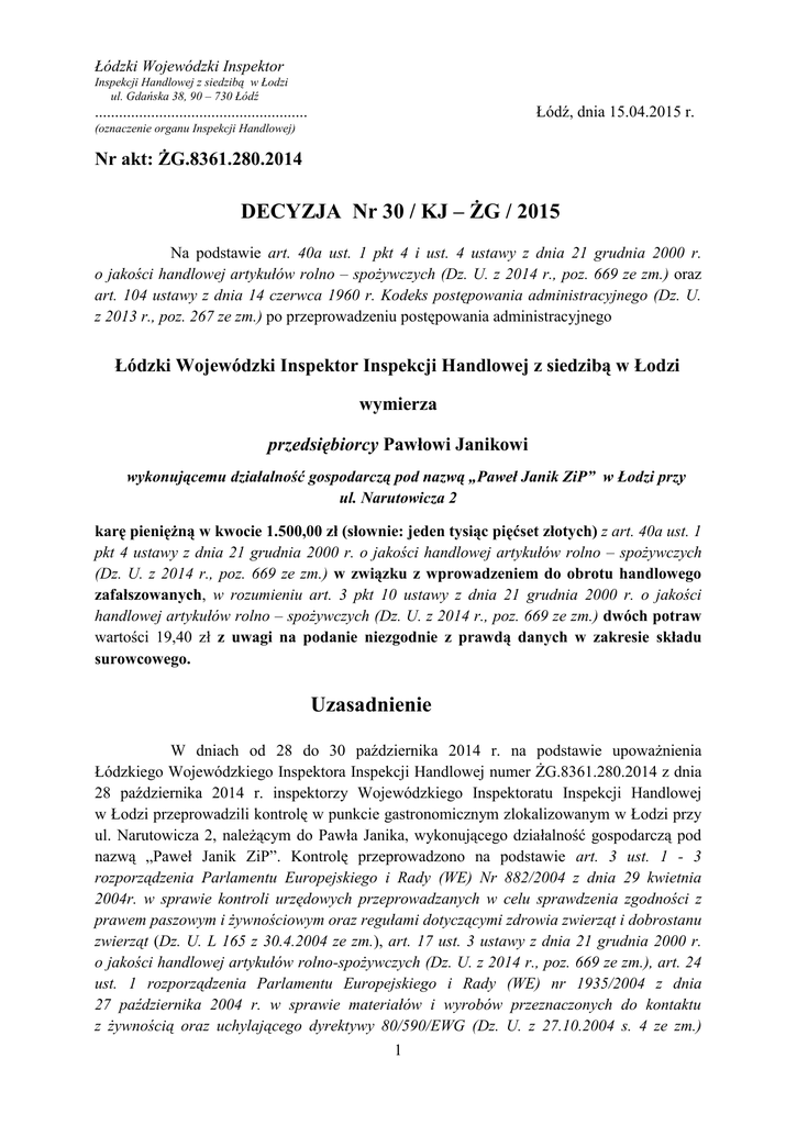 Łódzki Wojewódzki Inspektor Inspekcji Handlowej z siedzibą w Łodzi ul. Gdańska 38, 90 – 730 Łódź Łódź, dnia 15.04.2015 r. ..................................................... (oznaczenie organu Inspekcji Handlowej) Nr akt: ŻG.8361.280.2014 DECYZJA Nr 30 / KJ – ŻG / 2015 Na podstawie art. 40a ust. 1 pkt 4 i ust. 4 ustawy z dnia 21 grudnia 2000 r. o jakości handlowej artykułów rolno – spożywczych (Dz. U. z 2014 r., poz. 669 ze zm.) oraz art. 104 ustawy z dnia 14 czerwca 1960 r. Kodeks postępowania administracyjnego (Dz. U. z 2013 r., poz. 267 ze zm.) po przeprowadzeniu postępowania administracyjnego Łódzki Wojewódzki Inspektor Inspekcji Handlowej z siedzibą w Łodzi wymierza przedsiębiorcy Pawłowi Janikowi wykonującemu działalność gospodarczą pod nazwą „Paweł Janik ZiP” w Łodzi przy ul. Narutowicza 2 karę pieniężną w kwocie 1.500,00 zł (słownie: jeden tysiąc pięćset złotych) z art. 40a ust. 1 pkt 4 ustawy z dnia 21 grudnia 2000 r. o jakości handlowej artykułów rolno – spożywczych (Dz. U. z 2014 r., poz. 669 ze zm.) w związku z wprowadzeniem do obrotu handlowego zafałszowanych, w rozumieniu art. 3 pkt 10 ustawy z dnia 21 grudnia 2000 r. o jakości handlowej artykułów rolno – spożywczych (Dz. U. z 2014 r., poz. 669 ze zm.) dwóch potraw wartości 19,40 zł z uwagi na podanie niezgodnie z prawdą danych w zakresie składu surowcowego. Uzasadnienie W dniach od 28 do 30 października 2014 r. na podstawie upoważnienia Łódzkiego Wojewódzkiego Inspektora Inspekcji Handlowej numer ŻG.8361.280.2014 z dnia 28 października 2014 r. inspektorzy Wojewódzkiego Inspektoratu Inspekcji Handlowej w Łodzi przeprowadzili kontrolę w punkcie gastronomicznym zlokalizowanym w Łodzi przy ul. Narutowicza 2, należącym do Pawła Janika, wykonującego działalność gospodarczą pod nazwą „Paweł Janik ZiP”. Kontrolę przeprowadzono na podstawie art. 3 ust. 1 - 3 rozporządzenia Parlamentu Europejskiego i Rady (WE) Nr 882/2004 z dnia 29 kwietnia 2004r. w sprawie kontroli urzędowych przeprowadzanych w celu sprawdzenia zgodności z prawem paszowym i żywnościowym oraz regułami dotyczącymi zdrowia zwierząt i dobrostanu zwierząt (Dz. U. L 165 z 30.4.2004 ze zm.), art. 17 ust. 3 ustawy z dnia 21 grudnia 2000 r. o jakości handlowej artykułów rolno-spożywczych (Dz. U. z 2014 r., poz. 669 ze zm.), art. 24 ust. 1 rozporządzenia Parlamentu Europejskiego i Rady (WE) nr 1935/2004 z dnia 27 października 2004 r. w sprawie materiałów i wyrobów przeznaczonych do kontaktu z żywnością oraz uchylającego dyrektywy 80/590/EWG (Dz. U. z 27.10.2004 s. 4 ze zm.) 1 w związku z art. 3 ust. 1 pkt 6 oraz art. 3 ust. 1 pkt 1, 2 ustawy z dnia 15 grudnia 2000 r. o Inspekcji Handlowej (Dz. U. z 2014, poz. 148 ze zm.) w obecności przedsiębiorcy Pawła Janika. Celem sprawdzenia prawidłowości oznakowania wyrobów gastronomicznych oraz rzetelności przekazywanych informacji o danym produkcie, inspektorzy występując w charakterze nabywców zakupili dwie zapiekanki, deklarowane w miejscu sprzedaży (cennik) jako „Atena” (pieczarki, ser, pomidor, feta, oregano, tabasco, sos) w cenie 9,50 zł i „Cztery sery” (pieczarki, ser, ser wędzony, feta, ser pleśniowy, sos) w cenie 9,90 zł wartości łącznej 19,40 zł. Przedmiotowe zapiekanki zostały wyprodukowane na zamówienie w dniu 28 października 2014 r. przez (…) w punkcie gastronomicznym zlokalizowanym w Łodzi przy ul. Narutowicza 2, należącym do Pawła Janika, wykonującego działalność gospodarczą pod nazwą „Paweł Janik ZiP”. W trakcie kontroli stwierdzono, że na stanie punktu nie było sera feta, znajdował się natomiast ser sałatkowo-kanapkowy „Favita” wyprodukowany przez Spółdzielnię Mleczarską „MLEKOVITA” Wysokie Mazowieckie, ul. Ludowa 122. W prowadzonym postępowaniu wyjaśniającym ustalono, że przedmiotowy ser sałatkowo – kanapkowy został użyty do przygotowania zakupionych przez inspektorów zapiekanek (oświadczenie menagera … z dnia 28 października 2014 r.), a inspektorzy nie zostali o tym poinformowani, przez co zostali wprowadzeni w błąd co do charakterystyki środka spożywczego, w tym jego składu i właściwości w myśl art. 46 ust. 1 lit. a ustawy z dnia 25 sierpnia 2006 r. o bezpieczeństwie żywności i żywienia (Dz. U. z 2010r. nr 136 poz. 914 ze zm.), zwanej dalej „ustawą o bezpieczeństwie żywności i żywienia” przywołanego w art. 6 ust. 2 ustawy z dnia 21 grudnia 2000 r. o jakości handlowej artykułów rolno – spożywczych (Dz. U. z 2014 r. poz. 669 ze zm.), zwanej dalej „ustawą o jakości [od 13 grudnia 2014 r. w rozumieniu art. 7 ust. 1 lit. a rozporządzenia Parlamentu Europejskiego i Rady (UE) nr 1169/2011 z dnia 25 października 2011 r. w sprawie przekazywania konsumentom informacji na temat żywności, zmiany rozporządzeń Parlamentu Europejskiego i Rady (WE) nr 1924/2006 i (WE) nr 1925/2006 oraz uchylenia dyrektywy Komisji 87/250/EWG, dyrektywy Rady 90/496/EWG, dyrektywy Komisji 1999/10/WE, dyrektywy 2000/13/WE Parlamentu Europejskiego i Rady, dyrektyw Komisji 2002/67/WE i 2008/5/WE oraz rozporządzenia Komisji (WE) nr 608/2004 (Dz. U. UE. L 304 z 22.11.2011 ze zm.) zwanego dalej „rozporządzeniem 1169/2011”]. Strona nie przedłożyła żadnych dokumentów świadczących o zakupie sera feta. Na podstawie okazanych dokumentów ustalono, że ostatniego zakupu sera sałatkowo-kanapkowego „Favita” strona dokonała w ilości 6 sztuk w dniu 22 października 2014 r. za fakturą VAT numer 0/0(003)0049/295047 (049-467327) w hali nr 3 zlokalizowanej w Łodzi przy ul. Kasprzaka 8, należącej do „Makro Cash & Carry Polska” S.A. z siedzibą w Warszawie. Stwierdzona zatem w toku kontroli nieprawidłowość w zakresie oznakowania zakupionych przez inspektorów zapiekanek o nazwach „Atena” (pieczarki, ser, pomidor, feta, oregano, tabasco, sos) w cenie 9,50 zł i „Cztery sery” (pieczarki, ser, ser w