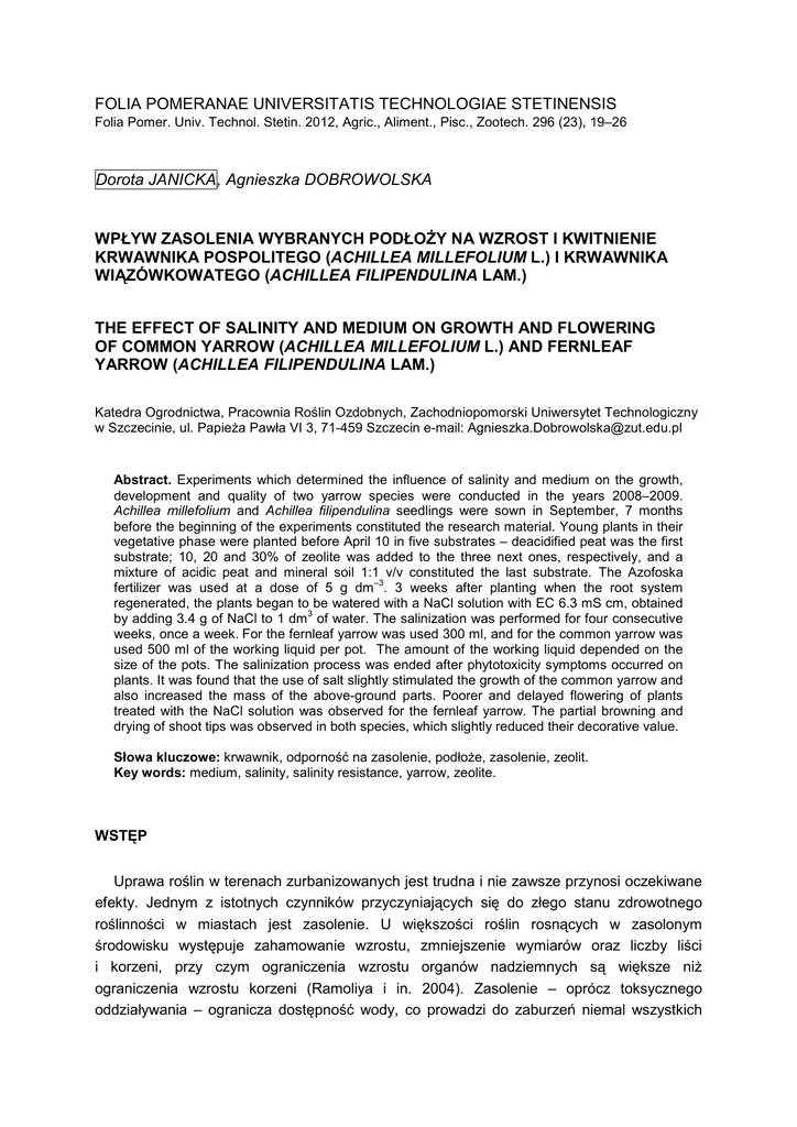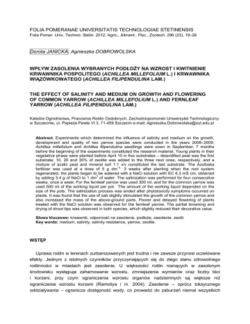 FOLIA POMERANAE UNIVERSITATIS TECHNOLOGIAE STETINENSIS Folia Pomer. Univ. Technol. Stetin. 2012, Agric., Aliment., Pisc., Zootech. 296 (23), 19–26 Dorota JANICKA, Agnieszka DOBROWOLSKA WPŁYW ZASOLENIA WYBRANYCH PODŁOśY NA WZROST I KWITNIENIE KRWAWNIKA POSPOLITEGO (ACHILLEA MILLEFOLIUM L.) I KRWAWNIKA WIĄZÓWKOWATEGO (ACHILLEA FILIPENDULINA LAM.) THE EFFECT OF SALINITY AND MEDIUM ON GROWTH AND FLOWERING OF COMMON YARROW (ACHILLEA MILLEFOLIUM L.) AND FERNLEAF YARROW (ACHILLEA FILIPENDULINA LAM.) Katedra Ogrodnictwa, Pracownia Roślin Ozdobnych, Zachodniopomorski Uniwersytet Technologiczny w Szczecinie, ul. PapieŜa Pawła VI 3, 71-459 Szczecin e-mail: [email protected] Abstract. Experiments which determined the influence of salinity and medium on the growth, development and quality of two yarrow species were conducted in the years 2008–2009. Achillea millefolium and Achillea filipendulina seedlings were sown in September, 7 months before the beginning of the experiments constituted the research material. Young plants in their vegetative phase were planted before April 10 in five substrates – deacidified peat was the first substrate; 10, 20 and 30% of zeolite was added to the three next ones, respectively, and a mixture of acidic peat and mineral soil 1:1 v/v constituted the last substrate. The Azofoska –3 fertilizer was used at a dose of 5 g dm . 3 weeks after planting when the root system regenerated, the plants began to be watered with a NaCl solution with EC 6.3 mS cm, obtained 3 by adding 3.4 g of NaCl to 1 dm of water. The salinization was performed for four consecutive weeks, once a week. For the fernleaf yarrow was used 300 ml, and for the common yarrow was used 500 ml of the working liquid per pot. The amount of the working liquid depended on the size of the pots. The salinization process was ended after phytotoxicity symptoms occurred on plants. It was found that the use of salt slightly stimulated the growth of the common yarrow and also increased the mass of the above-ground parts. Poorer and delayed flowering of plants treated with the NaCl solution was observed for the fernleaf yarrow. The partial browning and drying of shoot tips was observed in both species, which slightly reduced their decorative value. Słowa kluczowe: krwawnik, odporność na zasolenie, podłoŜe, zasolenie, zeolit. Key words: medium, salinity, salinity resistance, yarrow, zeolite. WSTĘP Uprawa roślin w terenach zurbanizowanych jest trudna i nie zawsze przynosi oczekiwane efekty. Jednym z istotnych czynników przyczyniających się do złego stanu zdrowotnego roślinności w miastach jest zasolenie. U większości roślin rosnących w zasolonym środowisku występuje zahamowanie wzrostu, zmniejszenie wymiarów oraz liczby liści i korzeni, przy czym ograniczenia wzrostu organów nadziemnych są większe niŜ ograniczenia wzrostu korzeni (Ramoliya i in. 2004). Zasolenie – oprócz toksycznego oddziaływania – ogranicza dostępność wody, co prowadzi do zaburzeń niemal wszystkich 20 D. Janicka i A. Dobrowolska procesów Ŝyciowych, w tym fotosyntezy (Starck 1980). Mała odporność roślin na zasolenie często stanowi problem przy opracowywaniu technologii produkcji nowych gatunków i odmian roślin ozdobnych, dlatego ciągle poszukuje się nowych genotypów roślin, które mogłyby być wykorzystane w rekultywacji terenów o zwiększonym zasoleniu (Wróbel i in. 2006). Niektóre z podłoŜy ogrodniczych odznaczają się duŜymi właściwościami sorpcyjnymi, pochłaniając i wiąŜąc niektóre jony i oddając je stopniowo roślinom. Do podłoŜy takich naleŜą zeolity z grupy glinokrzemianów, które dzięki swoim właściwościom mogą pochłaniać m.in. metale cięŜkie, pierwiastki promieniotwórcze i niektóre jony balastowe (Campbell i Davies 1997). Celem przeprowadzonych badań było sprawdzenie tolerancji dwóch gatunków krwawnika (Achillea millefolium L. i Achillea filipendulina Lam.) na podwyŜszone stęŜenie soli NaCl, a takŜe przydatności kilku podłoŜy do uprawy roślin przy zwiększonym zasoleniu. Do badań wybrano rośliny łatwe w uprawie oraz o niewielkich wymaganiach siedliskowych. MATERIAŁ I METODY Doświadczenia, w których oceniano wpływ zasolenia oraz podłoŜa na wzrost, rozwój oraz jakość roślin dwóch gatunków krwawnika, przeprowadzono w Katedrze Ogrodnictwa, Pracowni Roślin Ozdobnych ZUT w Szczecinie w latach 2008–2009. Materiał roślinny stanowiła rozsada krwawnika pospolitego i krwawnika wiązówkowatego, których nasiona wysiewano we wrześniu (siedem miesięcy przed załoŜeniem doświadczeń). W pełni wykształcone, niekwitnące rośliny posadzono w pierwszej dekadzie kwietnia do pięciu podłoŜy. Pierwsze podłoŜe stanowił torf odkwaszony, trzy kolejne podłoŜa stanowił torf z dodatkiem zeolitu w ilości 10, 20 i 30%, zaś ostatnie podłoŜe było mieszanką torfu kwaśnego i ziemi mineralnej 1:1 v/v. Jako nawóz zastosowano Azofoskę w dawce 5 g . dm–3. Przed załoŜeniem doświadczenia zmierzono EC oraz odczyn wszystkich zastosowanych podłoŜy. Do sadzenia uŜyto dwóch rodzajów doniczek: ø 14 cm dla krwawnika wiązówkowatego oraz ø 16 cm dla krwawnika pospolitego. Po zregenerowaniu przez rośliny systemu korzeniowego oraz podjęciu przez nie wzrostu (około 3 tygodnie po posadzeniu) rozpoczęto podlewanie roztworem soli NaCl o przewodności elektrycznej 6,3 mS . cm–1, co uzyskano dodając 3,3 g NaCl na 1 dm3 wody. Zasalanie prowadzono przez cztery kolejne tygodnie, raz w tygodniu, stosując odpowiednio: dla krwawnika wiązówkowatego – 300 ml, a dla krwawnika pospolitego 500 ml cieczy roboczej na doniczkę. Ilość cieczy roboczej podawanej roślinie zaleŜała od wielkości doniczki. Kontrolę stanowiły rośliny podlewane wodą destylowaną w takich samych dawkach. Doświadczenia załoŜono jako dwuczynnikowe w pięciu powtórzeniach, po trzy rośliny w powtórzeniu, pierwszy czynnik stanowiło podłoŜe, drugi – z